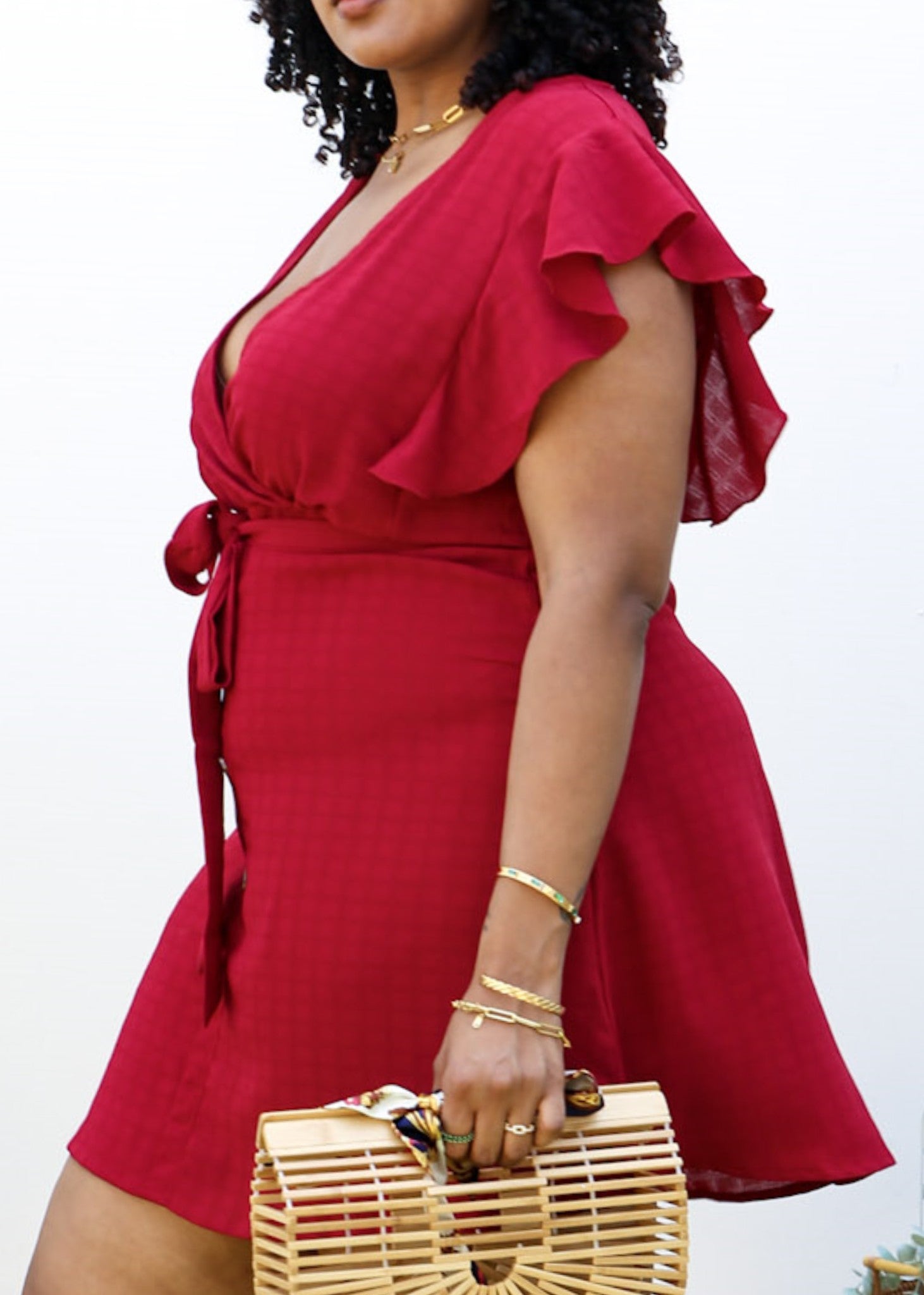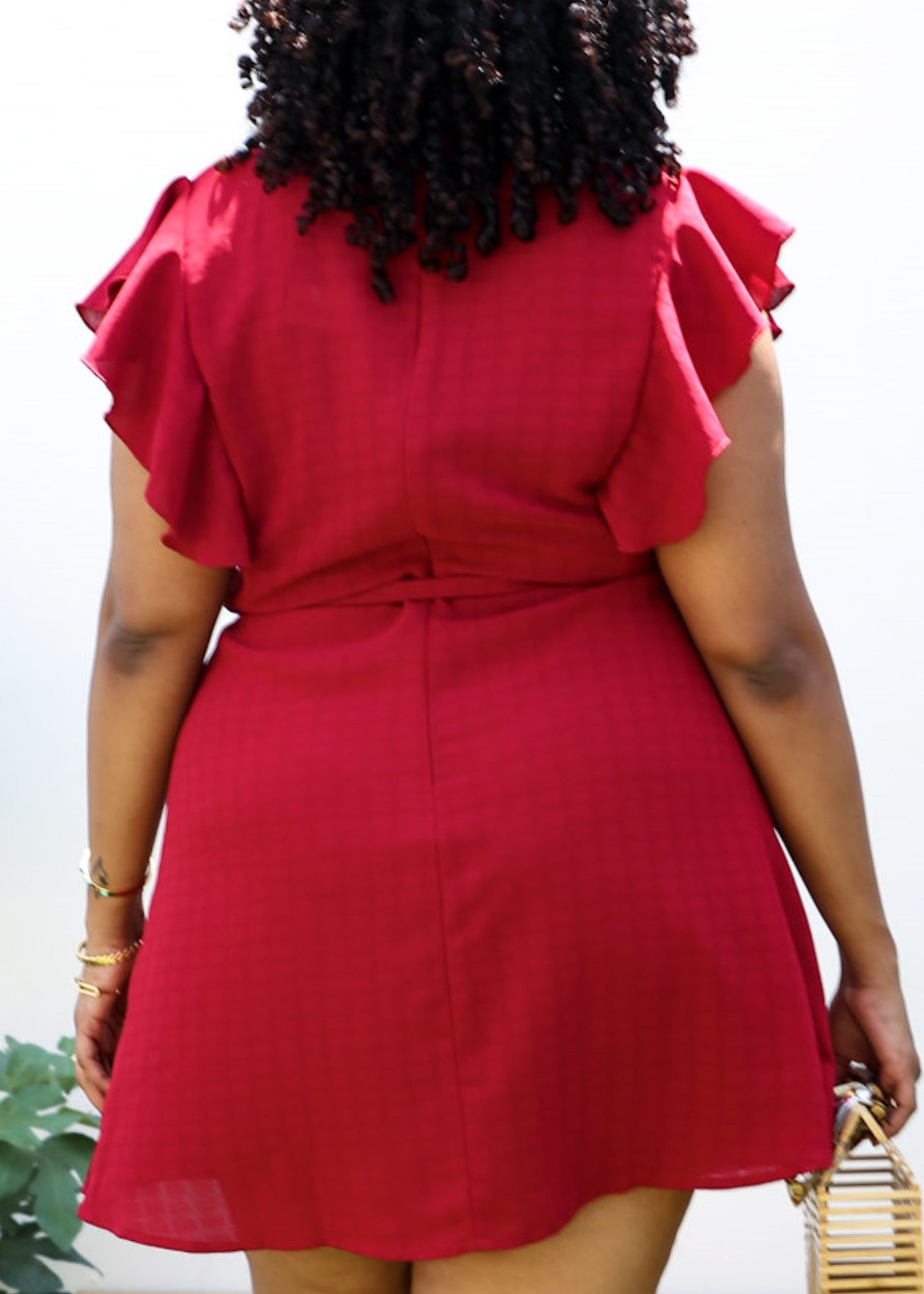 The Anna-Kaci plus size swing dress is a versatile and stylish addition to your wardrobe. Designed with a V-neckline and shoulder sleeves, this dress offers a flattering fit. The ruffle sleeves add a playful touch, while the tied belt waist accentuates your curves. The faux button skirt detail adds a chic element to this solid-colored dress. Dress it up with heels and statement accessories for a glam look.