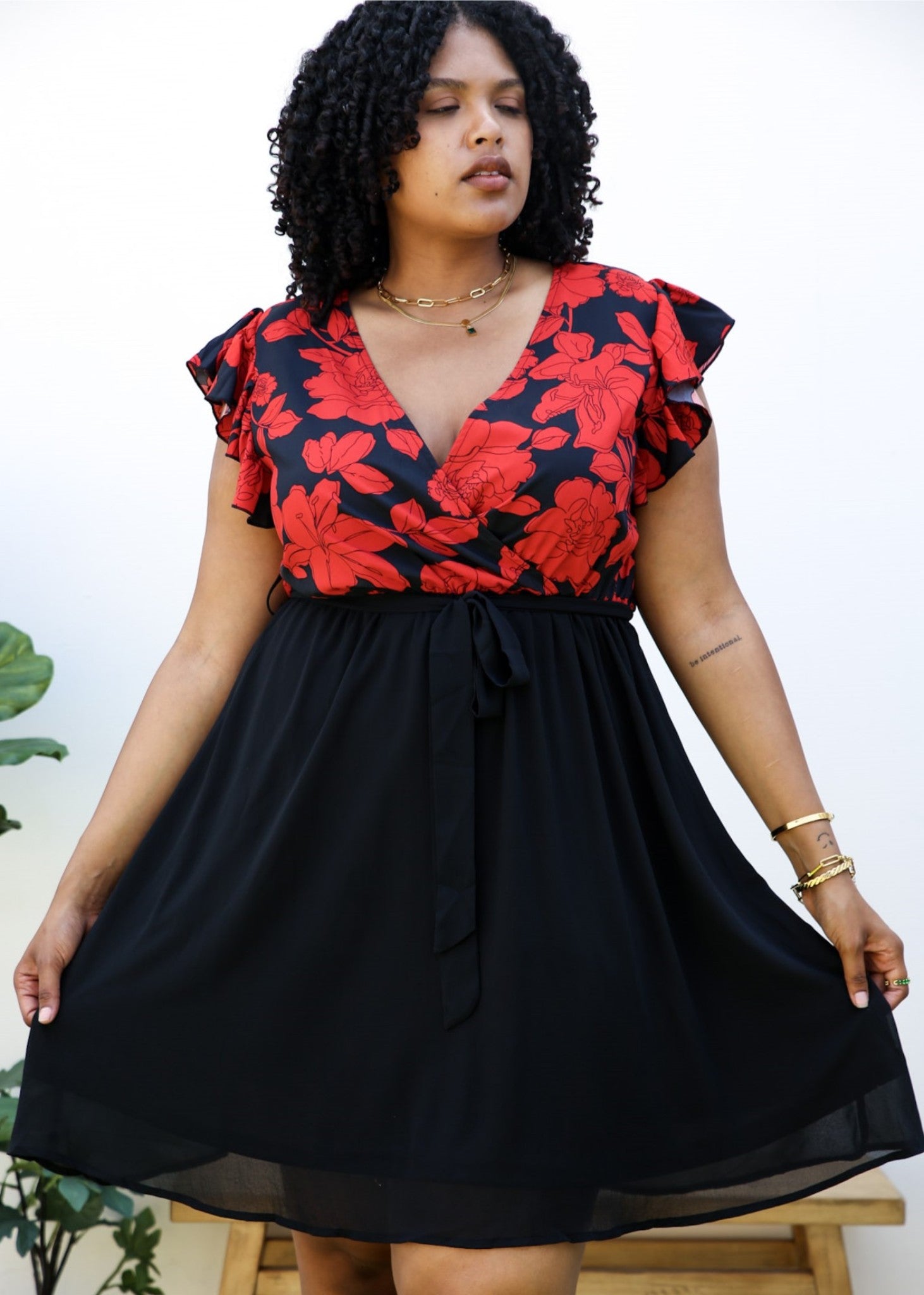 The Anna-Kaci plus size maxi dress combines elegance and comfort effortlessly. Crafted with a V-neckline and ruffle shoulder sleeves, this front v wrap dress offers a flattering and versatile look. The black skirt adds a pop of style which extends to the knee. Complete the ensemble with strappy sandals and statement jewelry for a glamorous outfit.