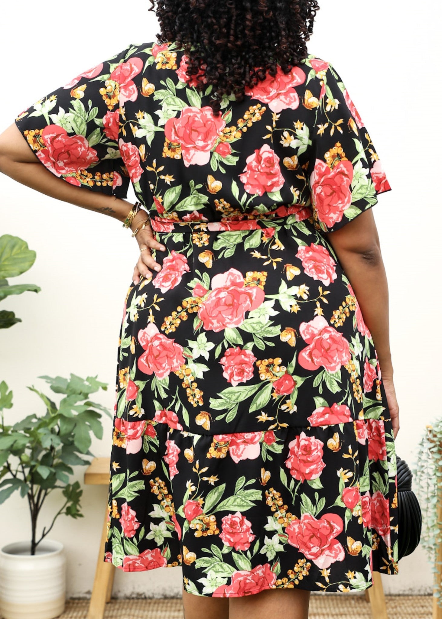 Plus Size Tropical Floral Print Midi Dress with Tied Belt Waist
