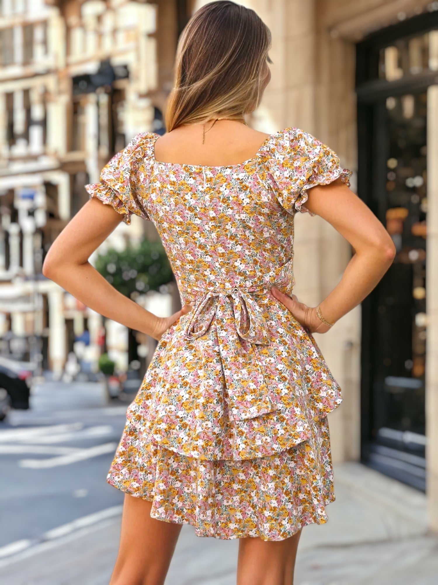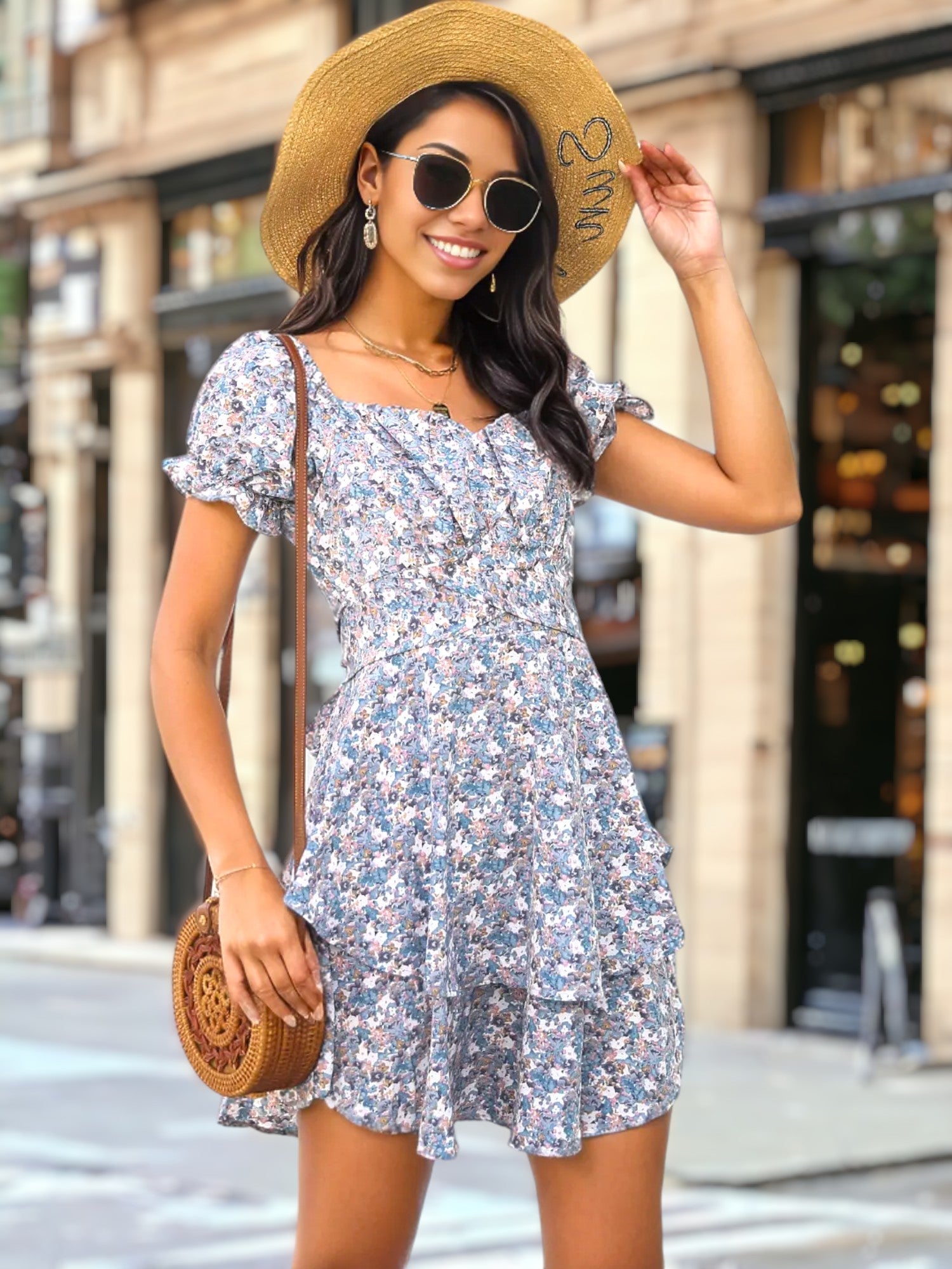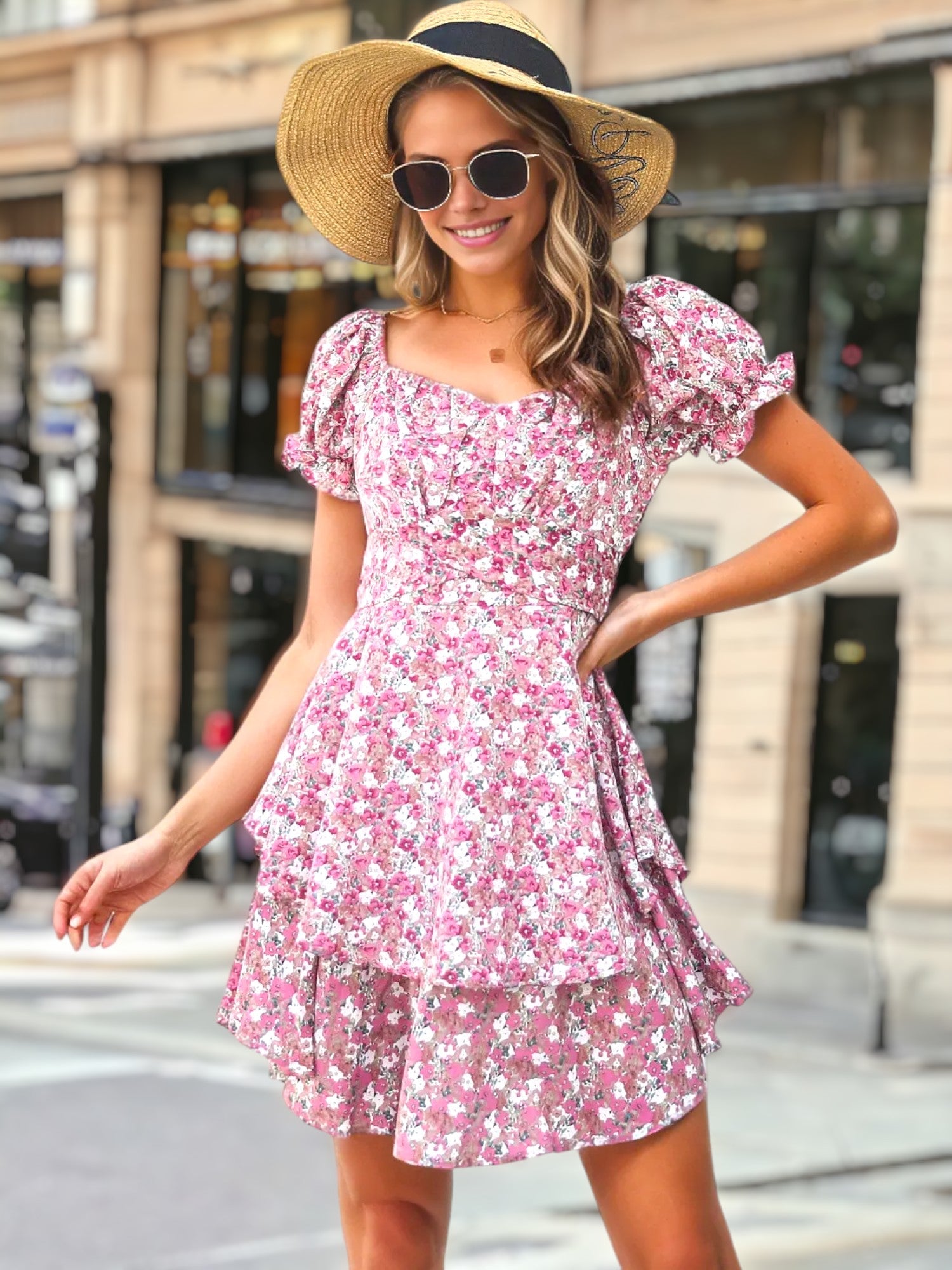 The Anna-Kaci dress is detailed with a cute tie back detail. Features a floral print, sweetheart neck line, puff sleeves, flowy skirt, tiered design, and above knee length. Pair it with a purse and chunky sneakers for a beautiful look.
