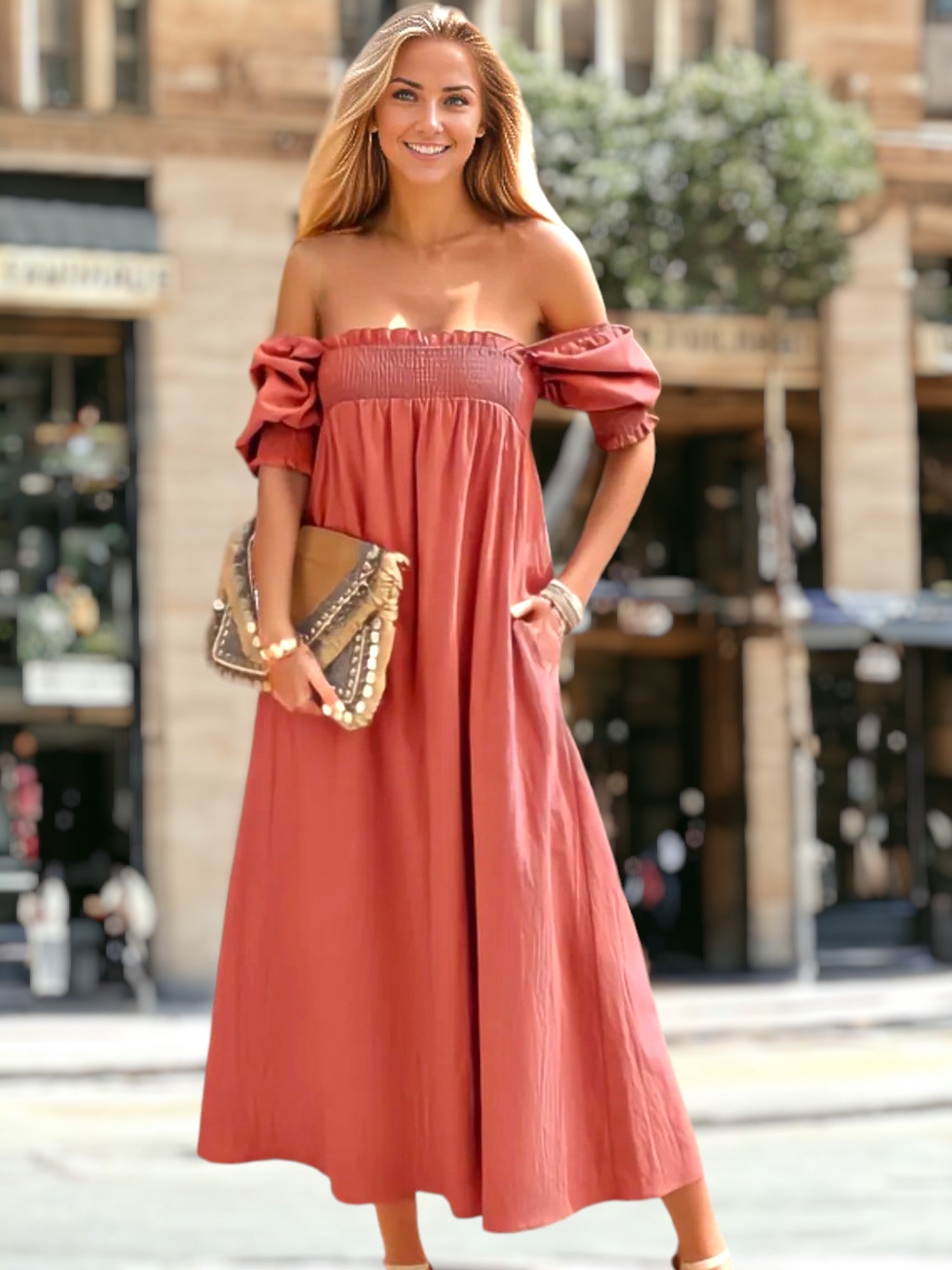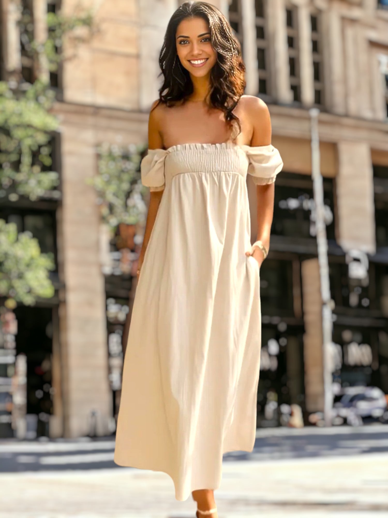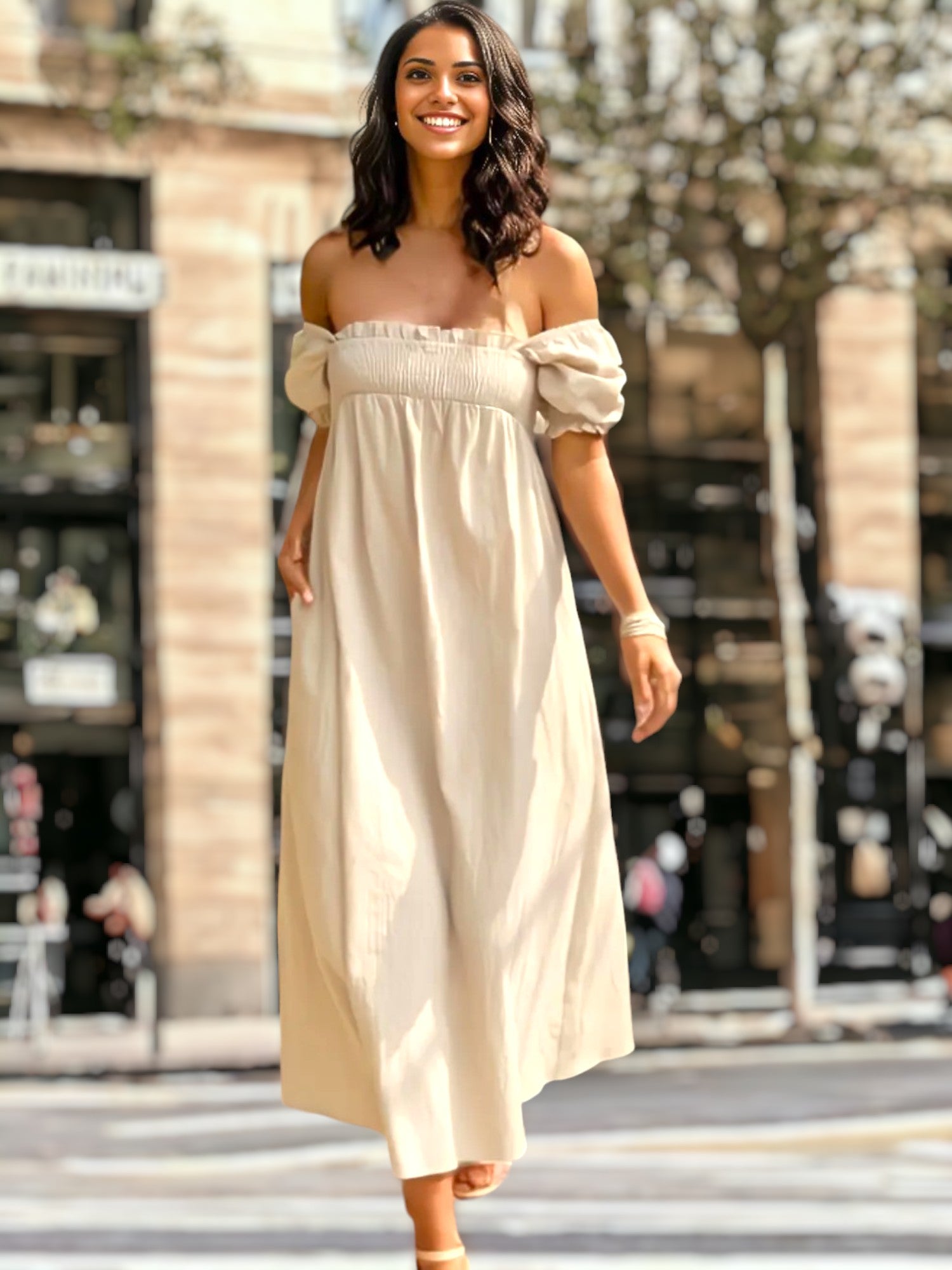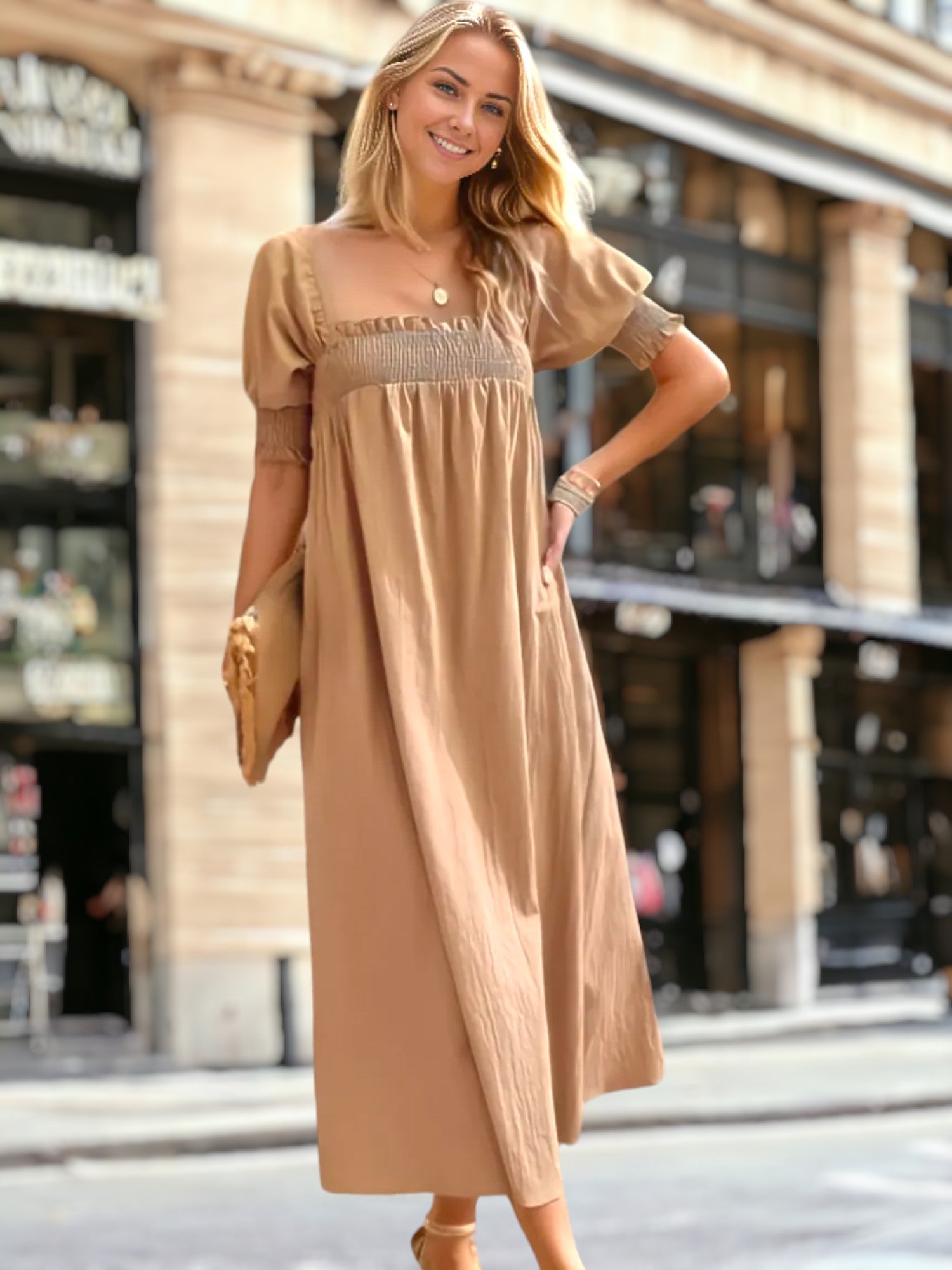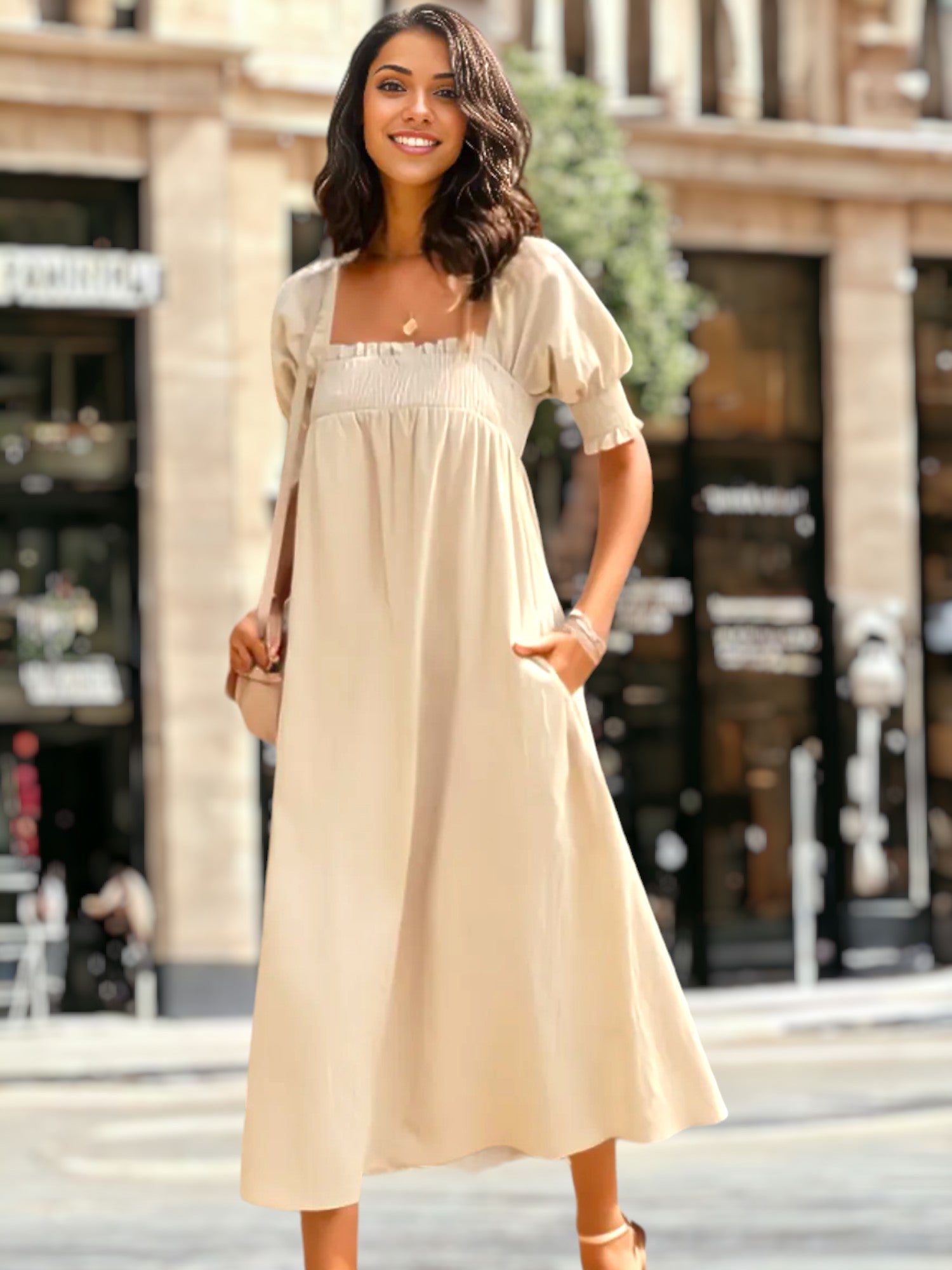 The Anna-Kaci dress is detailed with a classic empire cut. Features a square neck line, puff sleeves, flowy silhouette, and mid-calf length. Pair it with loafers and a purse for a gorgeous look.
