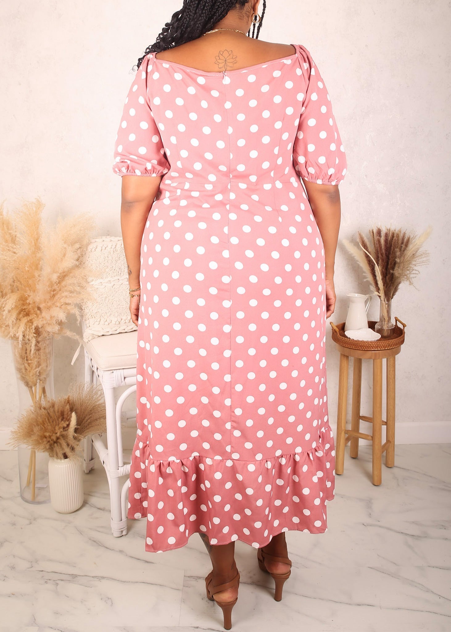 The Anna-Kaci plus size dress is detailed with a classic polka dot print. Features a v neck line, puff sleeves, front slit, ruffle hem, and ankle length. Pair it with a woven belt and heels for a gorgeous look.