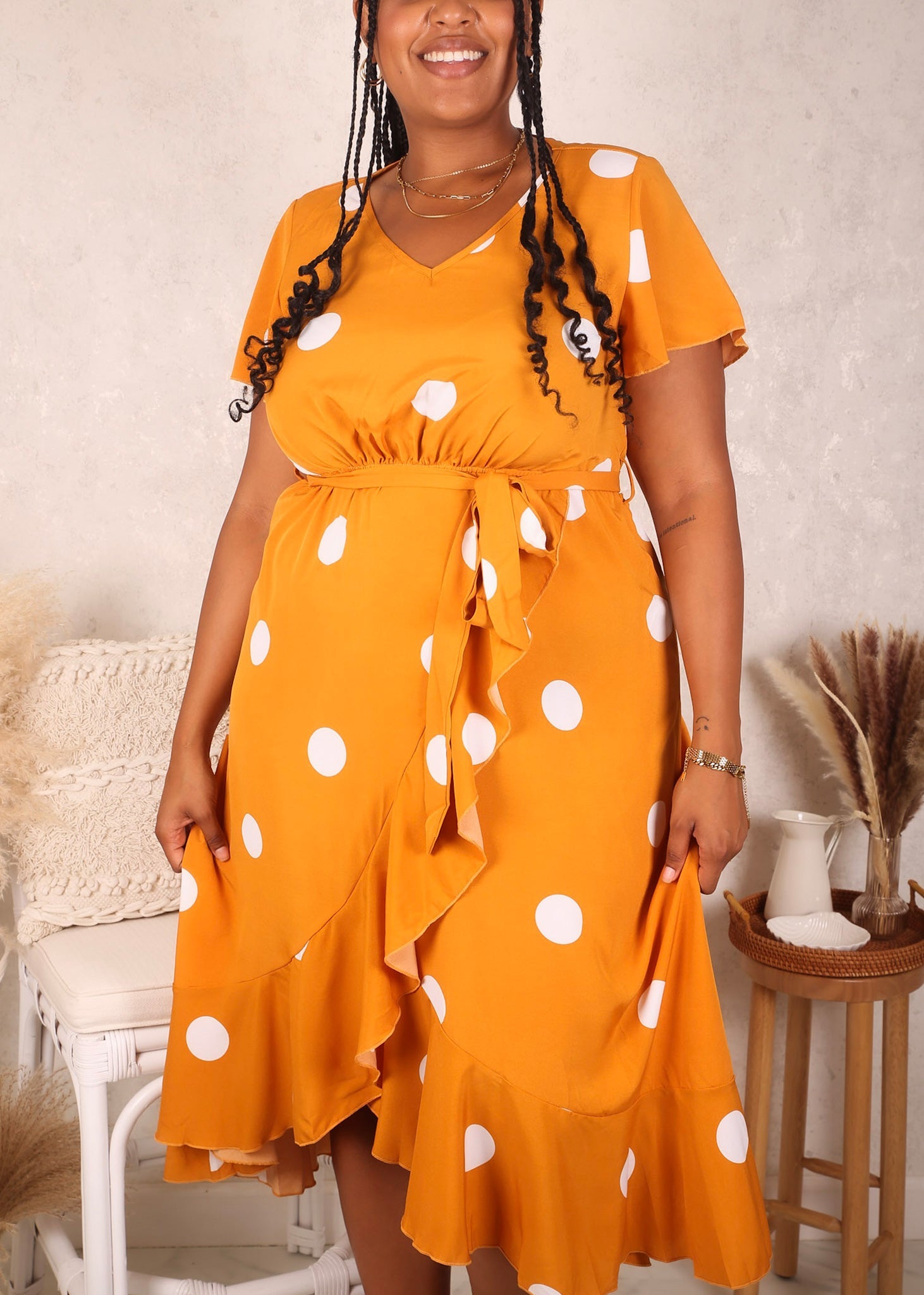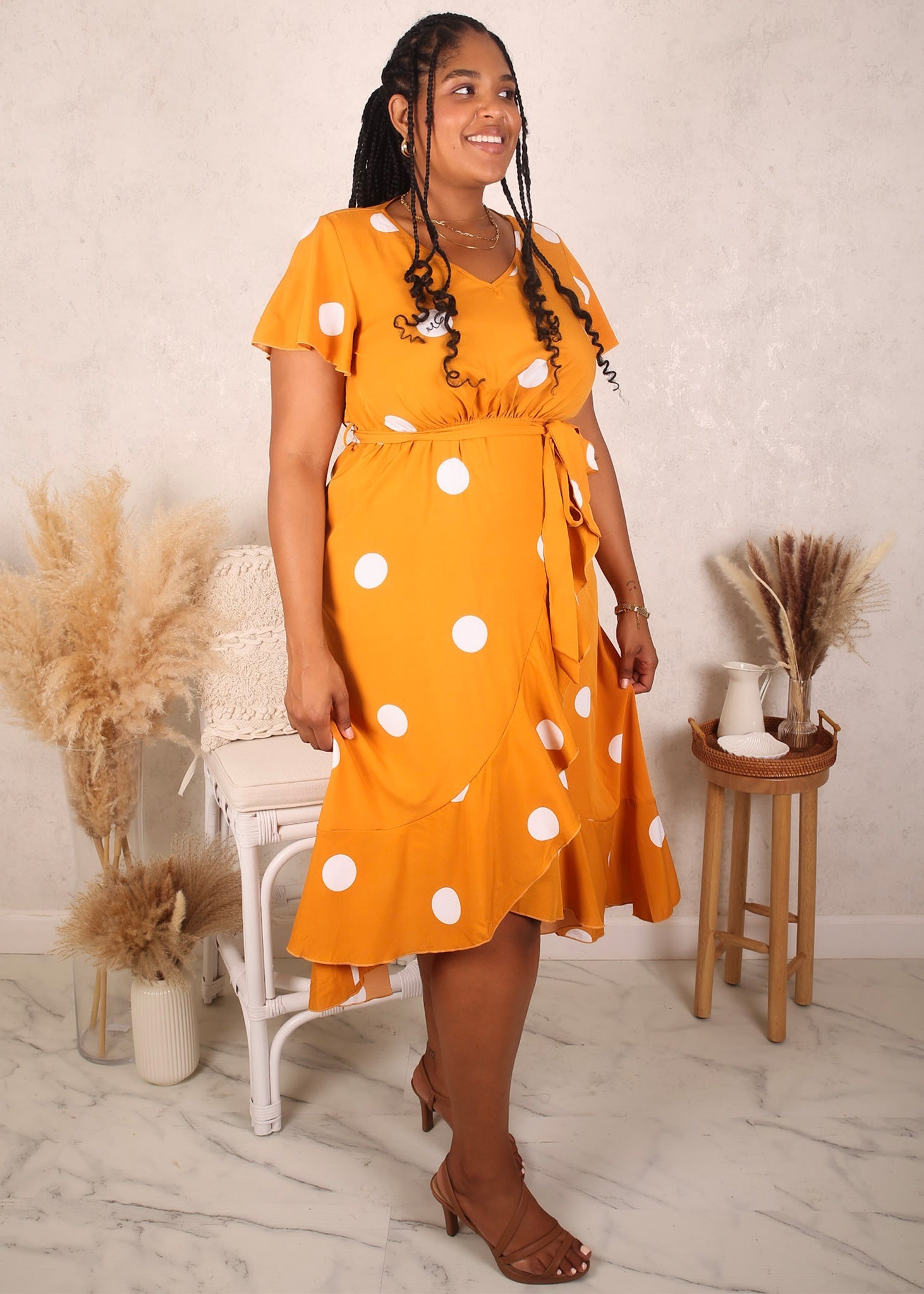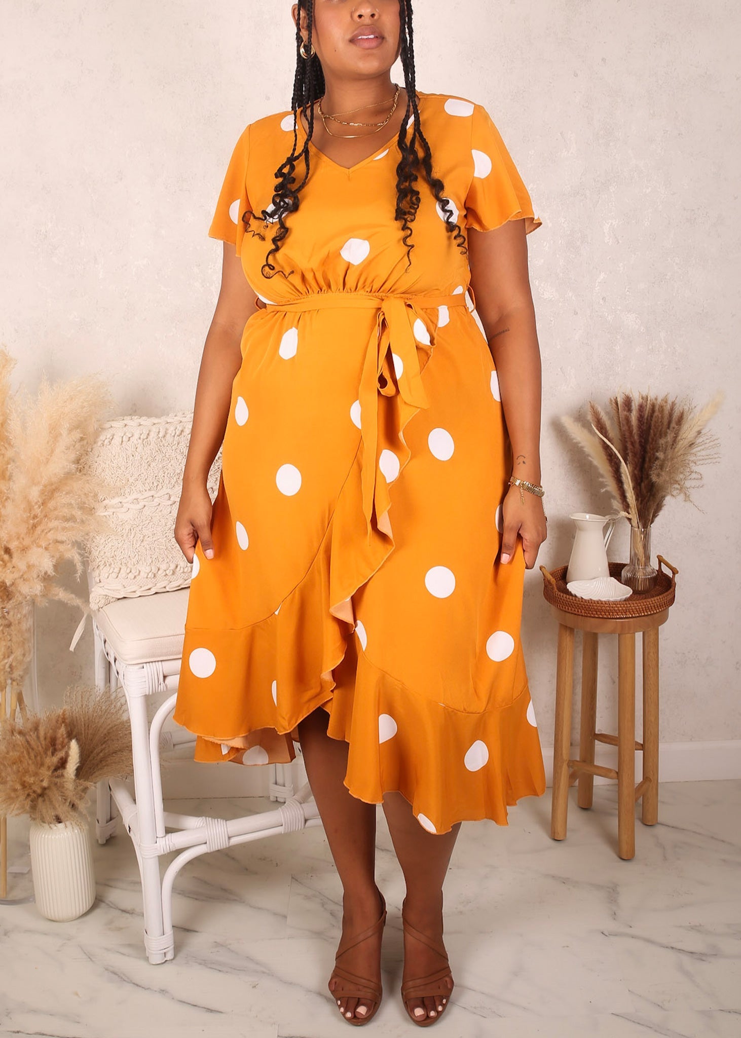 The Anna-Kaci dress is detailed with a beautiful overlap ruffle hem. Features a polka dot print, v neck line, short sleeves, tie waist detail, and knee length. Pair it with a handbag and heels for a classic look.