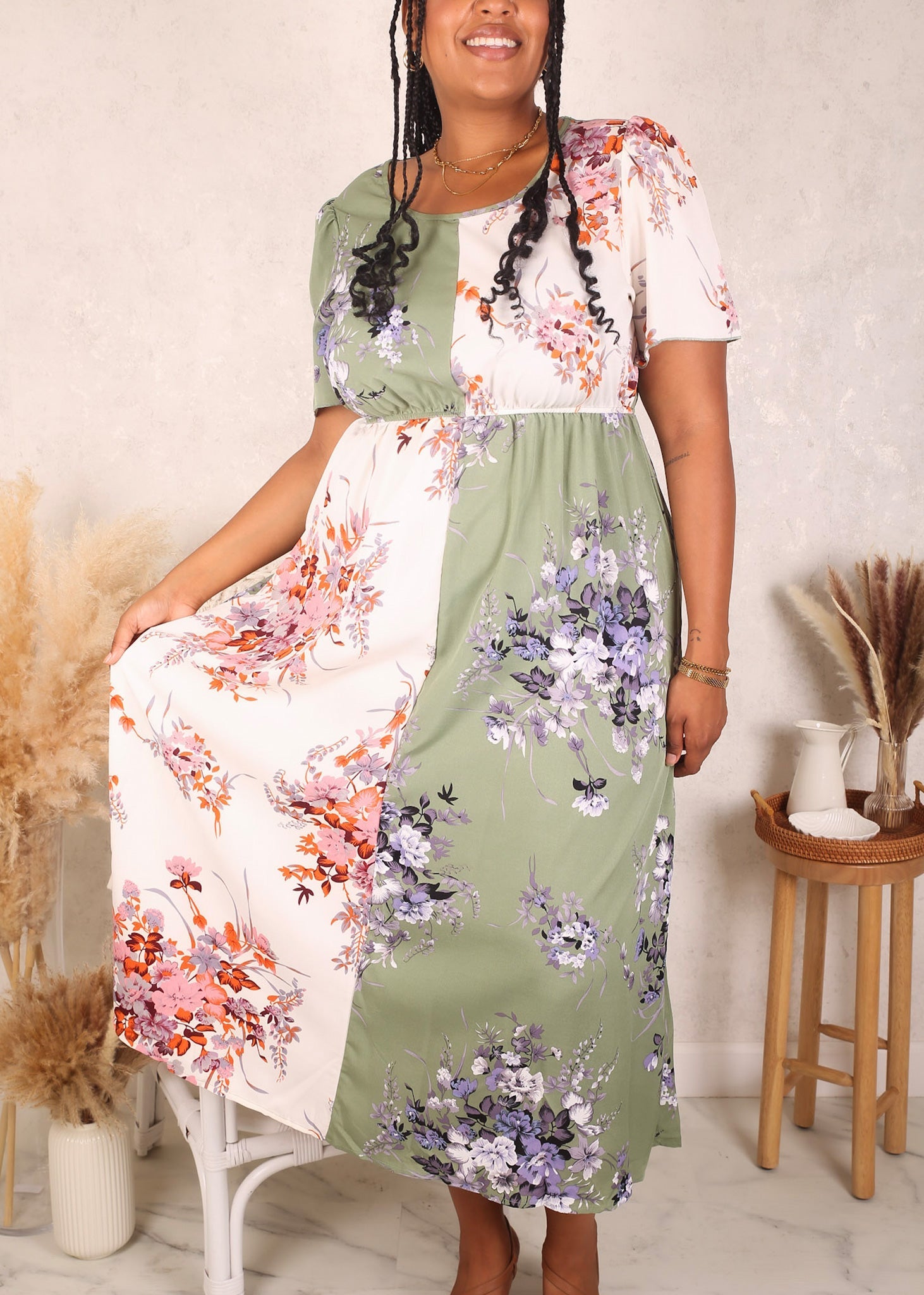The Anna-Kaci plus size dress is detailed with a cool color block floral design. Features a round neck line, short sleeves, flowy skirt, and above ankle length. Pair it with a handbag and sandals for a fantastic look.