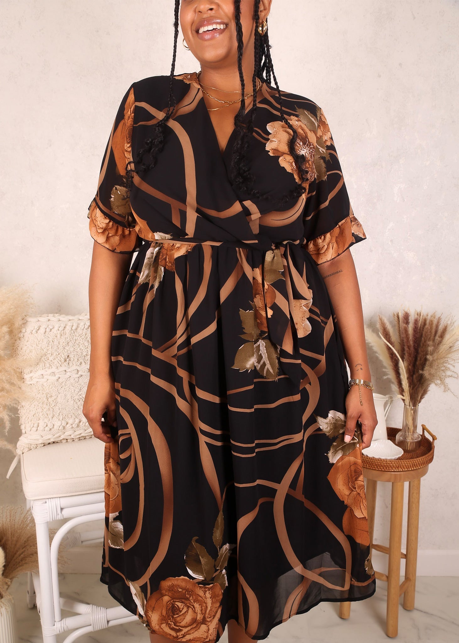 The Anna-Kaci plus size dress is detailed with a cool contrast golden floral print. Features a surplice neck line, short sleeves, flowy skirt, and below knee length. Pair it with earrings and heels for a feminine look.