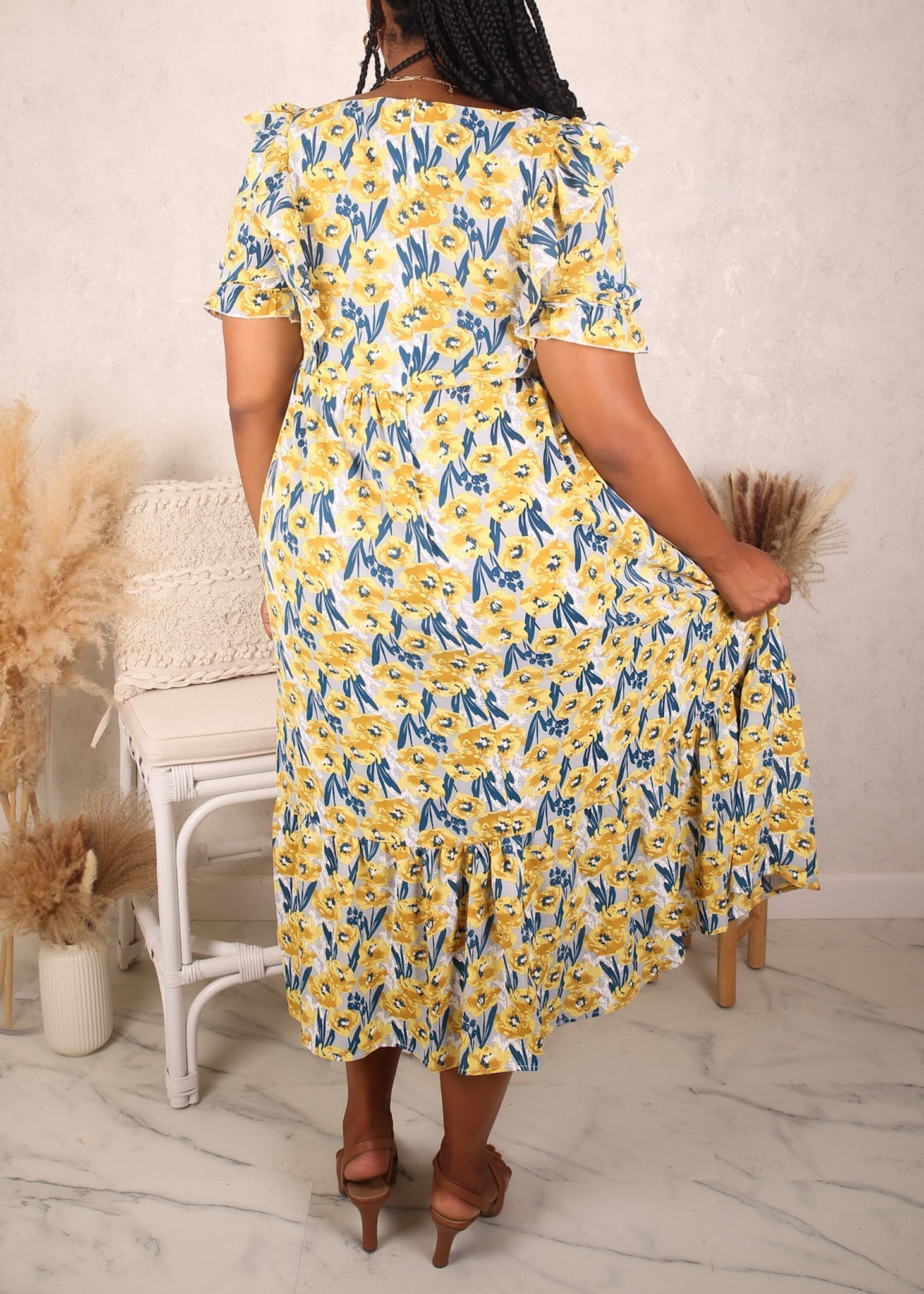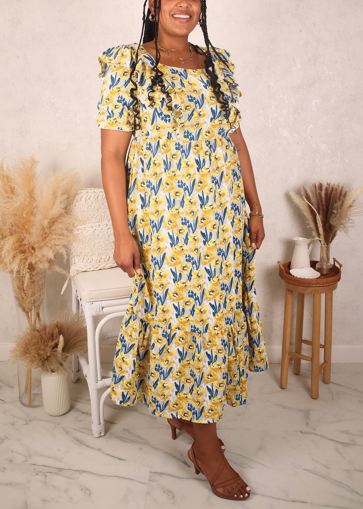 The Anna-Kaci plus size dress is detailed with a cute ruffle front. Features a floral print, round neck line, puff sleeves, flowy skirt, and ankle length. Pair it with a sun hat and sandals for a beautiful look.
