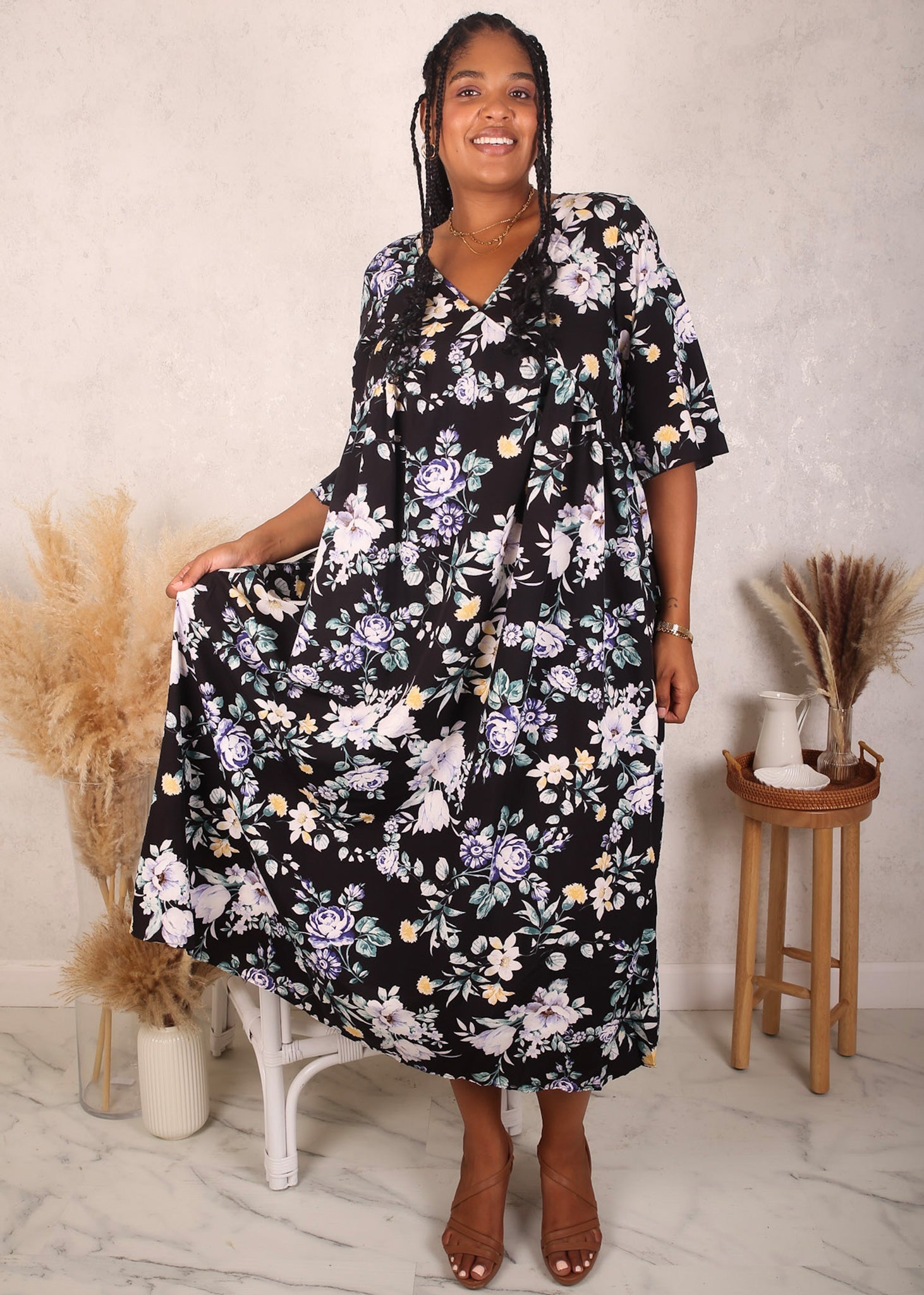 The Anna-Kaci plus size dress is detailed with cute floral prints. Features a v neck line, elbow length sleeves, flowy silhouette, and above ankle length.