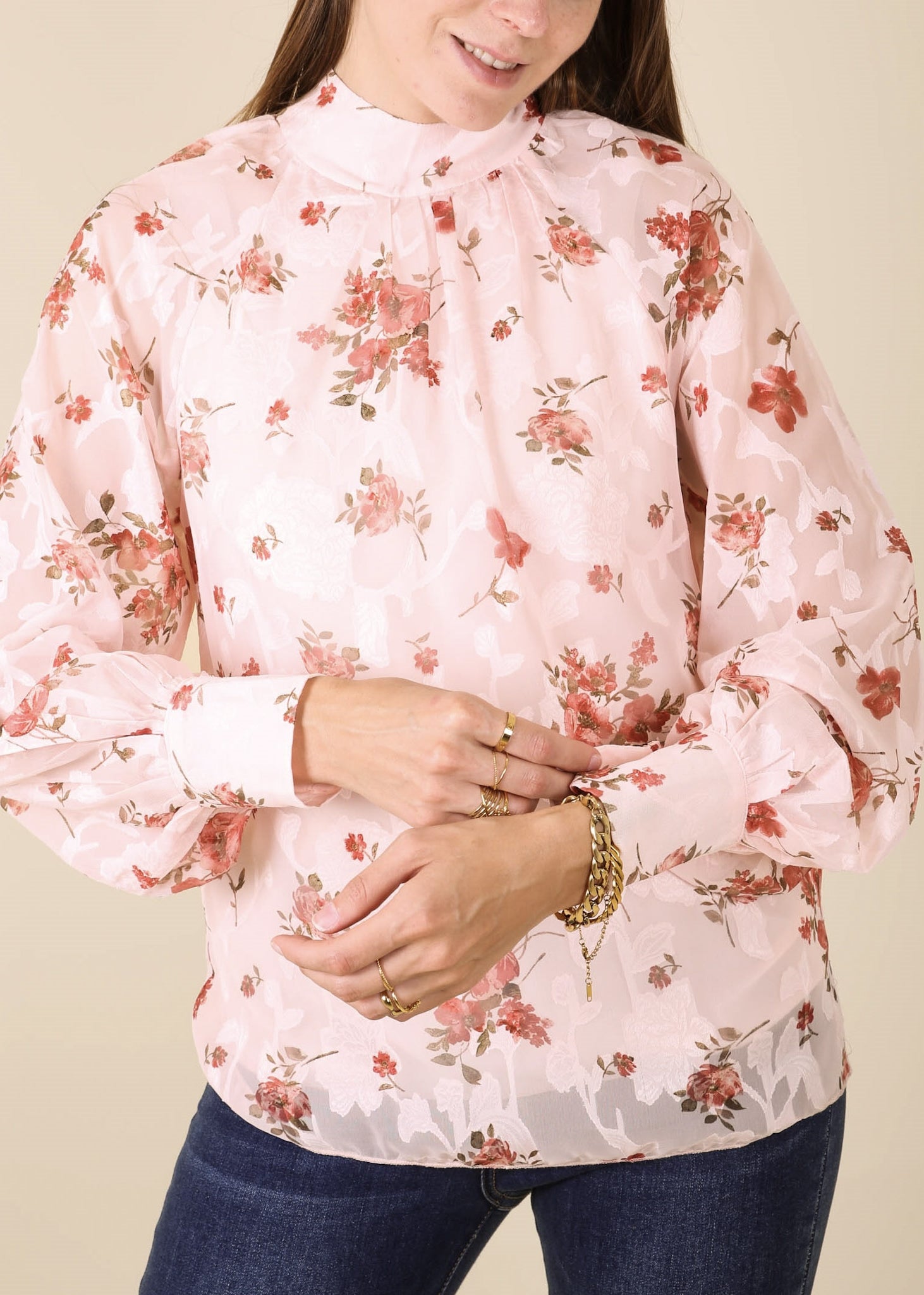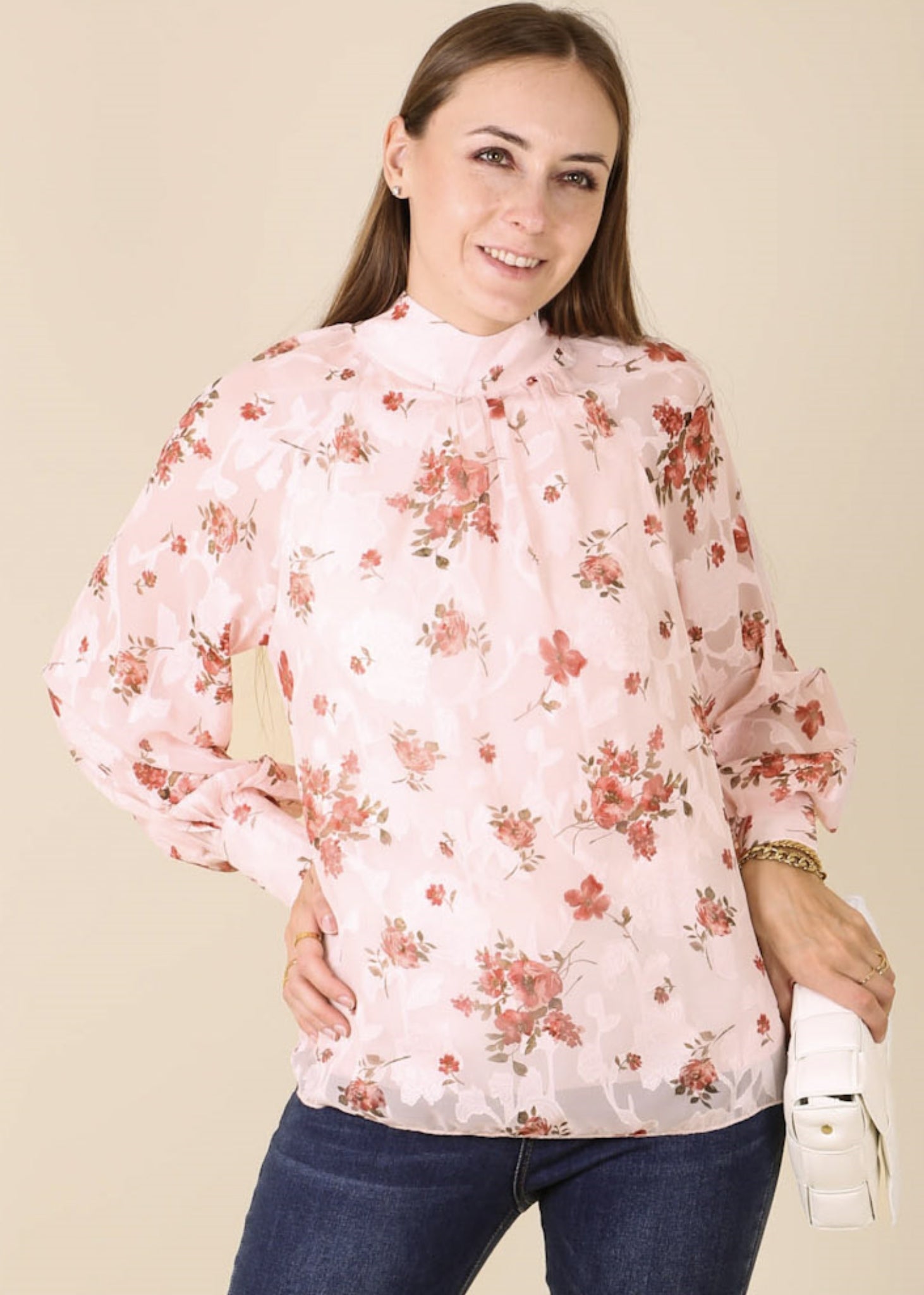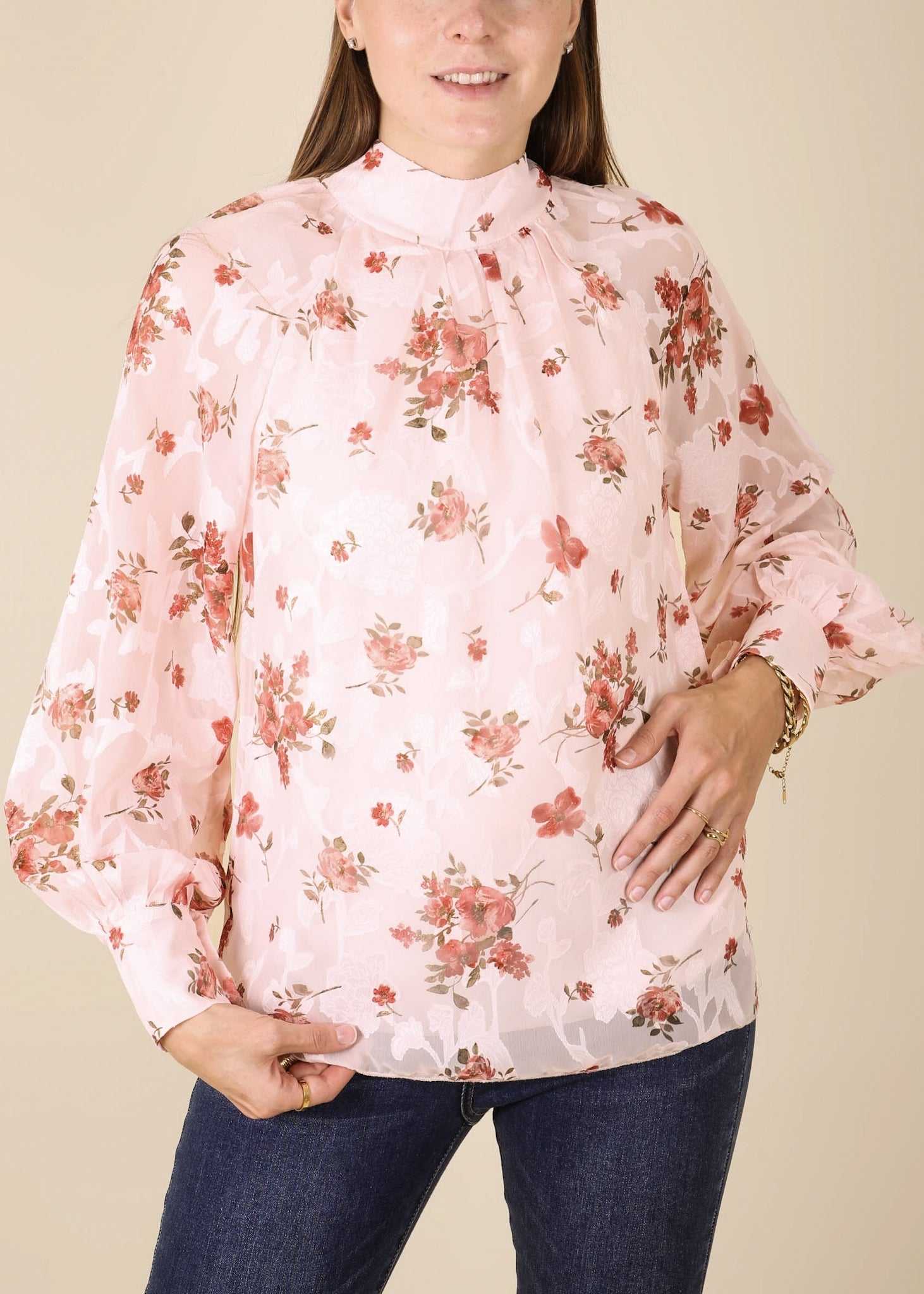 The Anna-Kaci blouse is detailed with a stunning multi-floral pattern. Features a high neck line, bishop sleeves, and loose fit. Pair it with trousers and heels for a beautiful look.