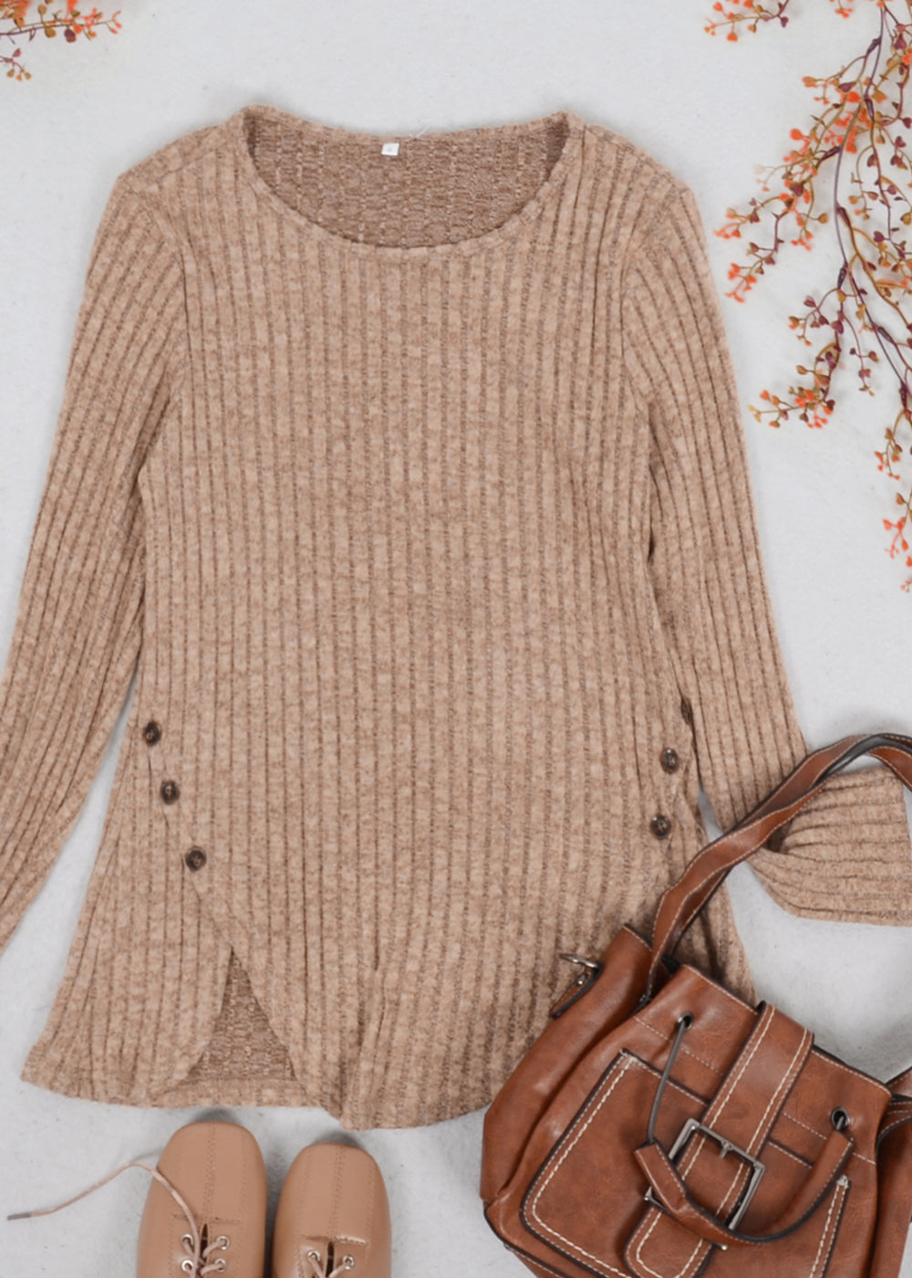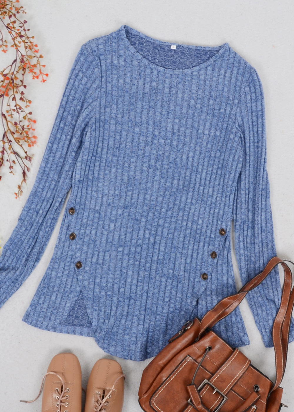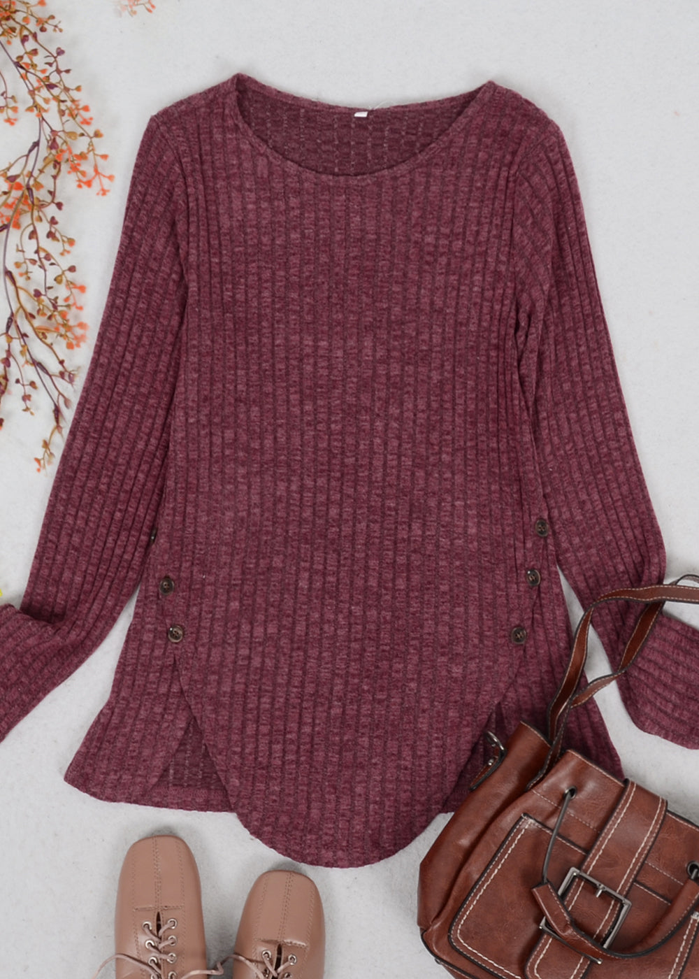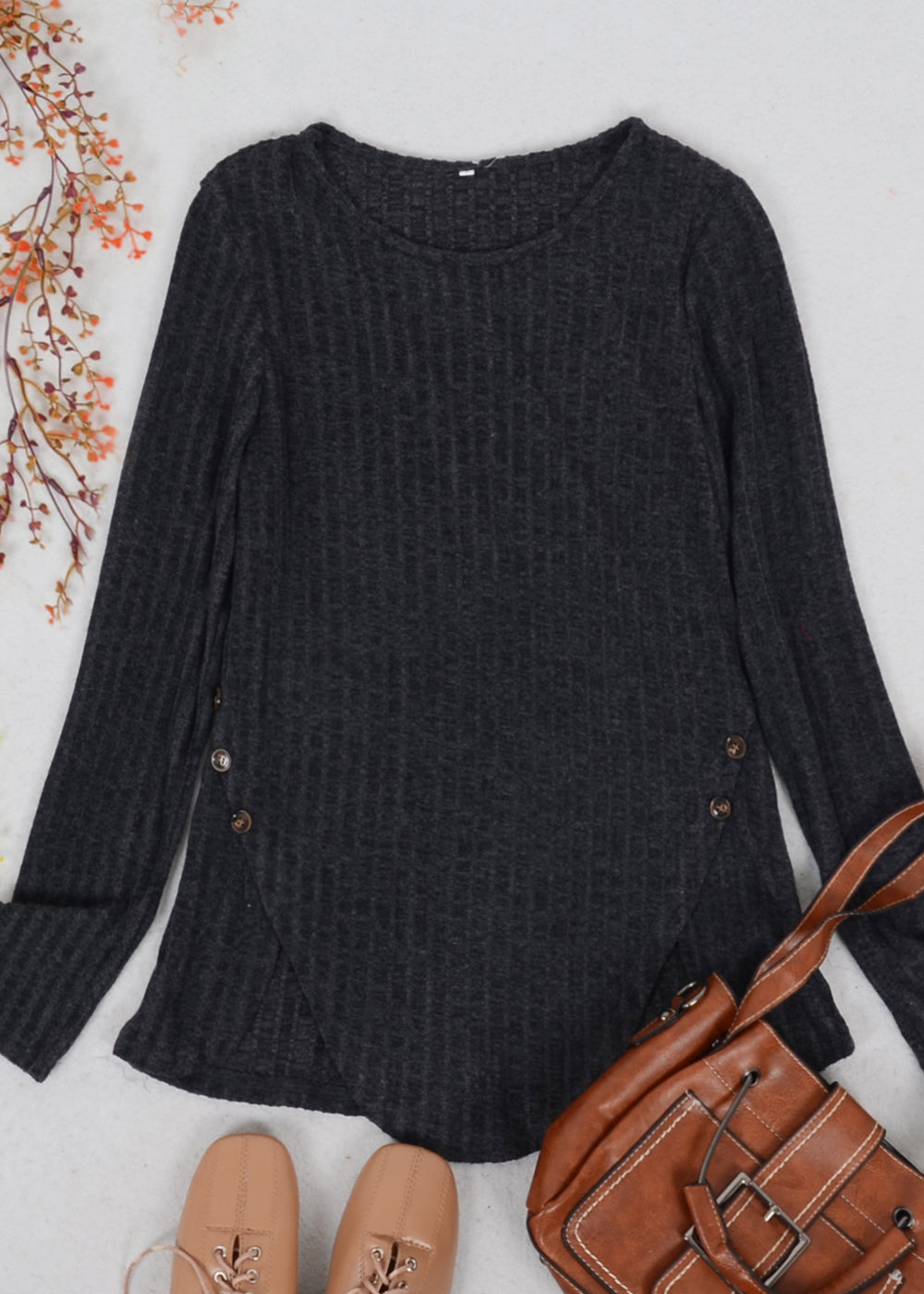 The Anna-Kaci sweater is detailed with a fabulous curved hem. Features solid color, round neck line, long sleeves, side button detail, and regular fit. Pair it with jeans and boots for a wonderful look.