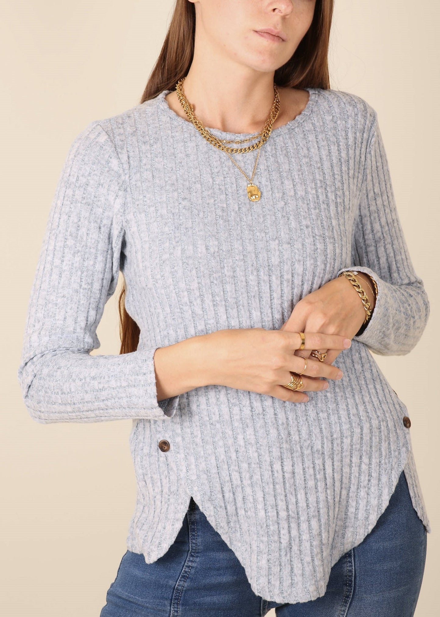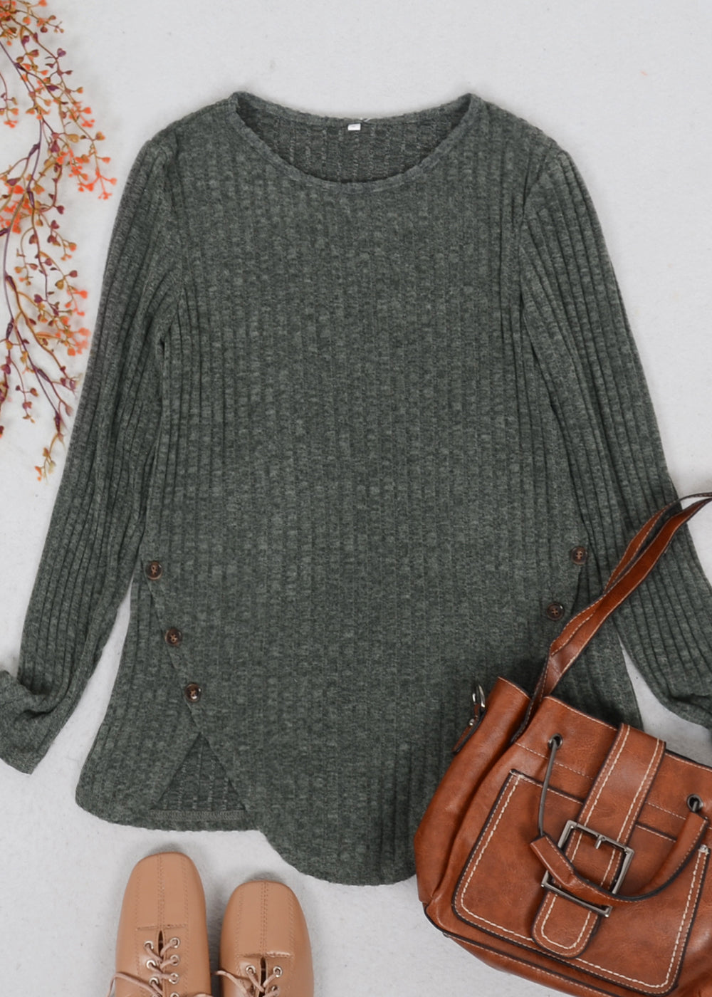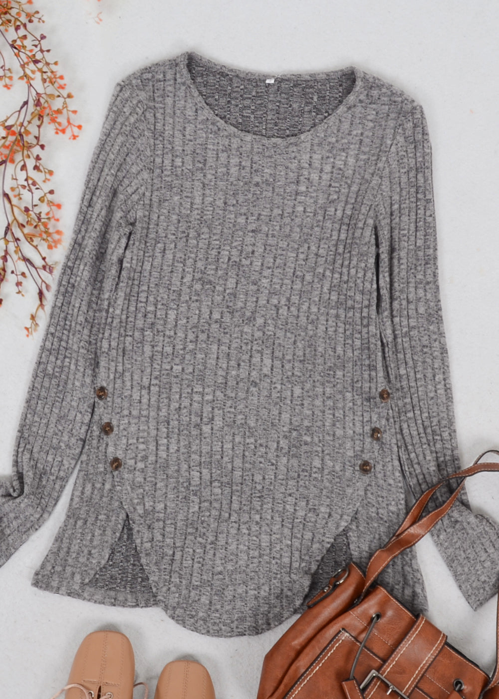 The Anna-Kaci sweater is detailed with a fabulous curved hem. Features solid color, round neck line, long sleeves, side button detail, and regular fit. Pair it with jeans and boots for a wonderful look.