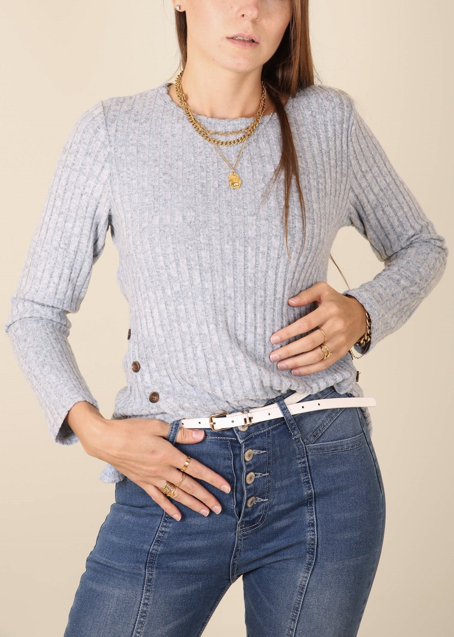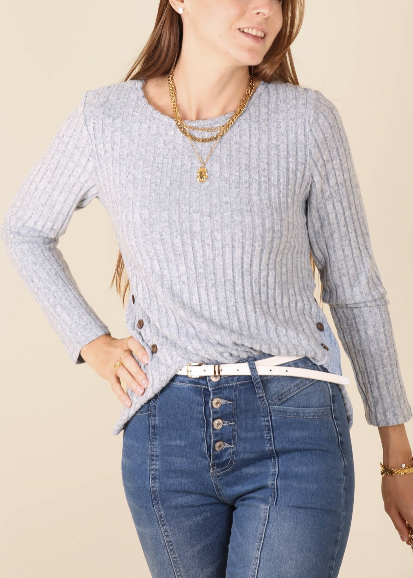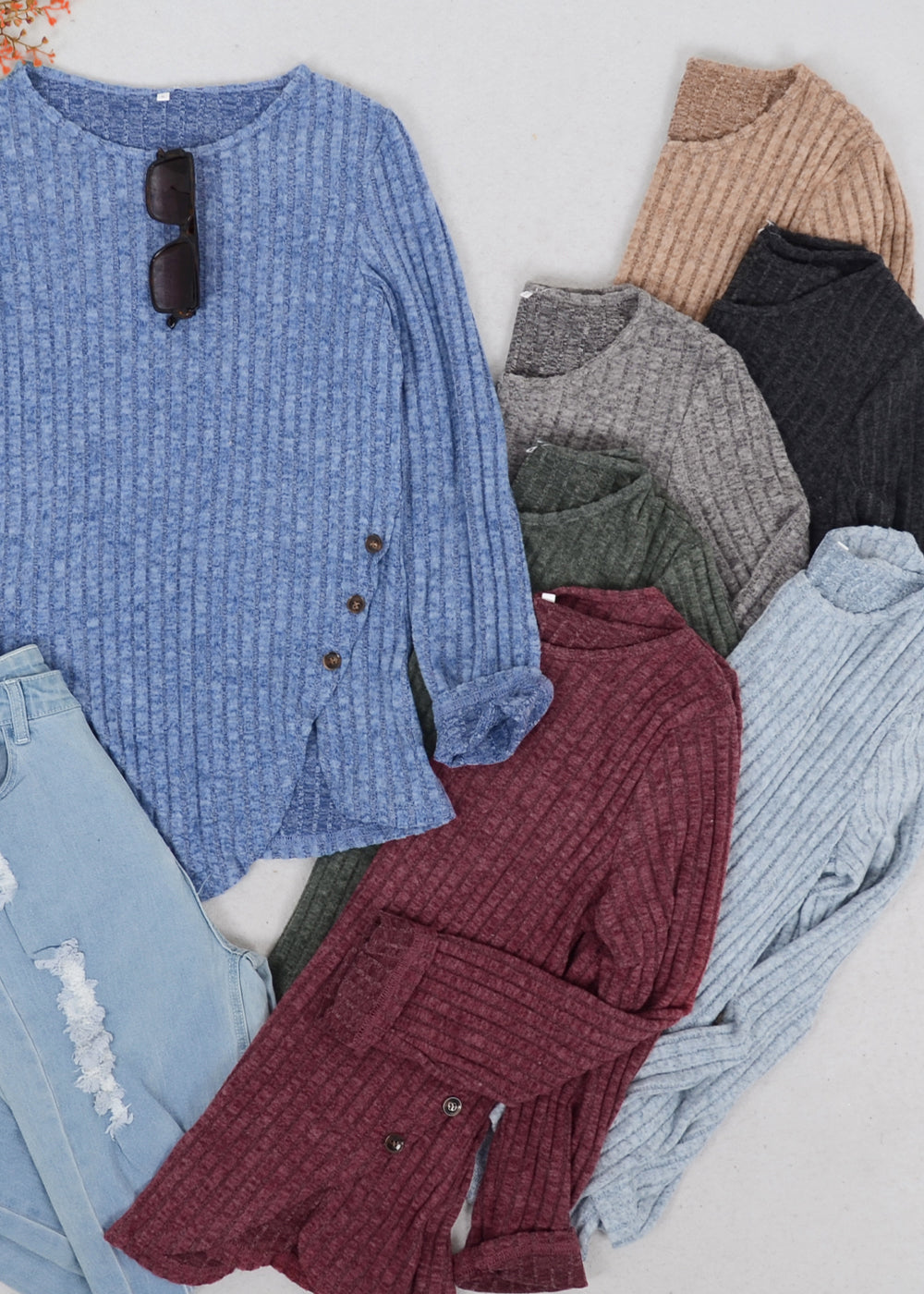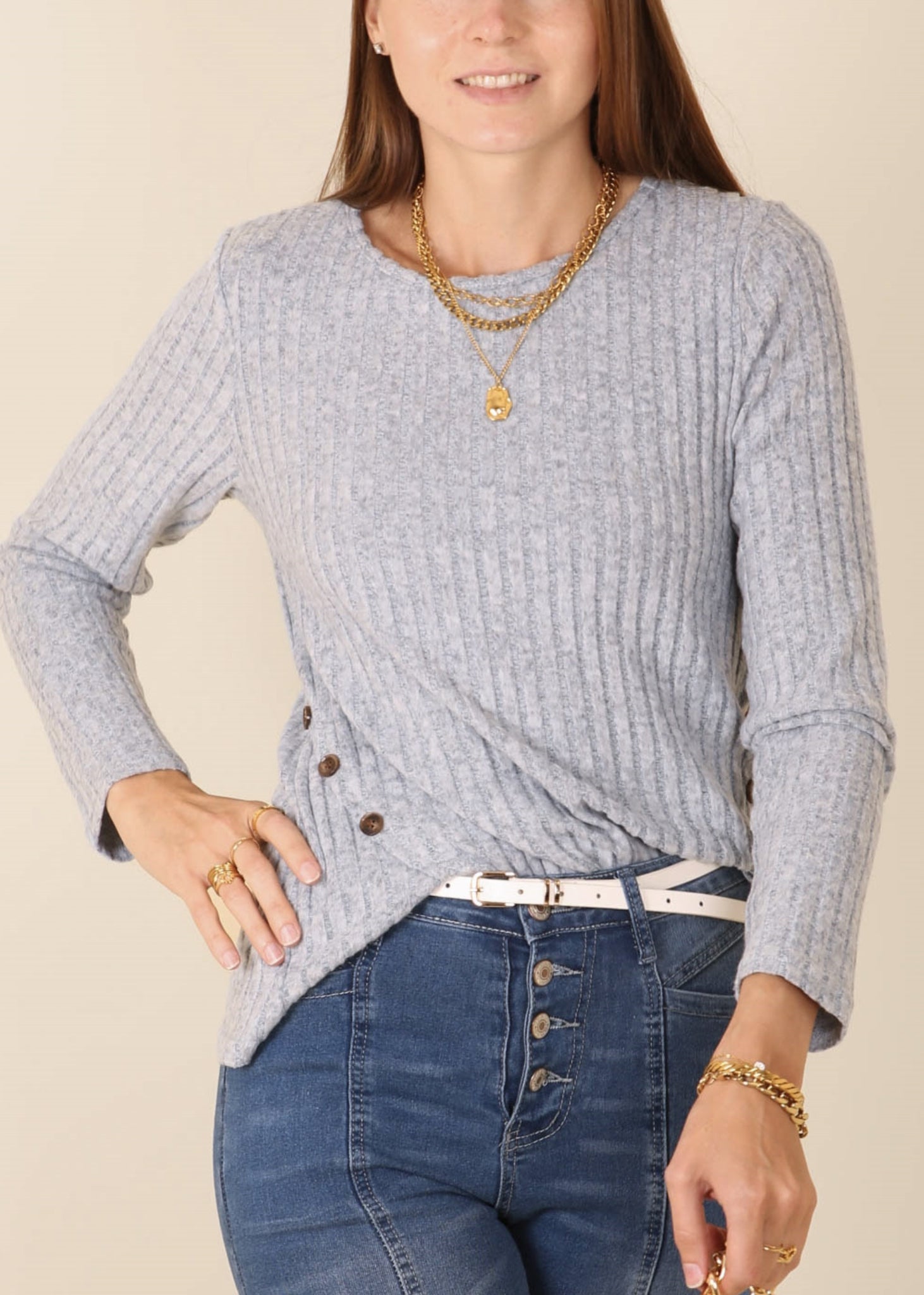 The Anna-Kaci sweater is detailed with a fabulous curved hem. Features solid color, round neck line, long sleeves, side button detail, and regular fit. Pair it with jeans and boots for a wonderful look.