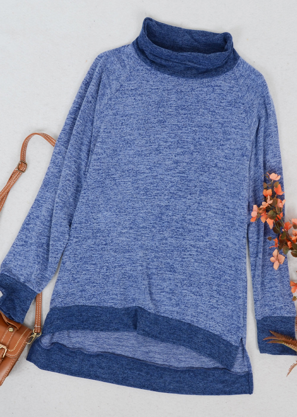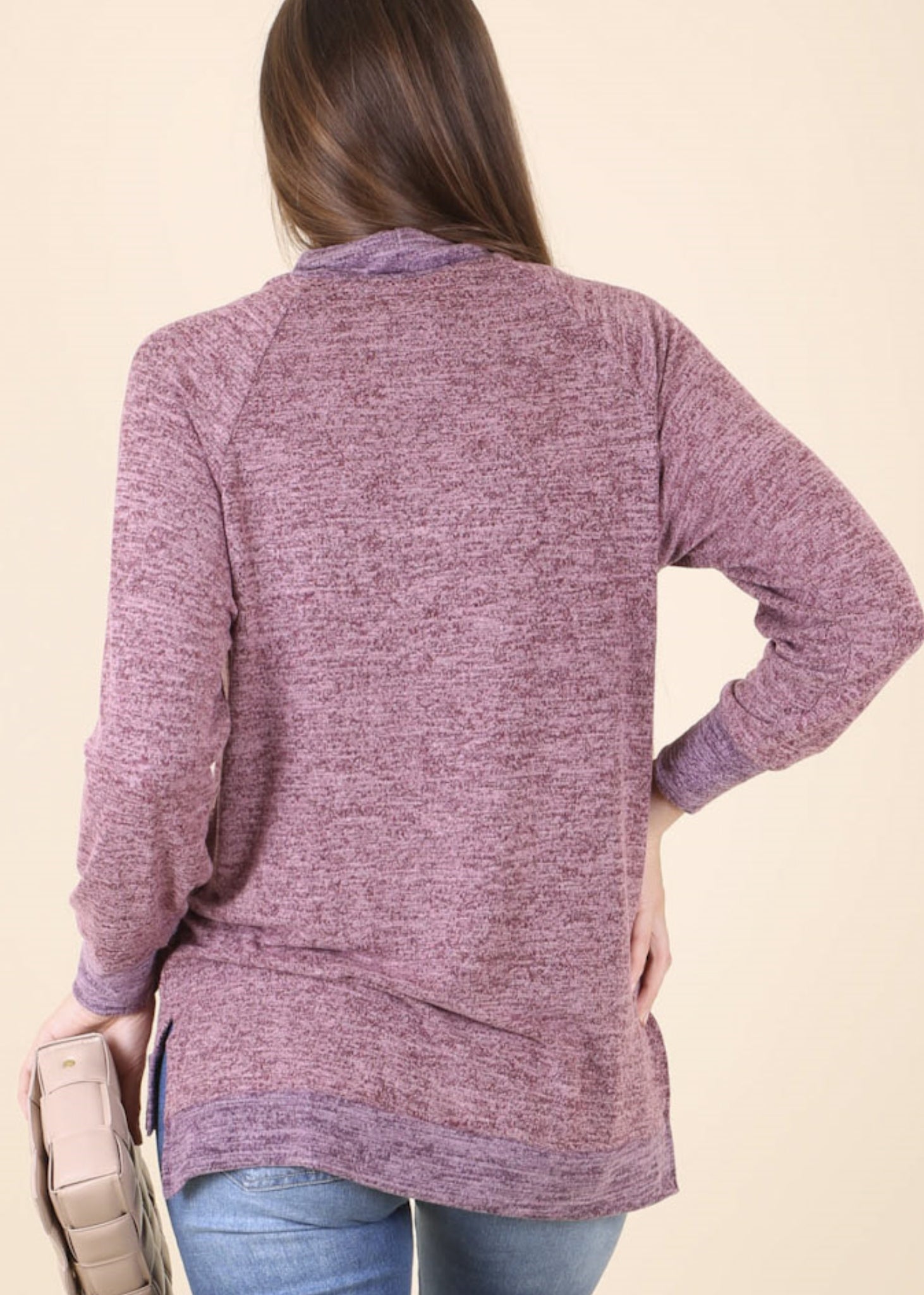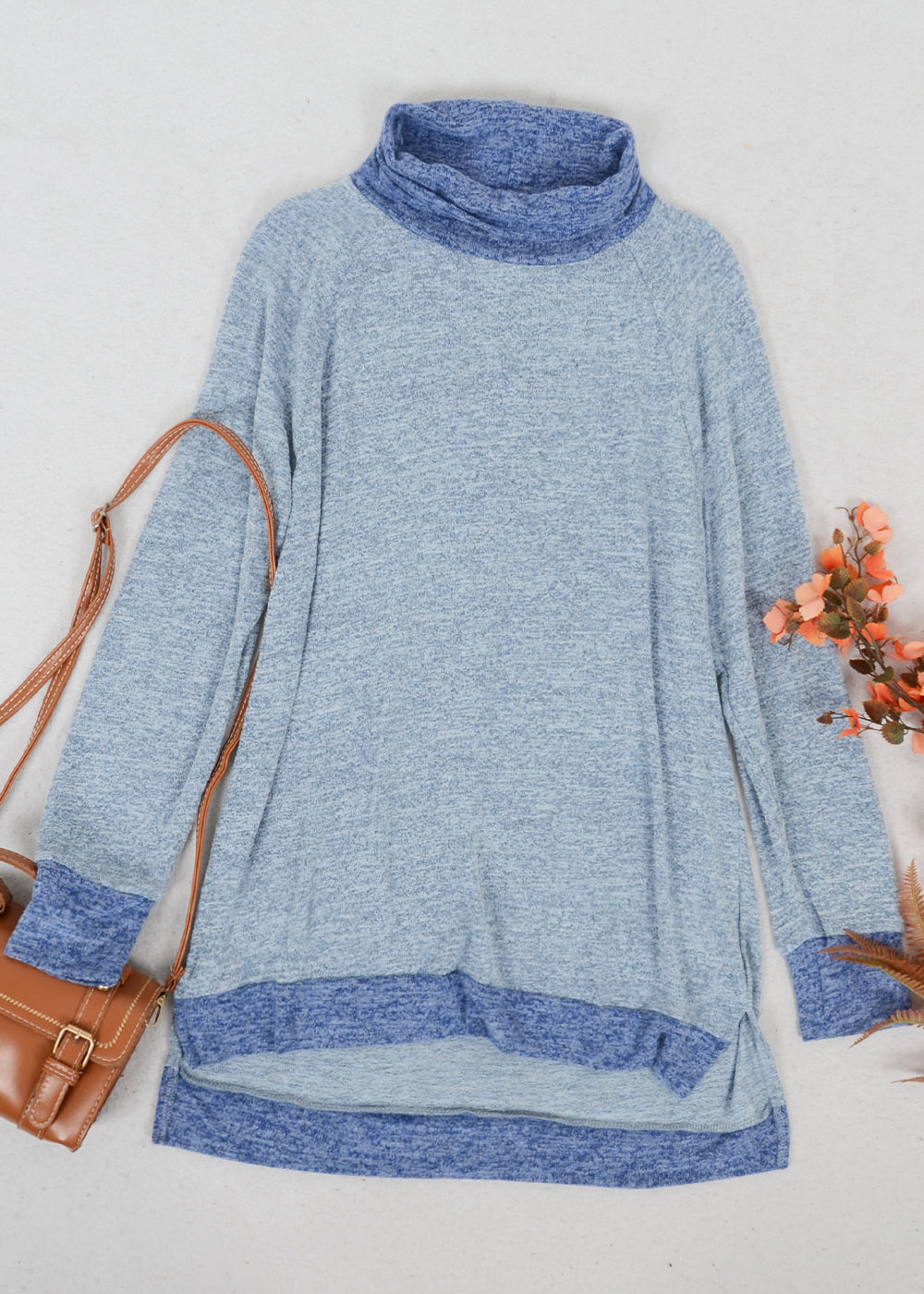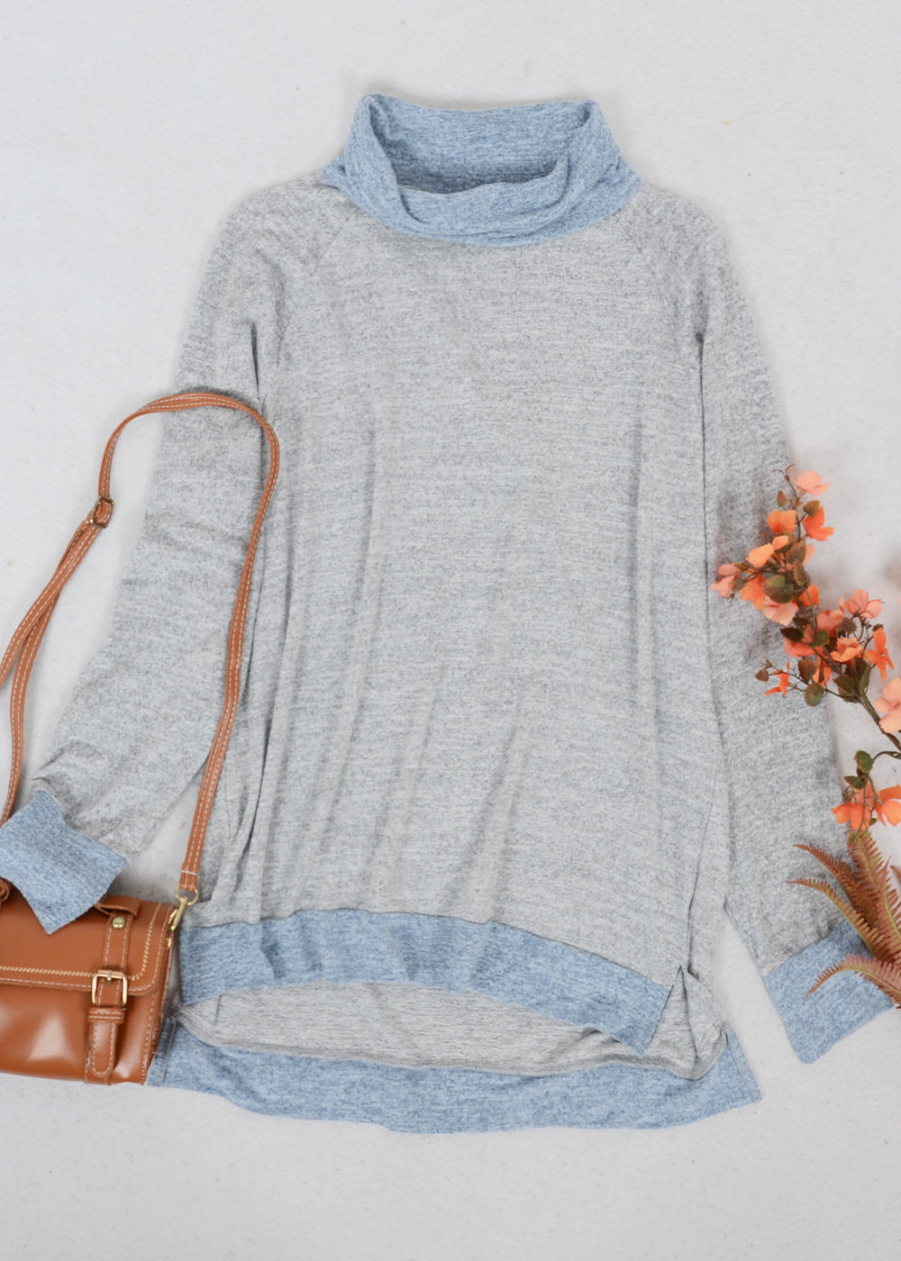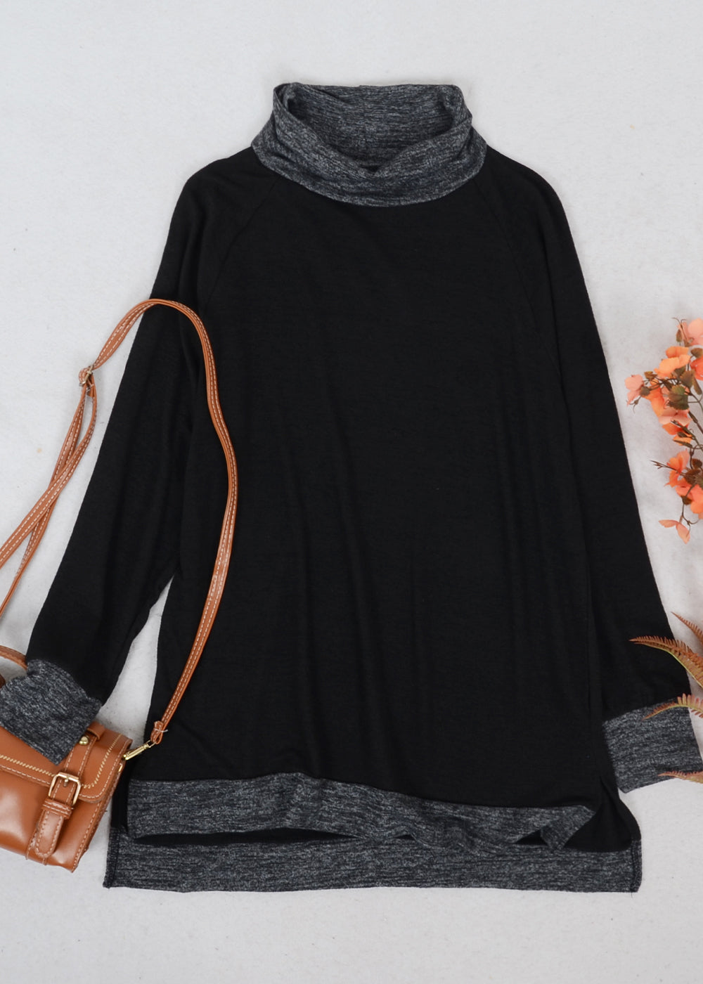 The Anna-Kaci sweater is detailed with a cozy mock neck line. Features a two tone design, raglan long sleeves, side slit, and oversized fit. Pair it with leggings and boots for a fabulous look.