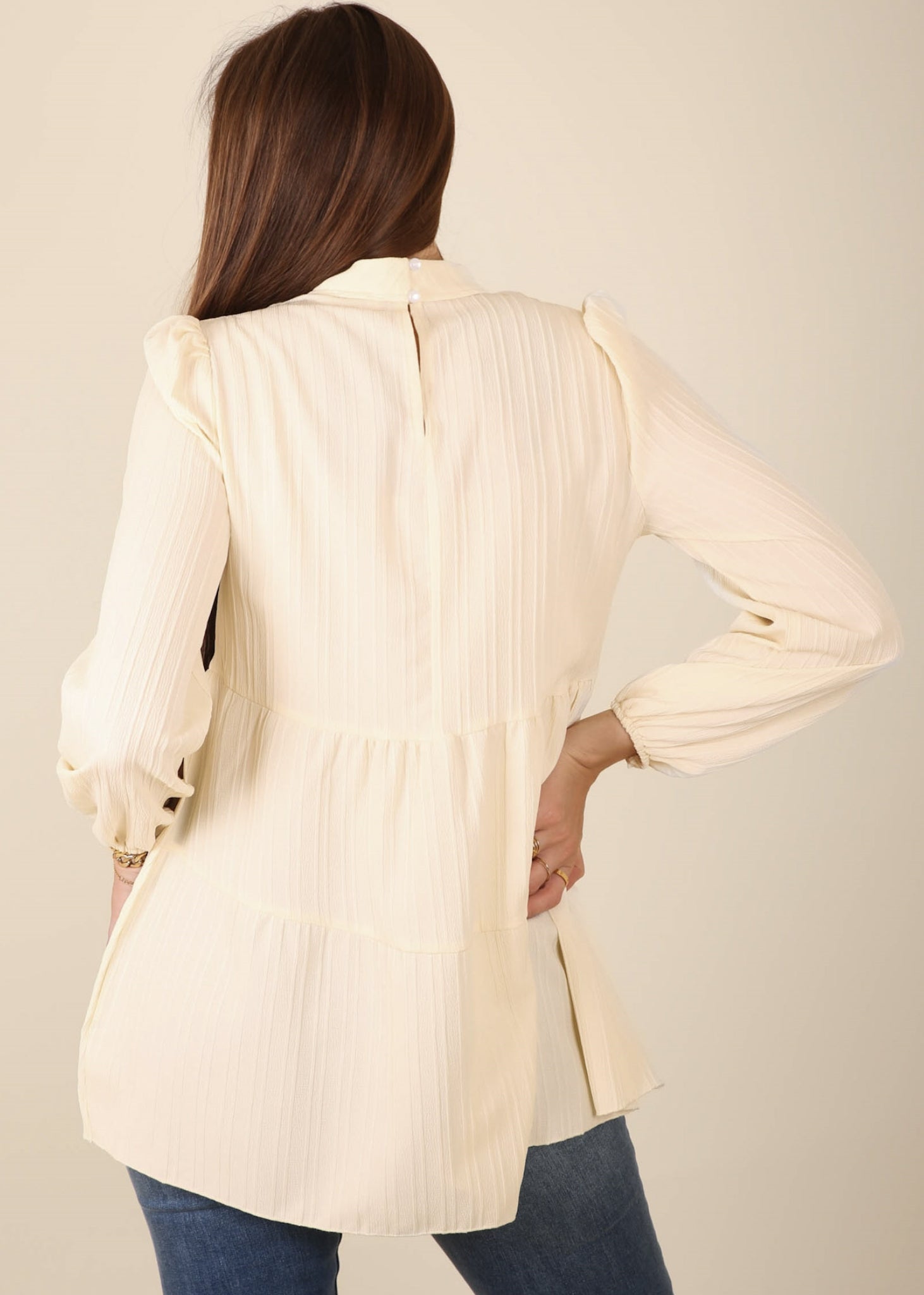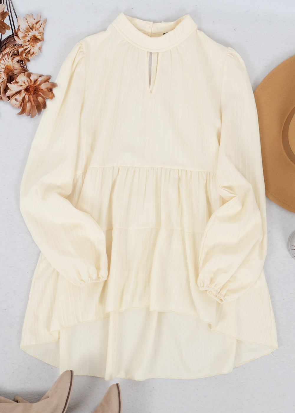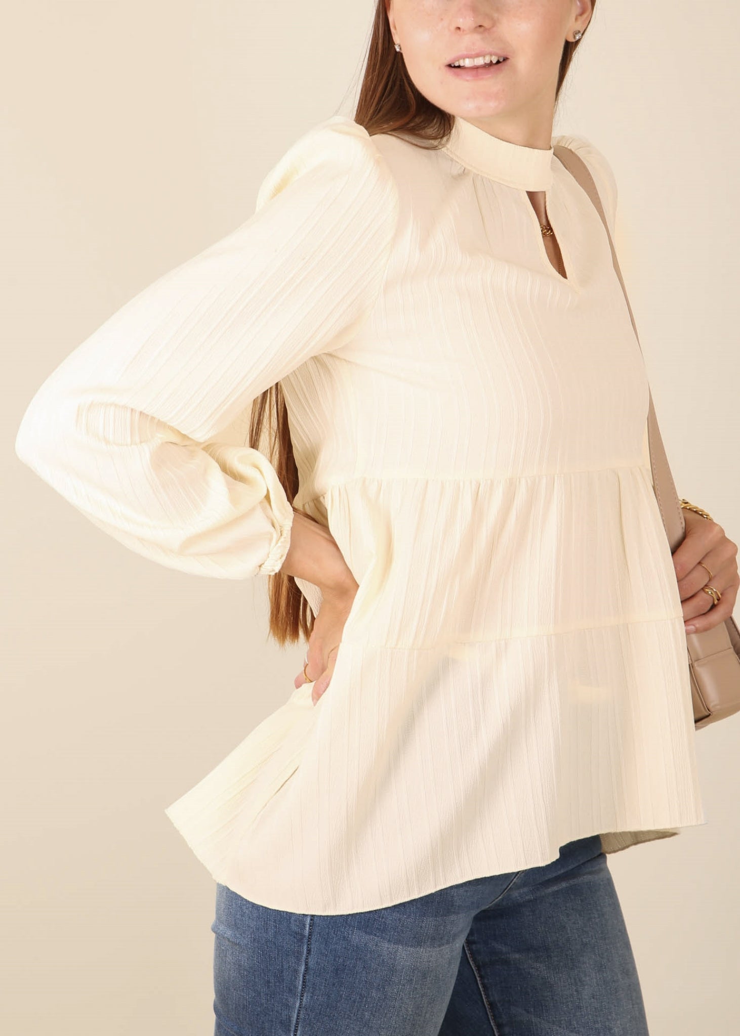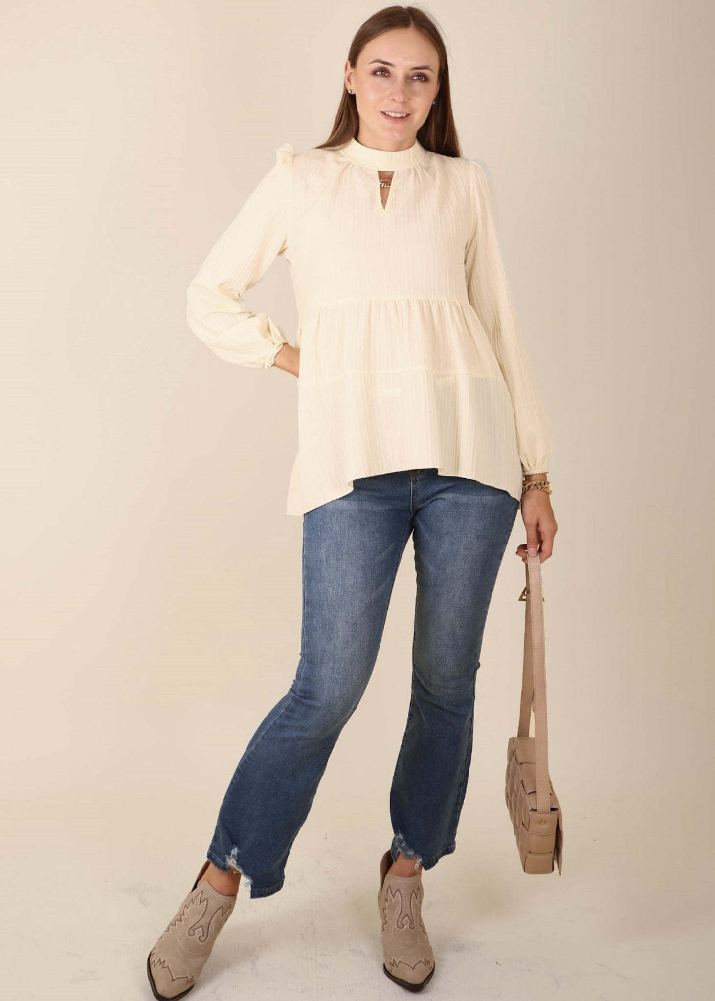 The Anna-Kaci blouse is detailed with a beautiful tiered peplum hem. Features a high neck line, cutout front detail, long sleeves, and flowy fit. Pair it with jeans and boots for a juxtaposing look.
