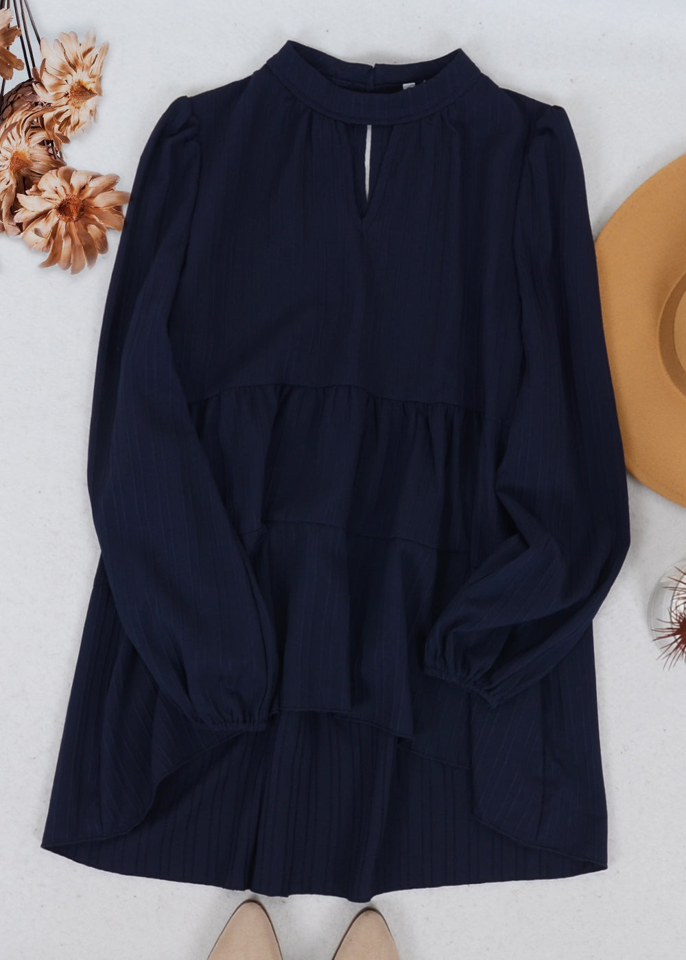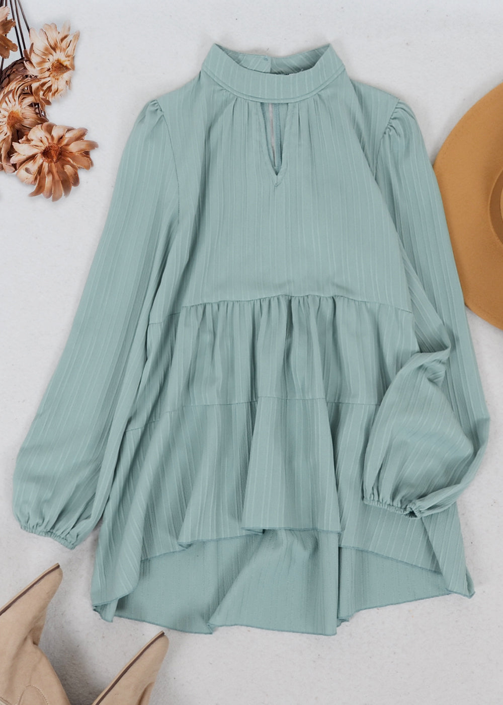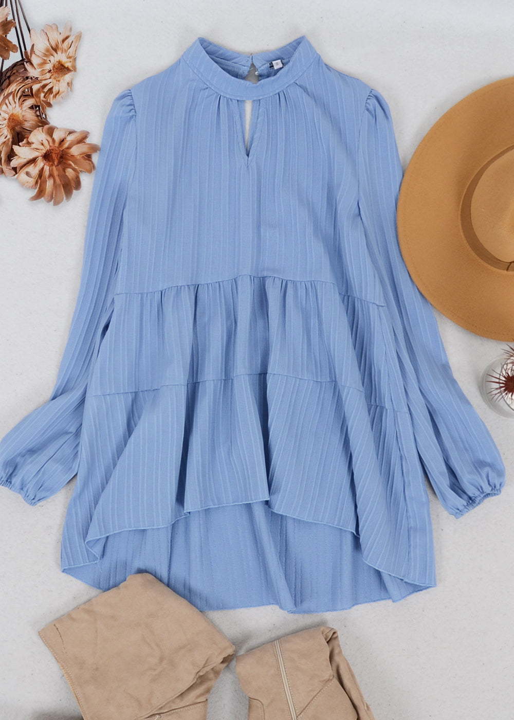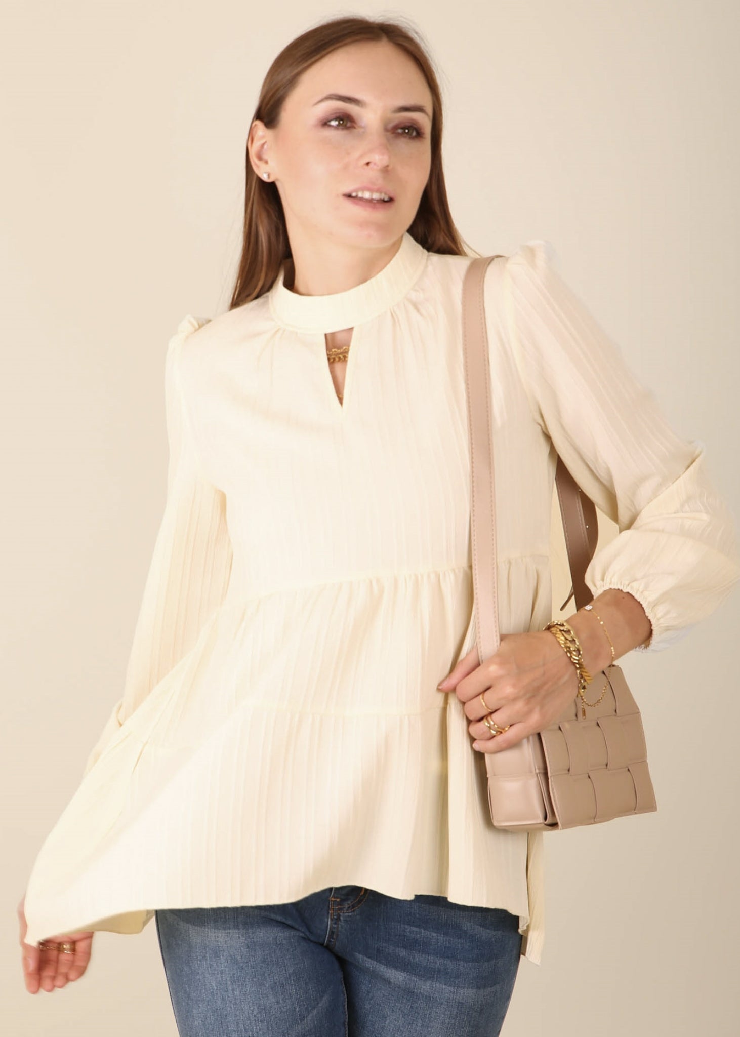 The Anna-Kaci blouse is detailed with a beautiful tiered peplum hem. Features a high neck line, cutout front detail, long sleeves, and flowy fit. Pair it with jeans and boots for a juxtaposing look.