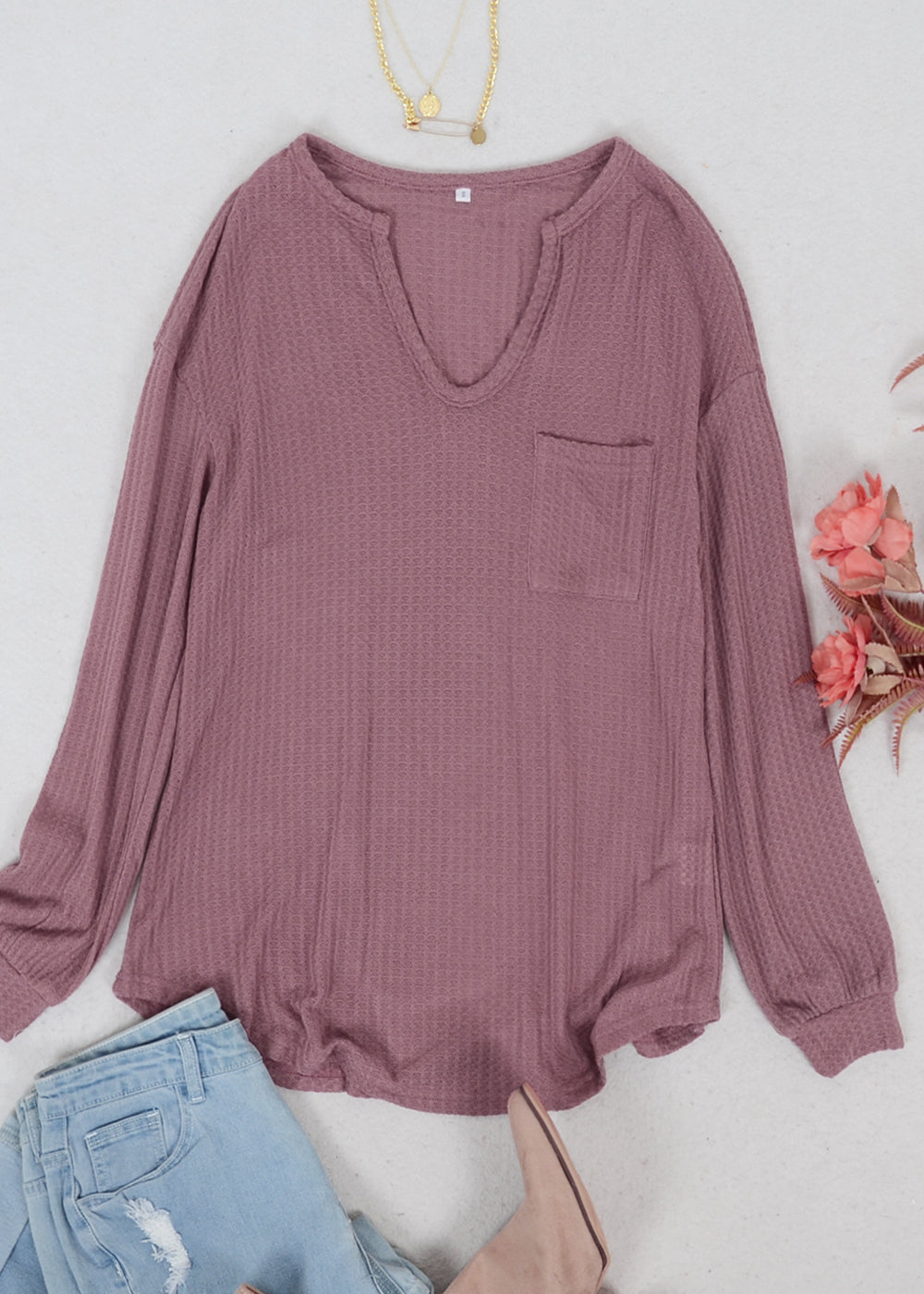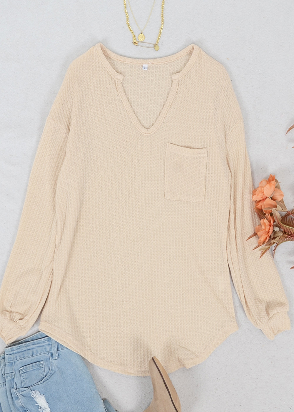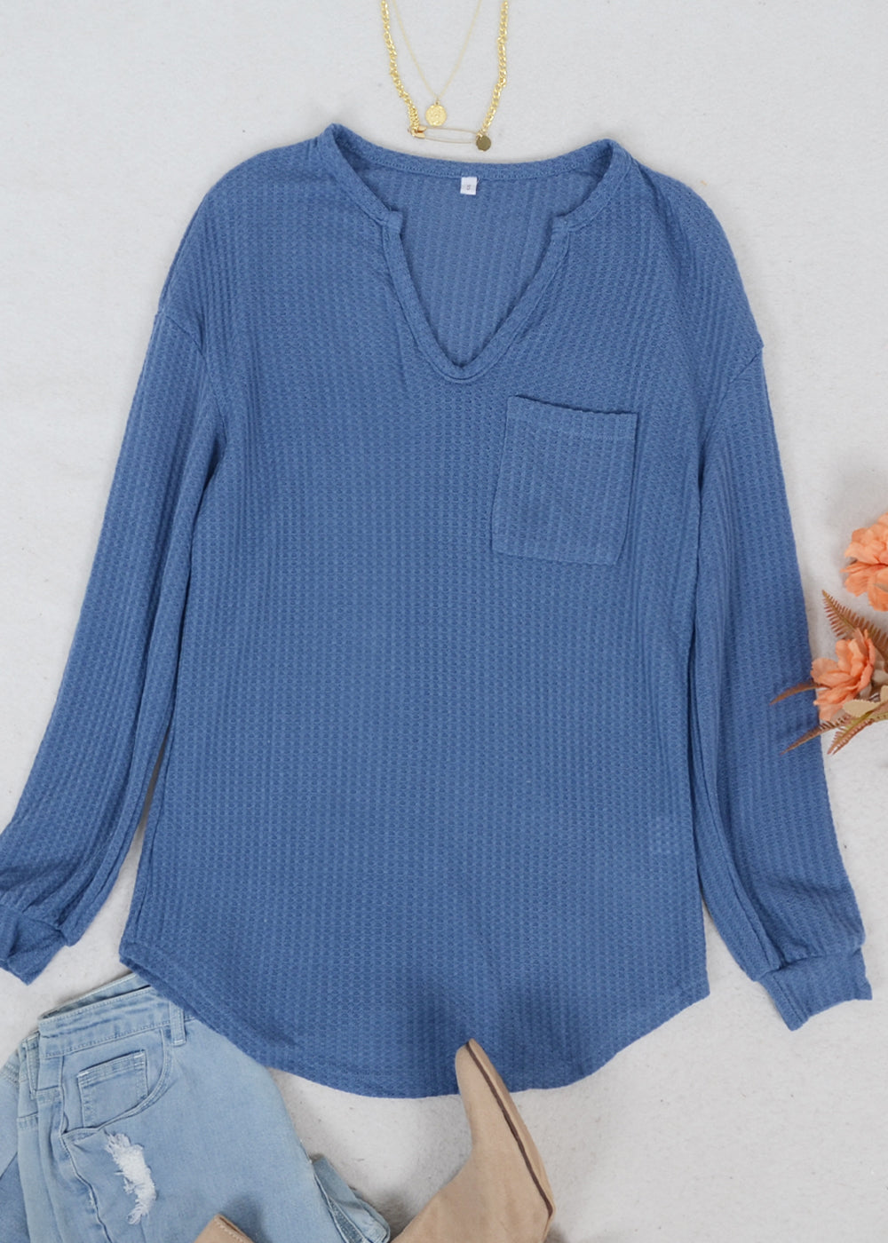 The Anna-Kaci sweater is detailed with a beautiful waffle knit material. Features solid color, v neck line, drop shoulder, patch pocket, long sleeves, and loose fit. Pair it with jeans and boots for a laidback look.