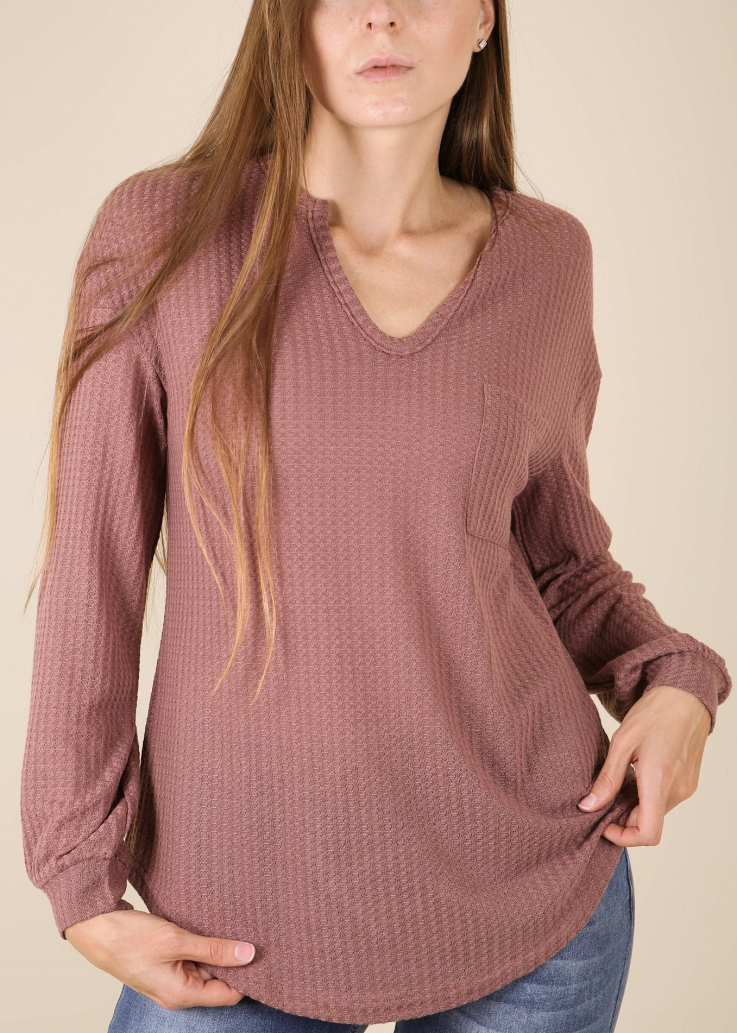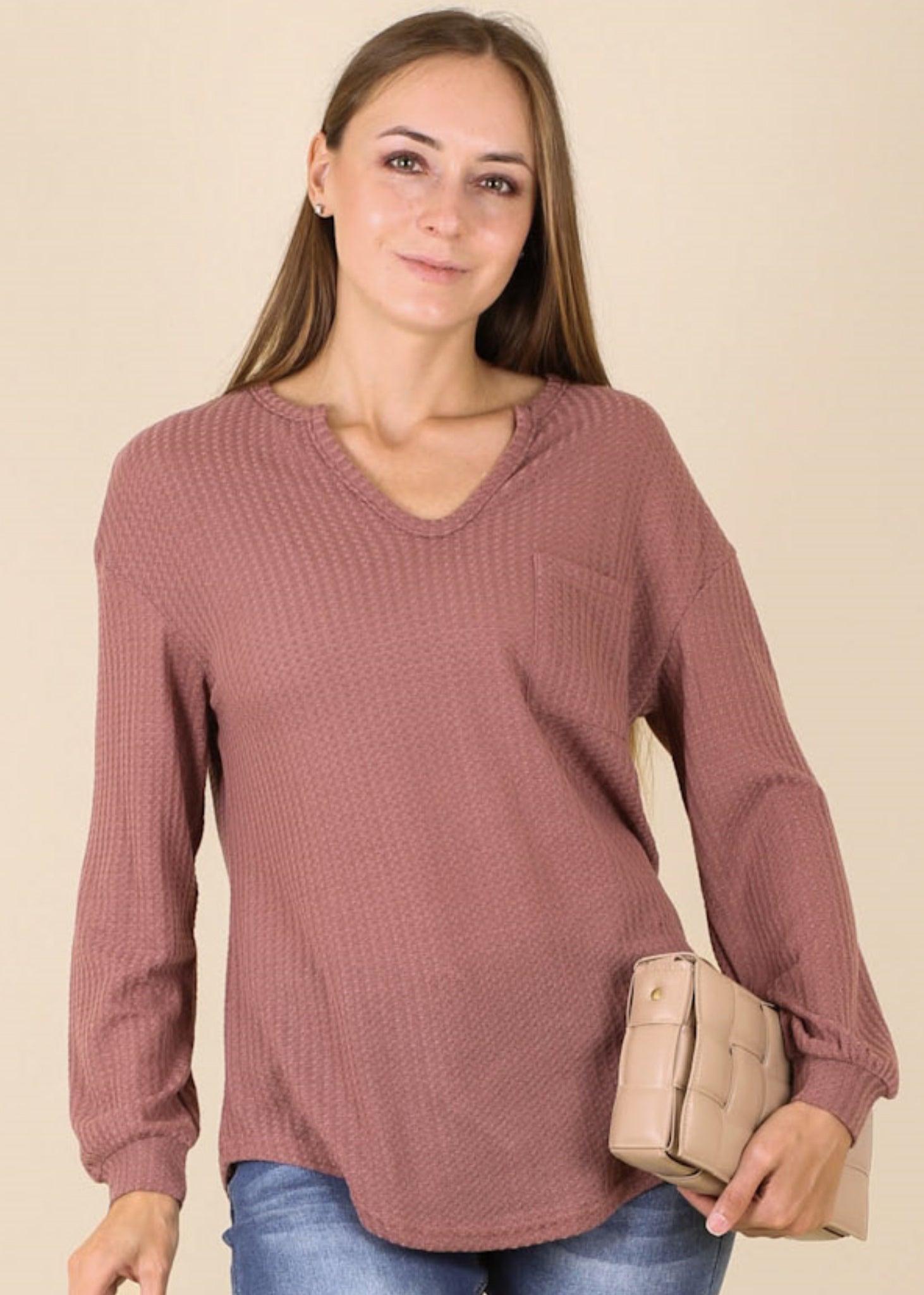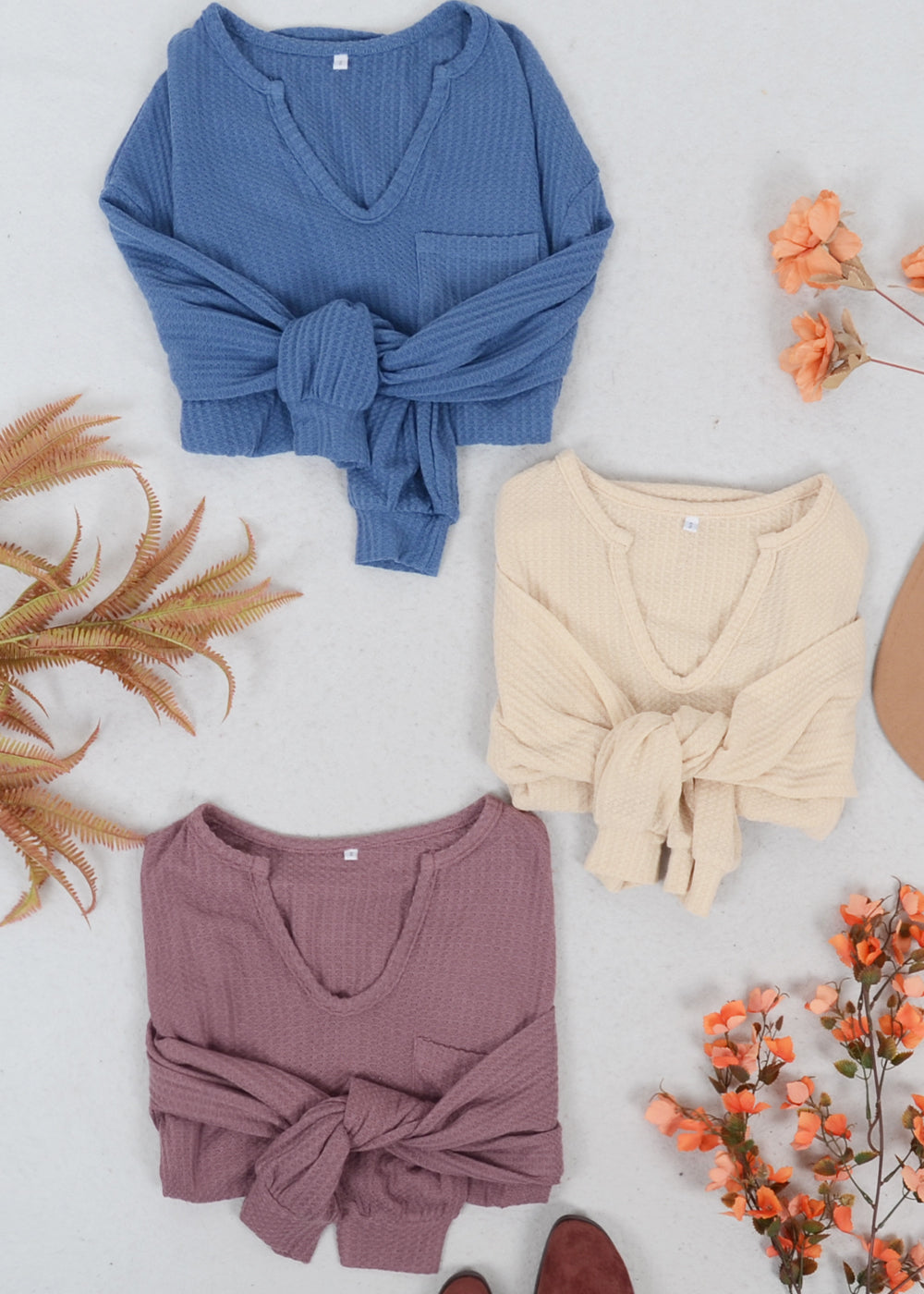 The Anna-Kaci sweater is detailed with a beautiful waffle knit material. Features solid color, v neck line, drop shoulder, patch pocket, long sleeves, and loose fit. Pair it with jeans and boots for a laidback look.