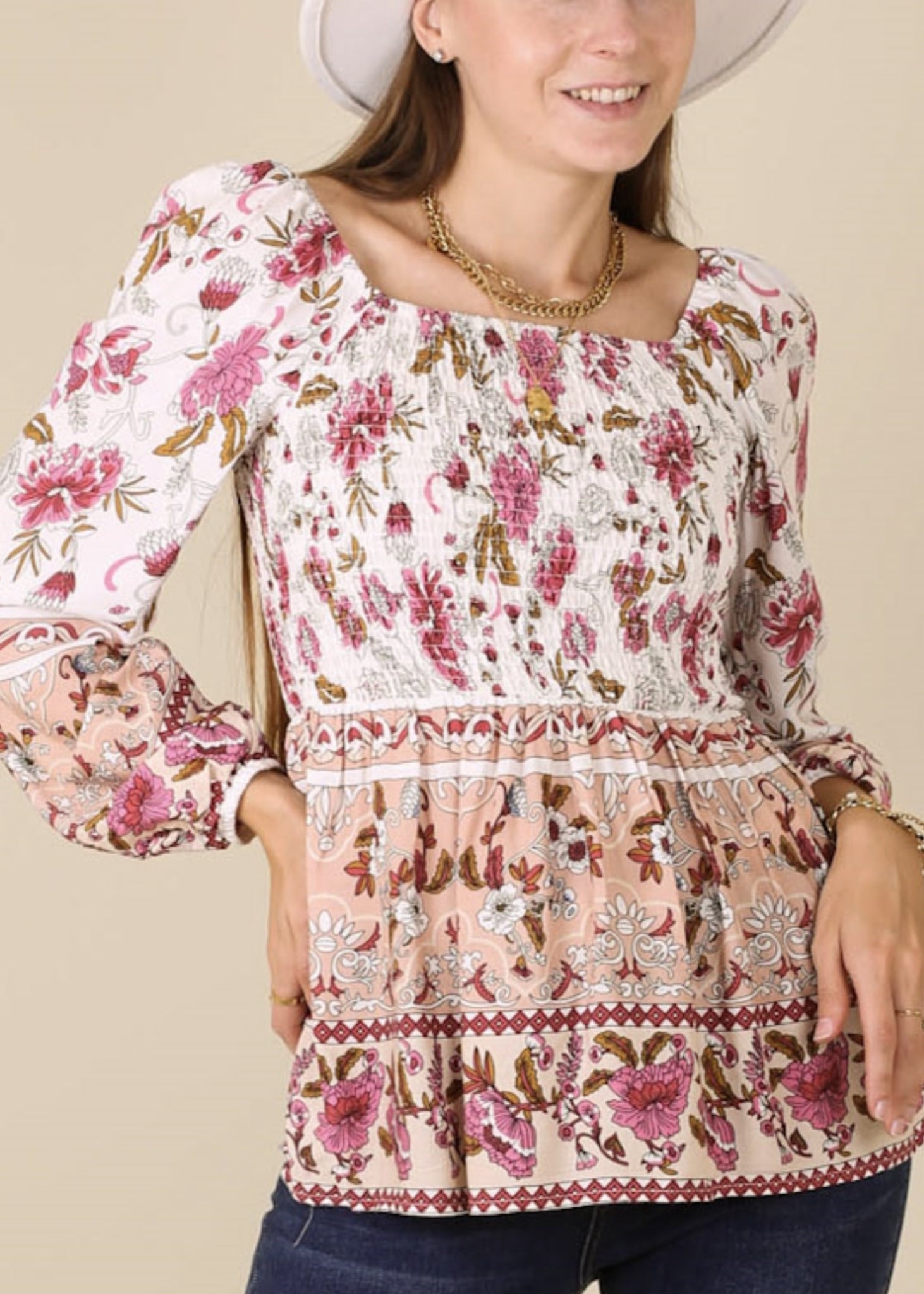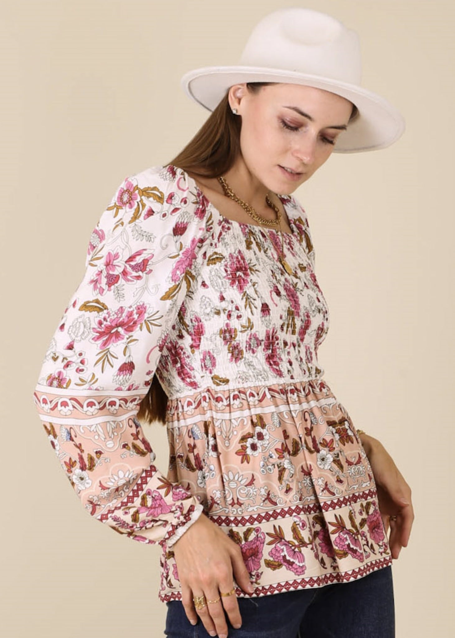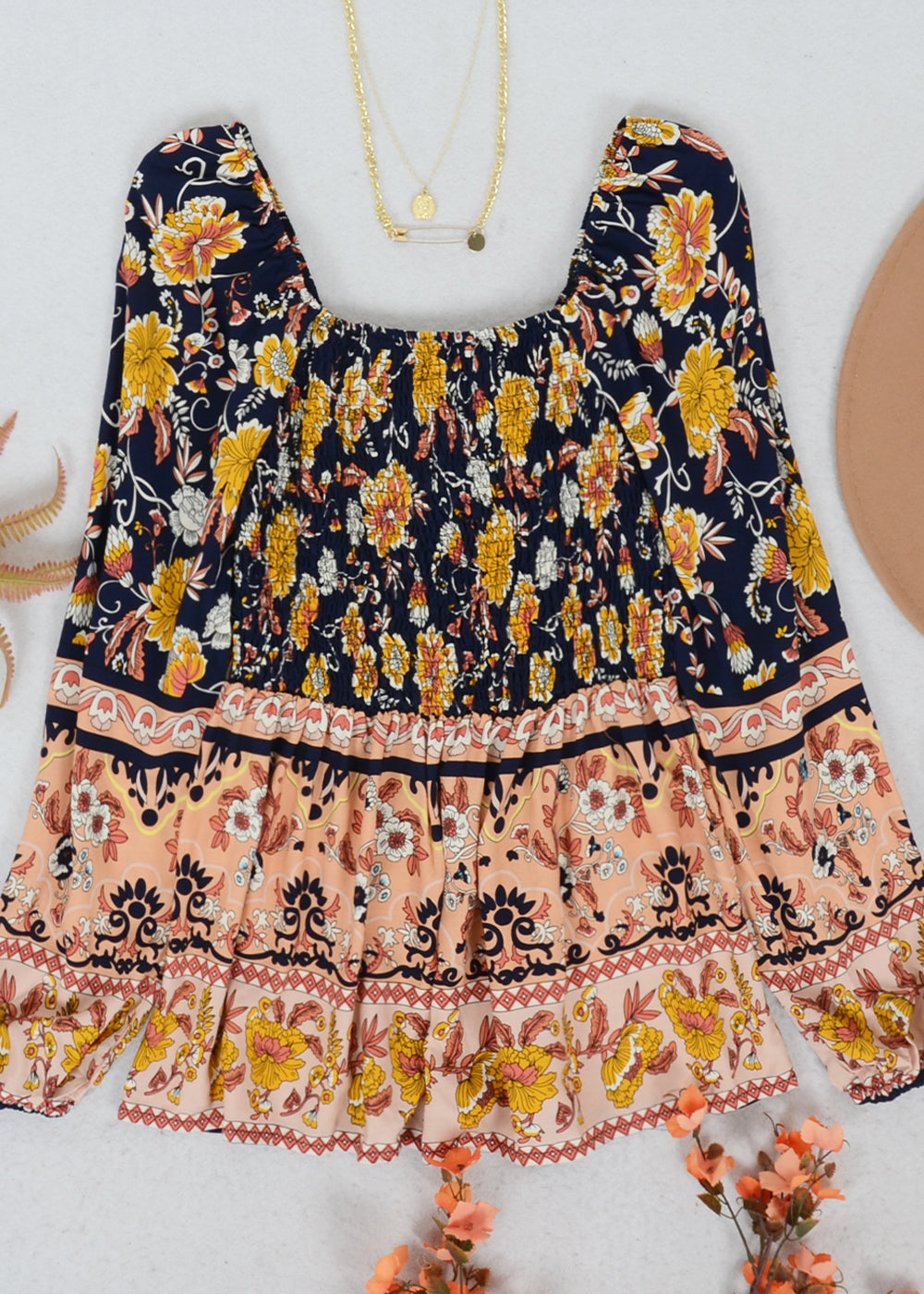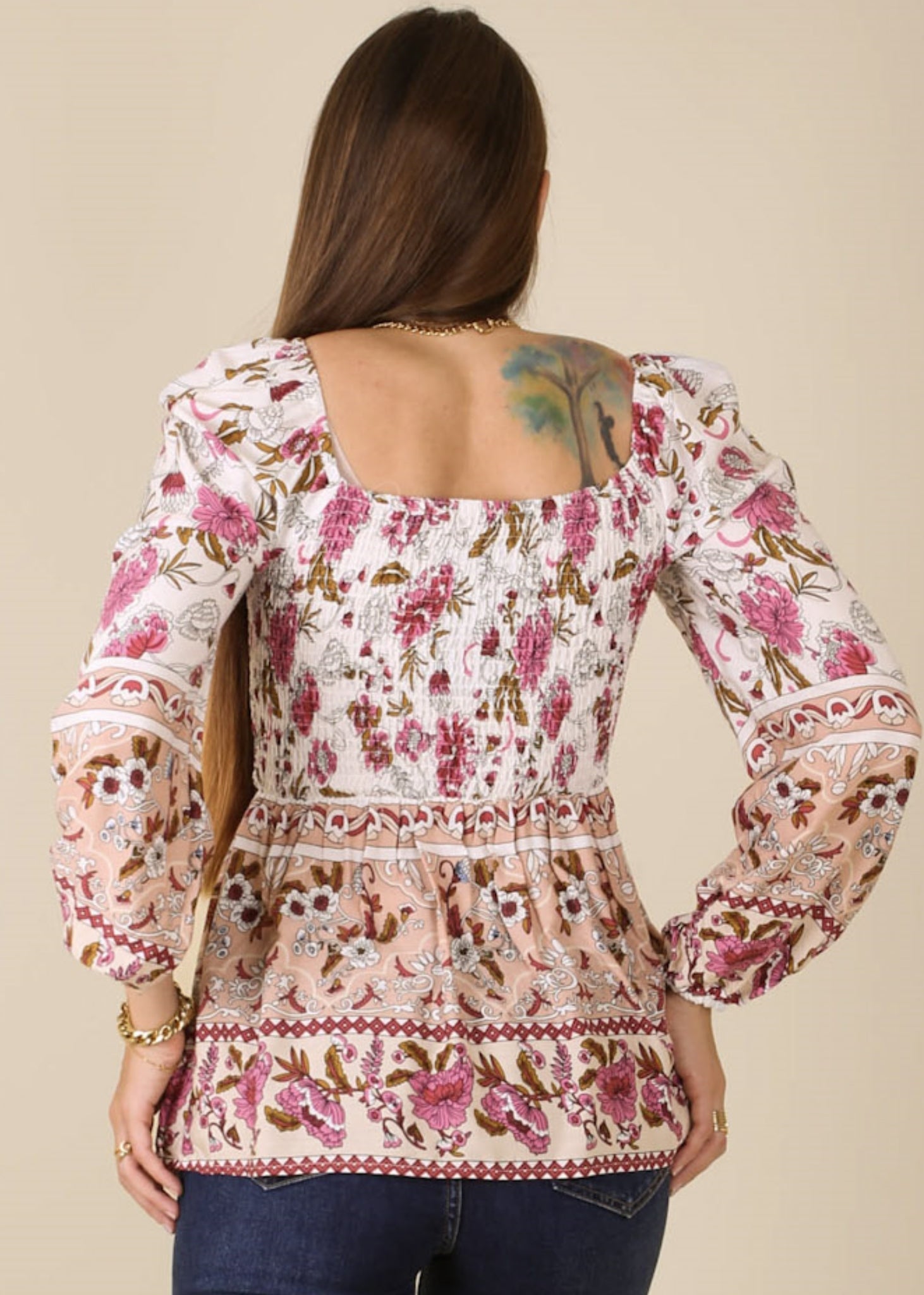 The Anna-Kaci top is detailed with a gorgeous multicolor floral print. Features a square neck line, long sleeves, shirred bodice, and peplum hem. Pair it with jeans and sandals for a fabulous look.