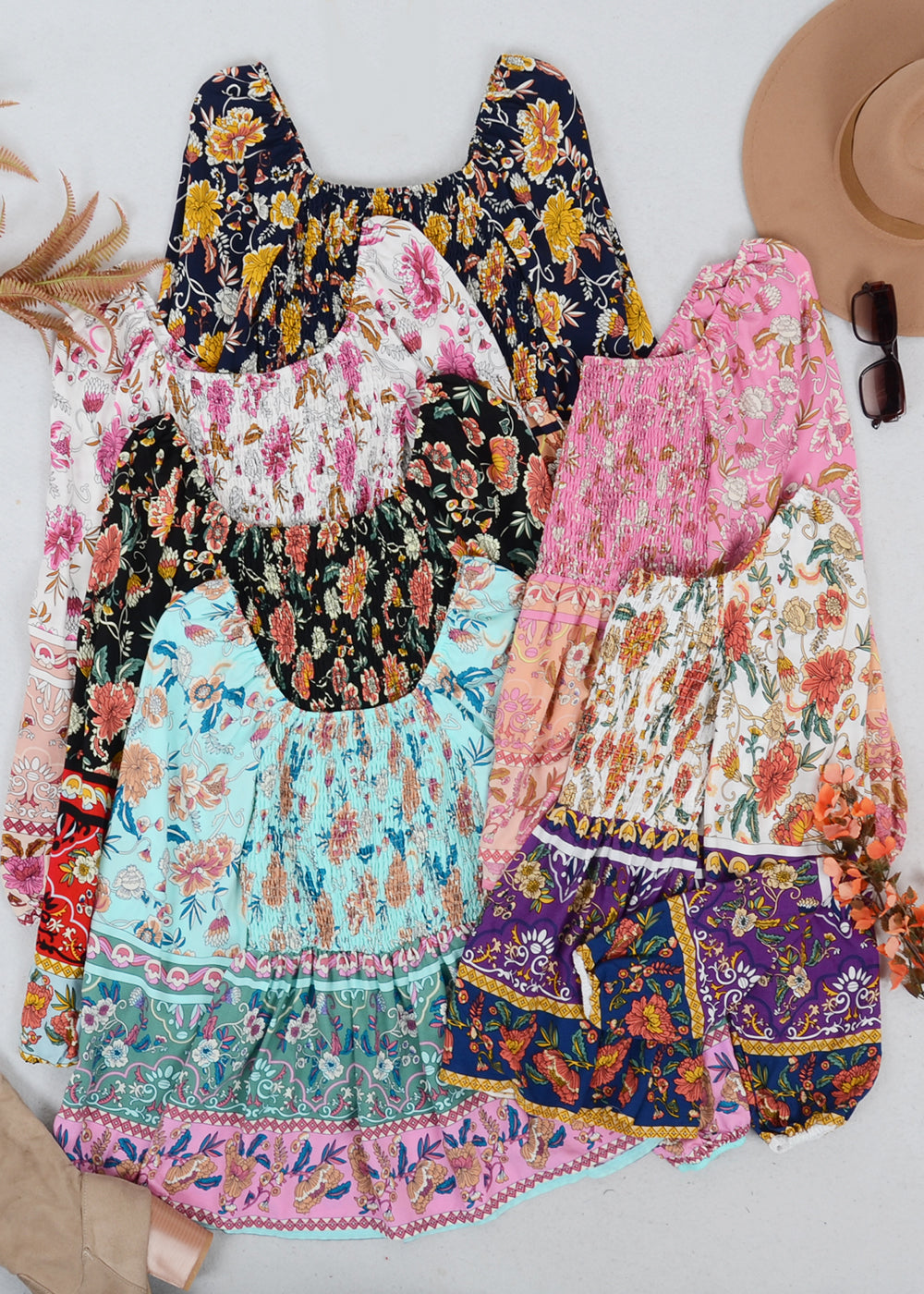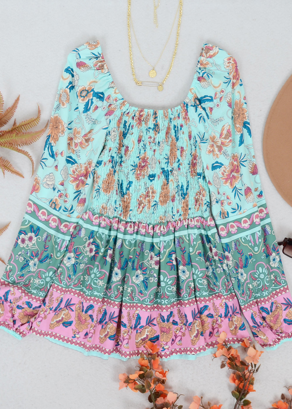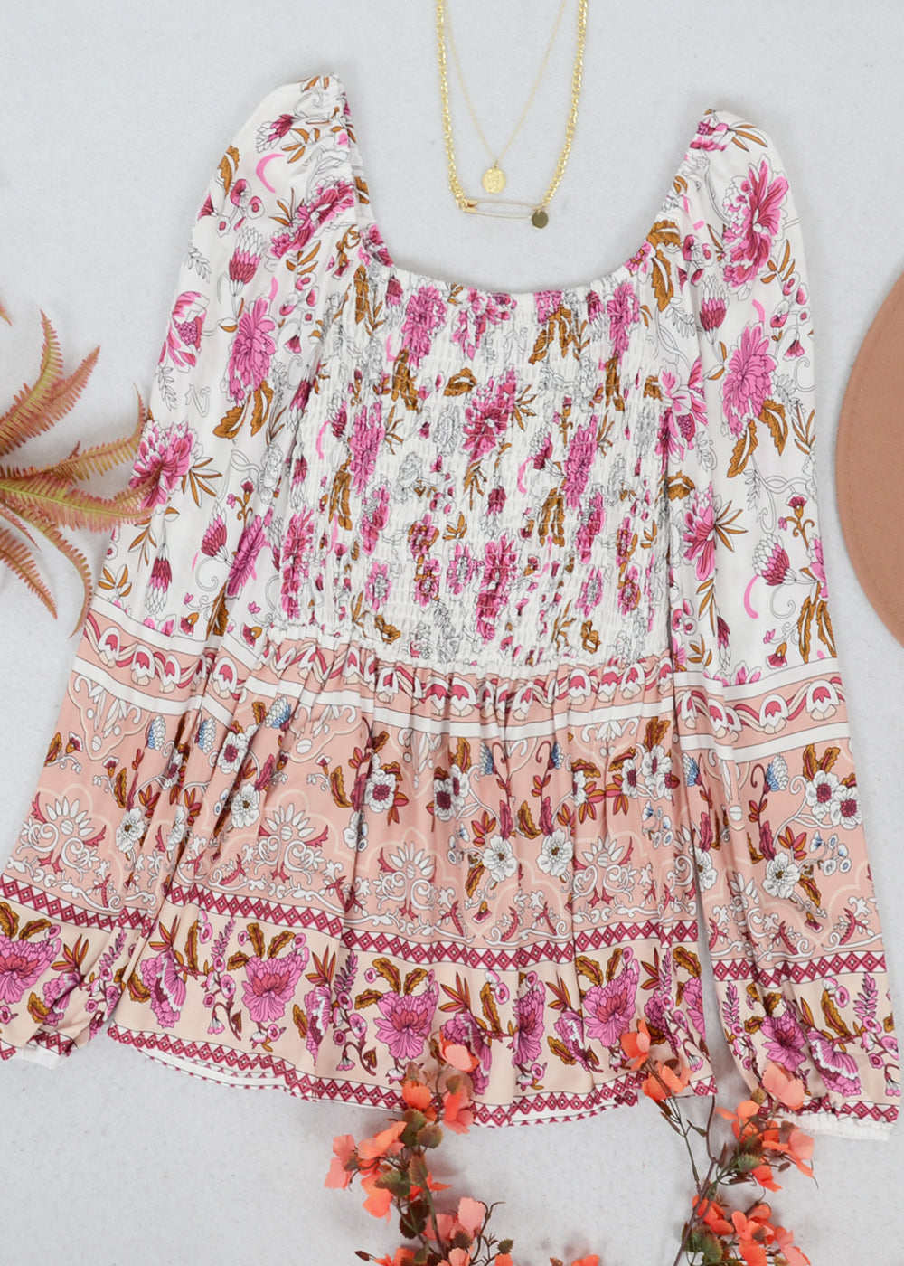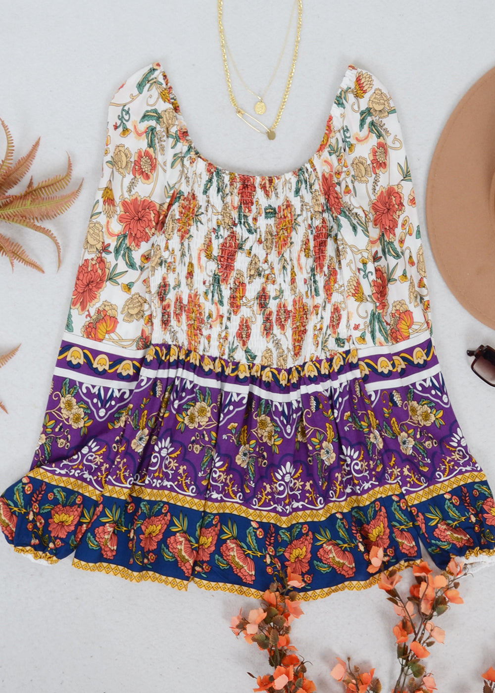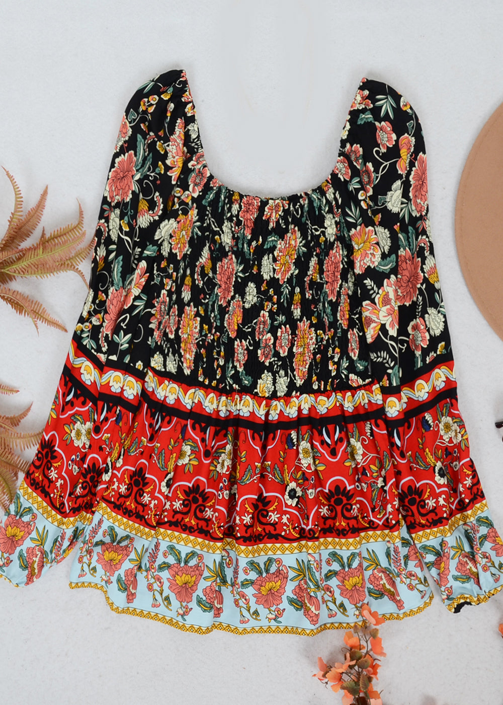 The Anna-Kaci top is detailed with a gorgeous multicolor floral print. Features a square neck line, long sleeves, shirred bodice, and peplum hem. Pair it with jeans and sandals for a fabulous look.