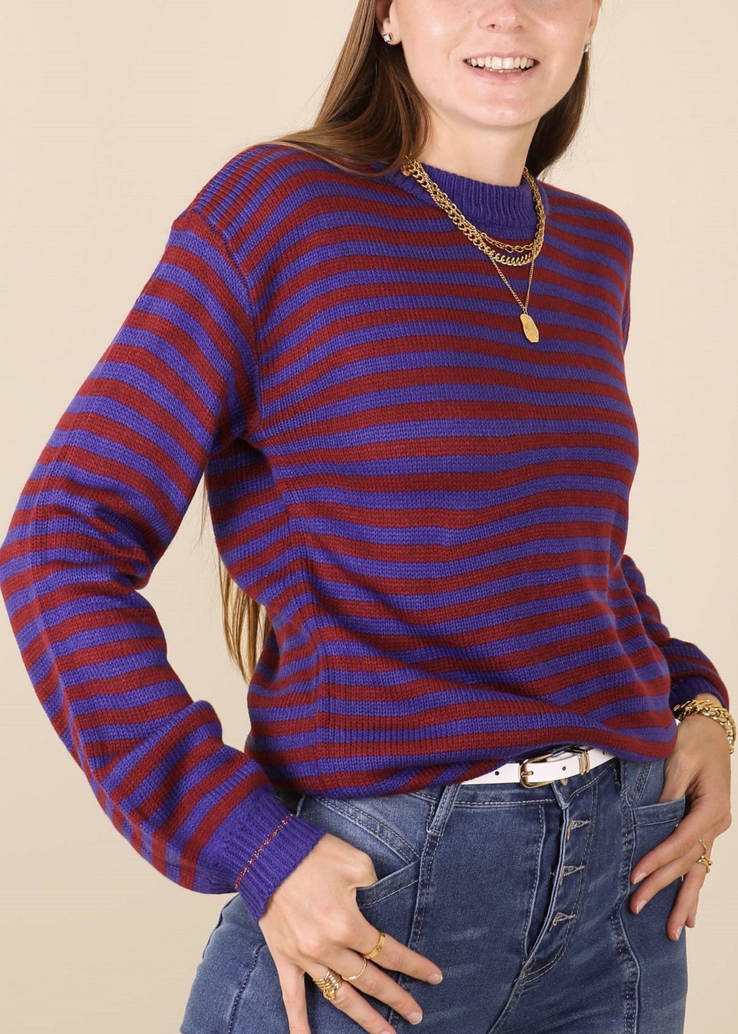 The Anna-Kaci sweater is designed with fun and eye catching horizontal stripe patterns. Features a round collar neckline, long sleeves with cuffs and hem, and a relaxed oversized fit. Pair with denim for a chic and relaxed look.