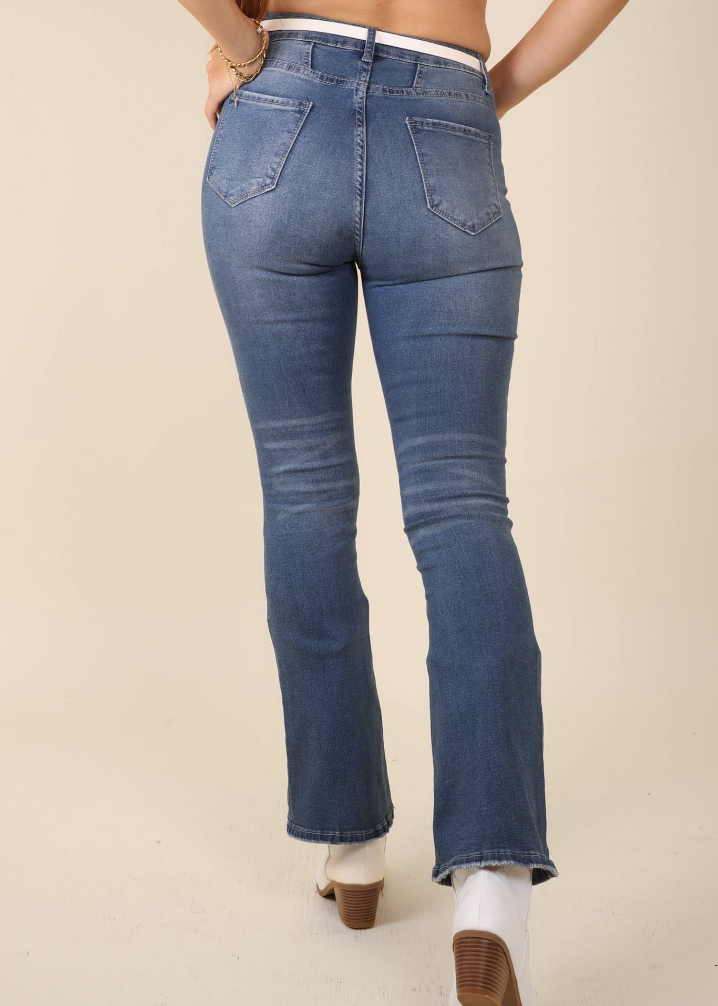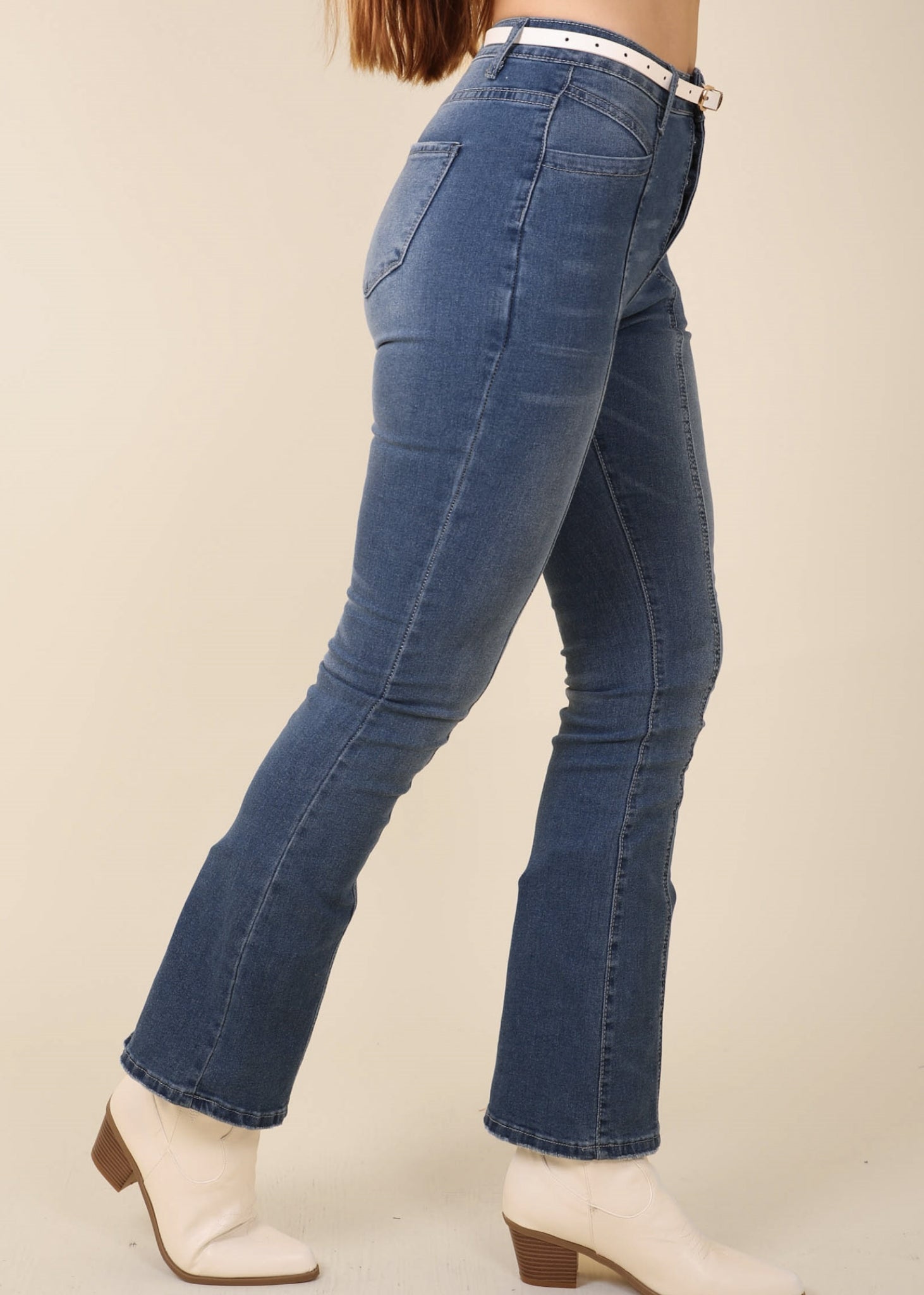 The jeans are detailed with an edgy middle seam. Features a high waist, multi-button design, flared silhouette, and denim material. Pair it with a cropped tee and sneakers for a laidback look.