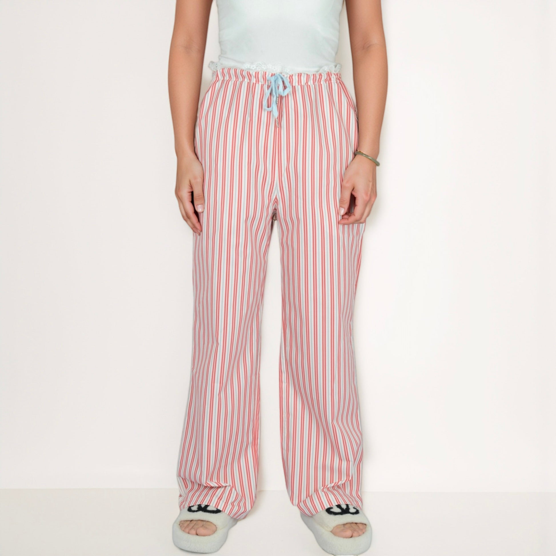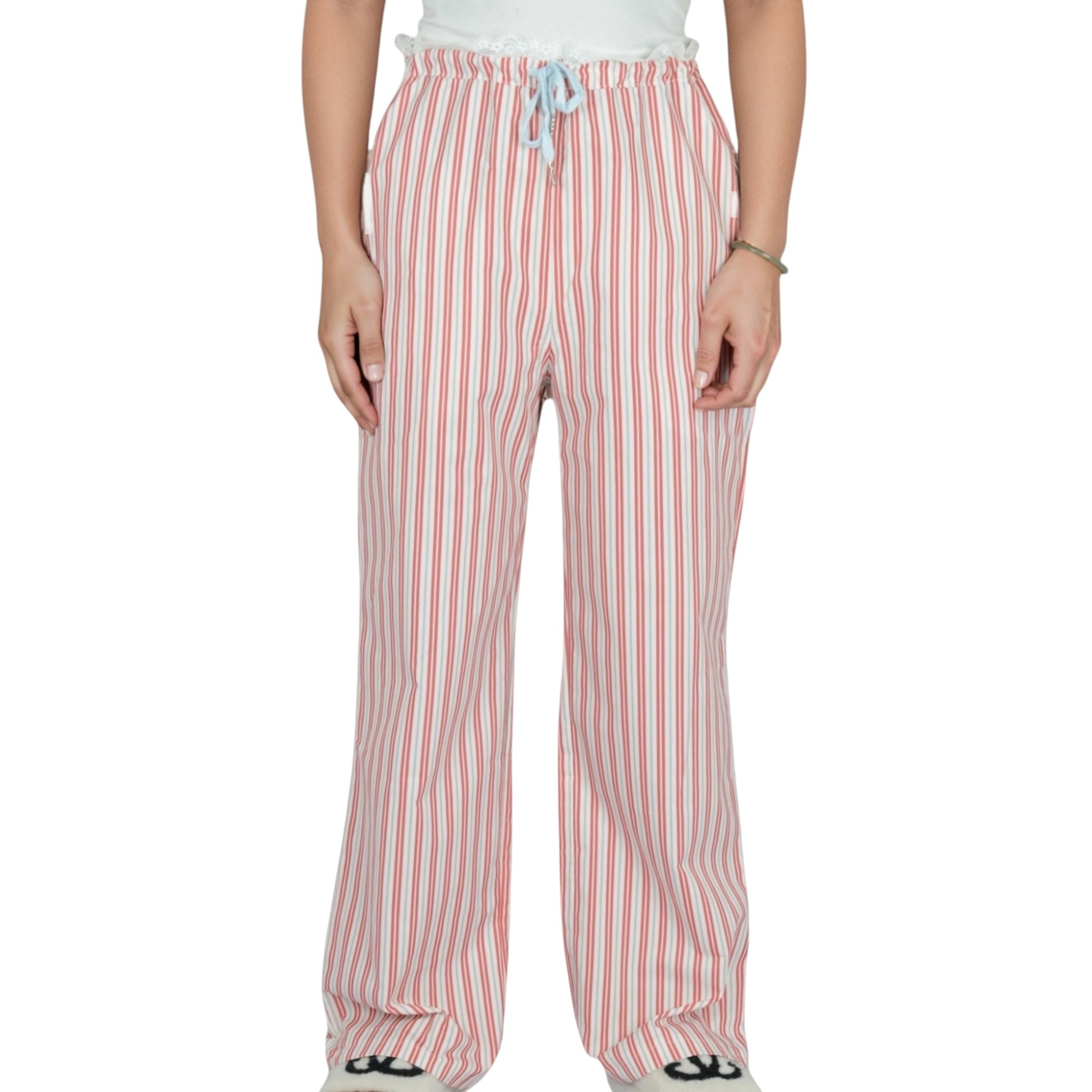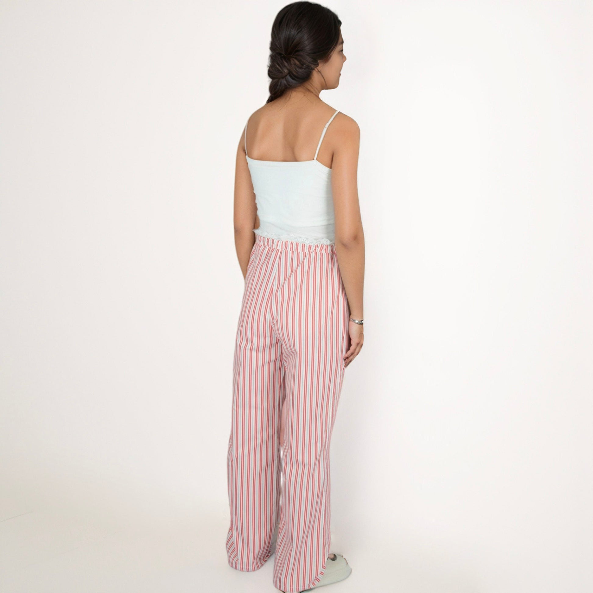 These women's lounge pants feature a playful vertical stripe pattern with a soft, relaxed silhouette. Designed with a stretch waistband and adjustable drawstring tie in a contrasting pastel blue, they offer customizable comfort for lounging or sleep. The lightweight fabric allows for easy movement and all-day wearability. Perfect for cozy nights in or casual days at home, these pants blend function with fun style.