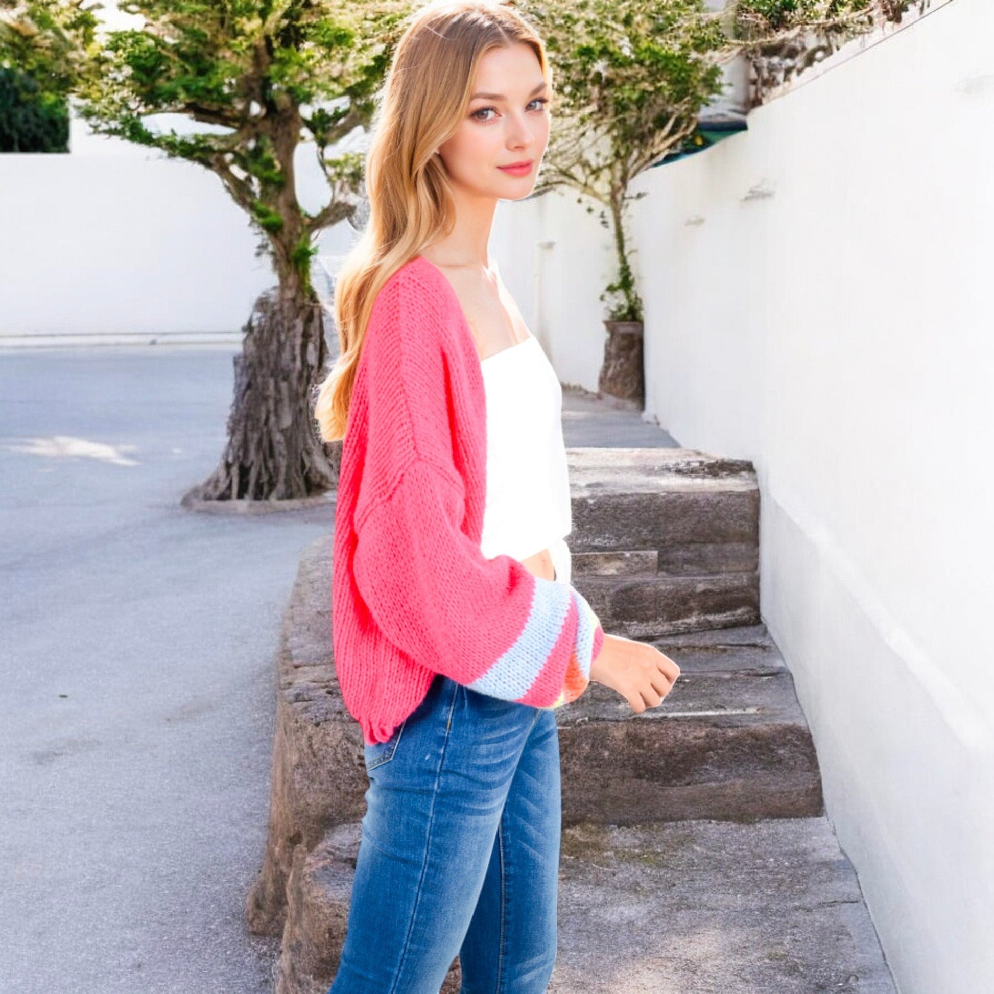 Add a splash of color to your wardrobe with this vibrant Anna-Kaci Women's Open Knit Cardigan, featuring bold stripes on the sleeves and a relaxed, oversized fit. The playful balloon sleeves create a fun silhouette, while the lightweight knit fabric makes it perfect for layering over any casual outfit. Whether you're headed out for a cozy day or looking to add some flair to your look, this cardigan offers both comfort and style. Perfect for pairing with jeans or dresses for a versatile, eye-catching ensemble.