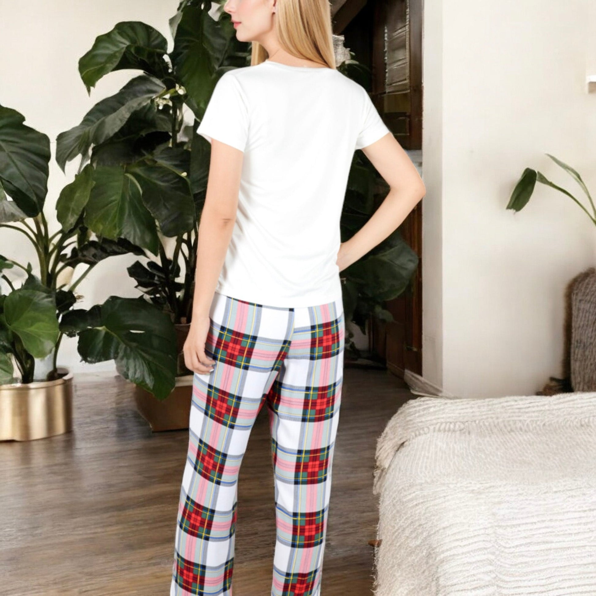 This Anna-Kaci Women's Cozy Pajama Set features a soft short sleeve V-neck tee paired with classic plaid pants, offering a relaxed fit for ultimate comfort. Perfect for lounging or a good night's sleep, the breathable fabric ensures all-day wearability. The stylish plaid design adds a fun touch, while the tee provides a versatile piece that can be mixed and matched with your favorite lounge essentials. Ideal for cozy evenings or lazy weekends.