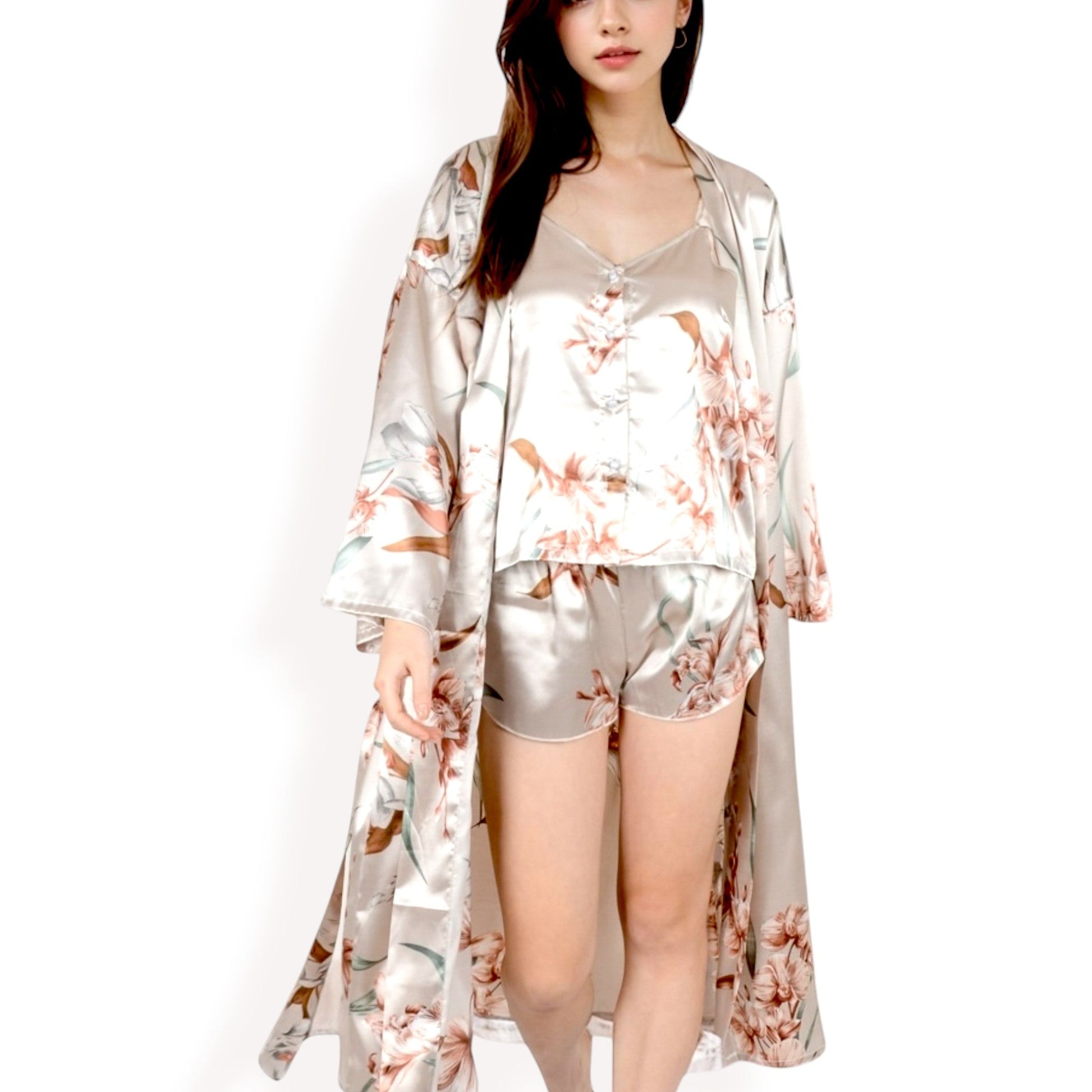 Floral Satin Kimono Robe with Matching Cami Top and Shorts
