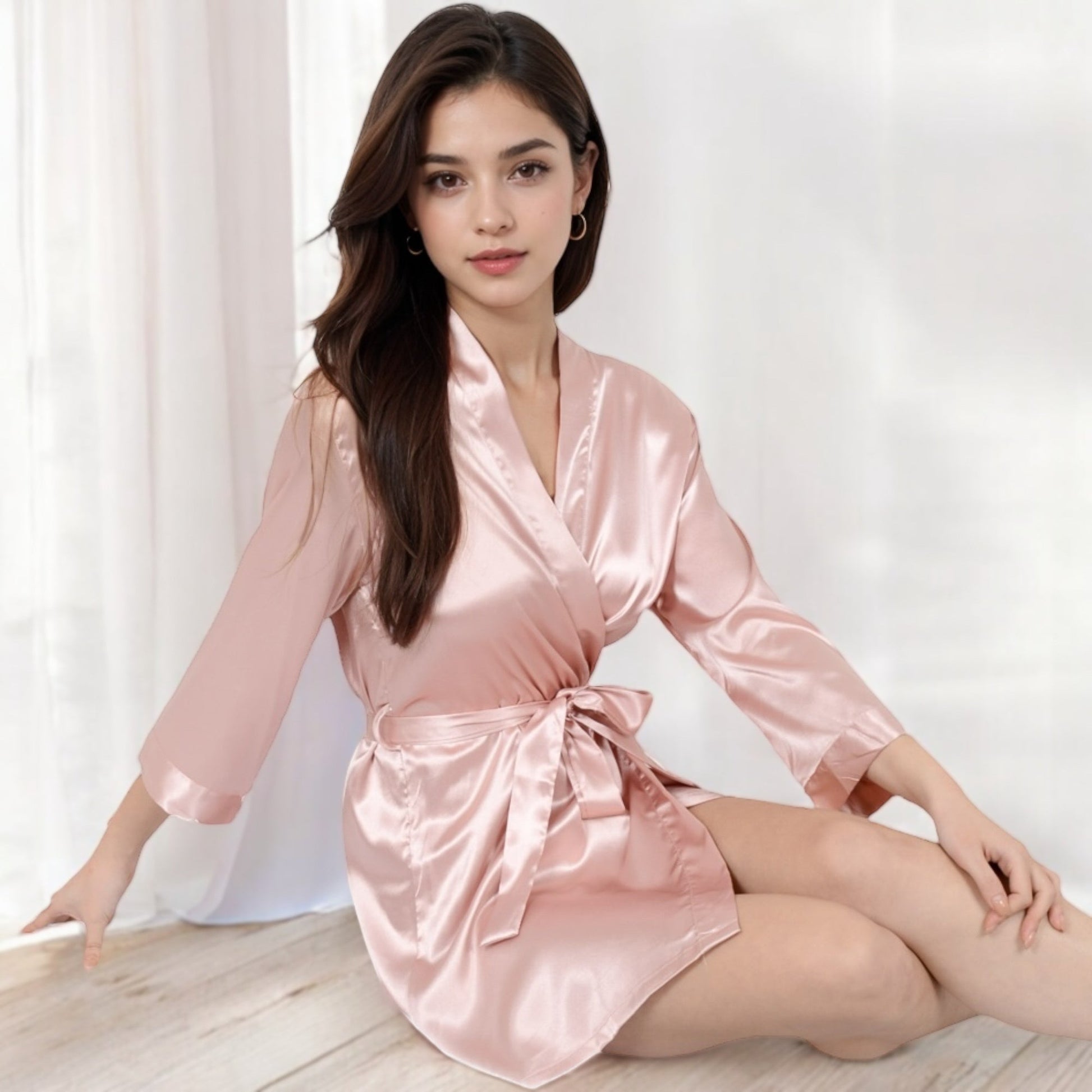 Short Satin Robe with Waist Tie and Three-Quarter Sleeves