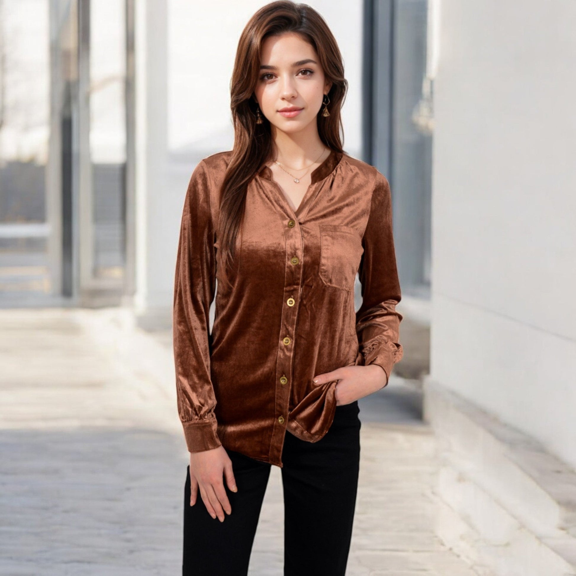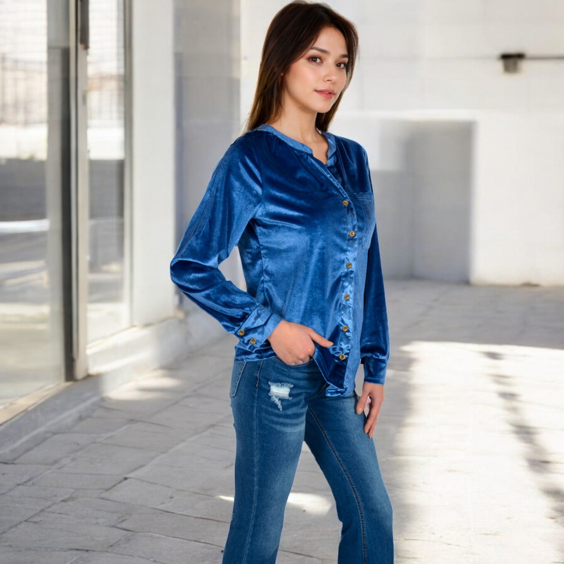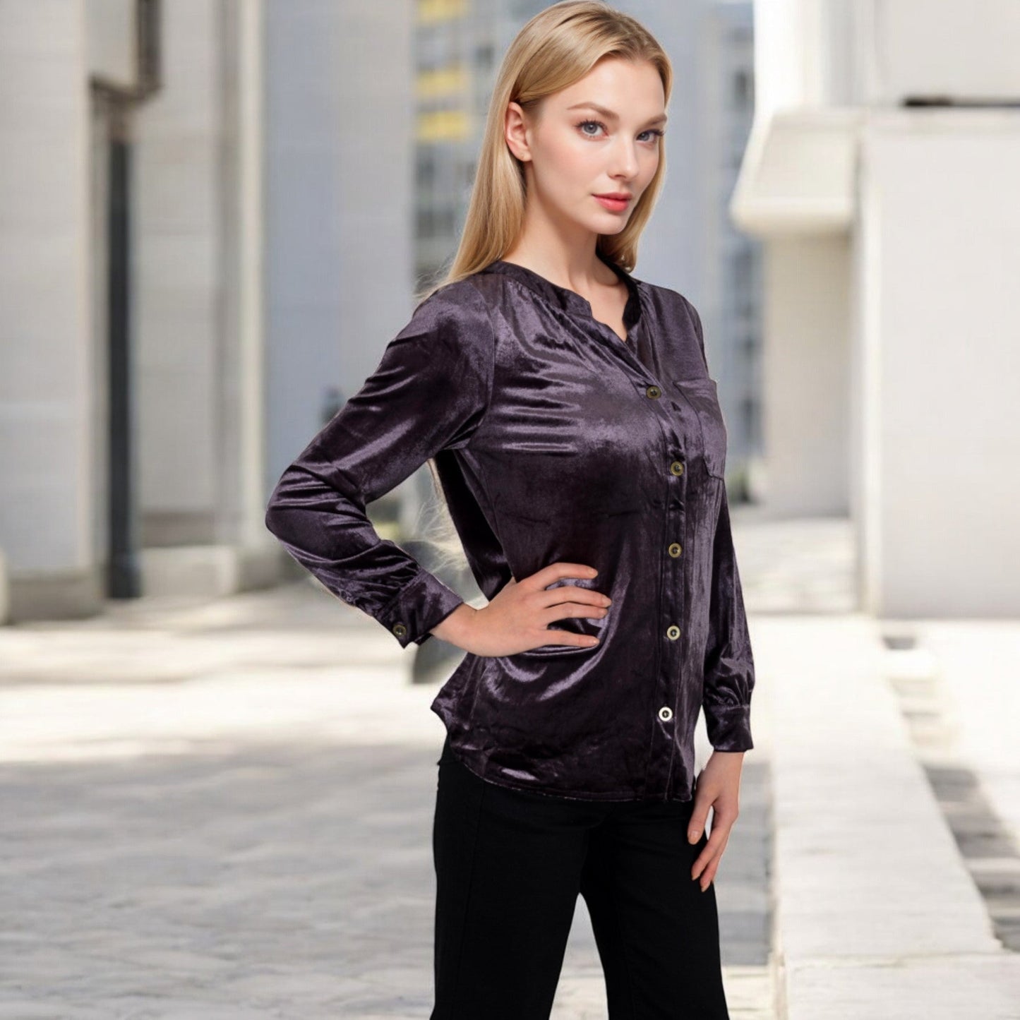 Anna-Kaci Women's Velvet Button-Down Shirt combines a luxurious texture with a timeless design for a sophisticated yet casual look. Featuring a classic button-down front, long sleeves, and a single chest pocket, this shirt offers both elegance and functionality. The soft velvet fabric enhances its style, making it perfect for dressing up or down. Pair it with your favorite denim or tailored pants for versatile outfits that transition effortlessly from day to evening.