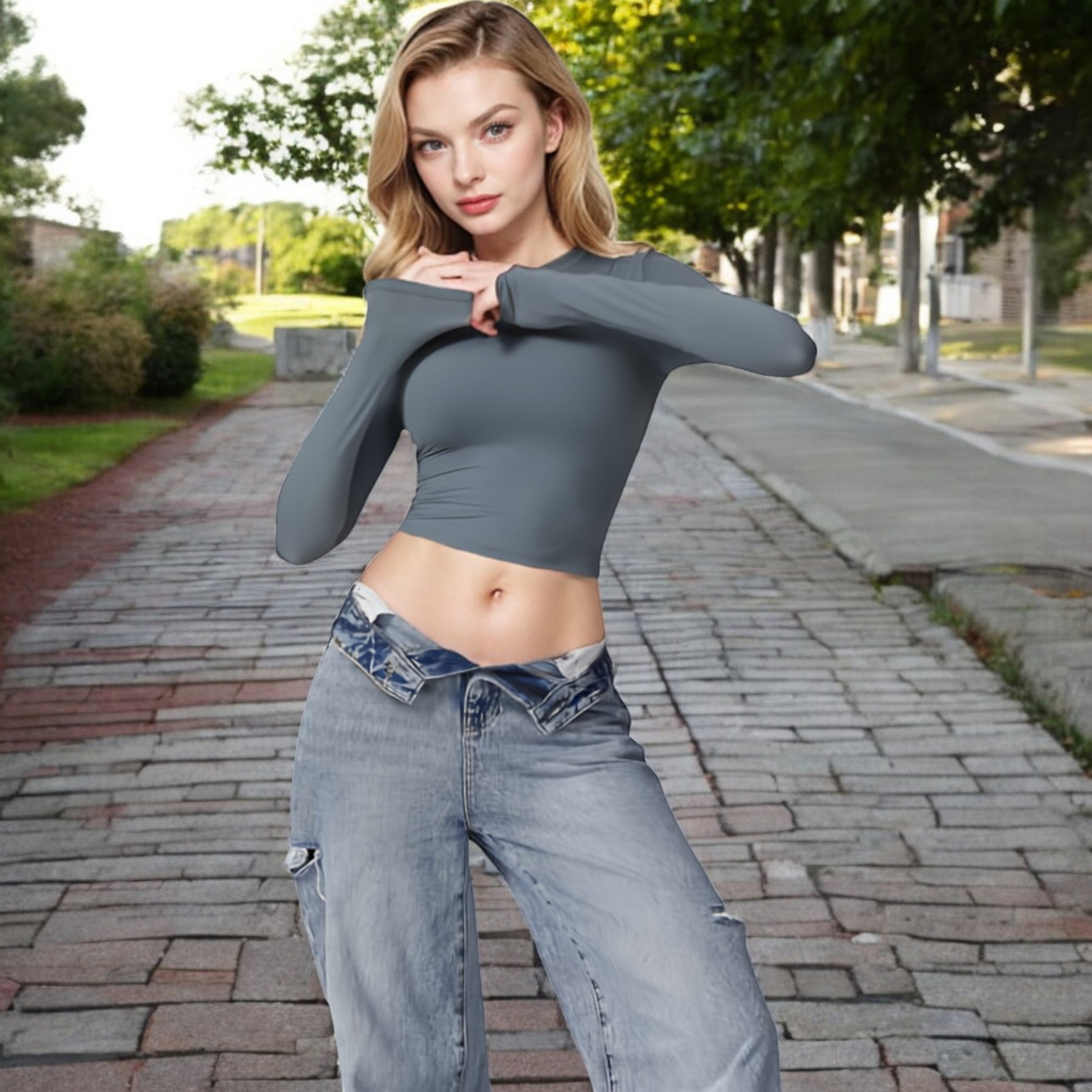 The Anna-Kaci Women's Long Sleeve Cropped Crew Neck Top delivers a sleek and minimalist style perfect for everyday wear. This fitted crop top features a classic crew neckline and a streamlined silhouette, offering versatility and comfort. Ideal for pairing with high-waisted jeans, skirts, or shorts, this top transitions seamlessly from casual outings to dressed-up occasions.