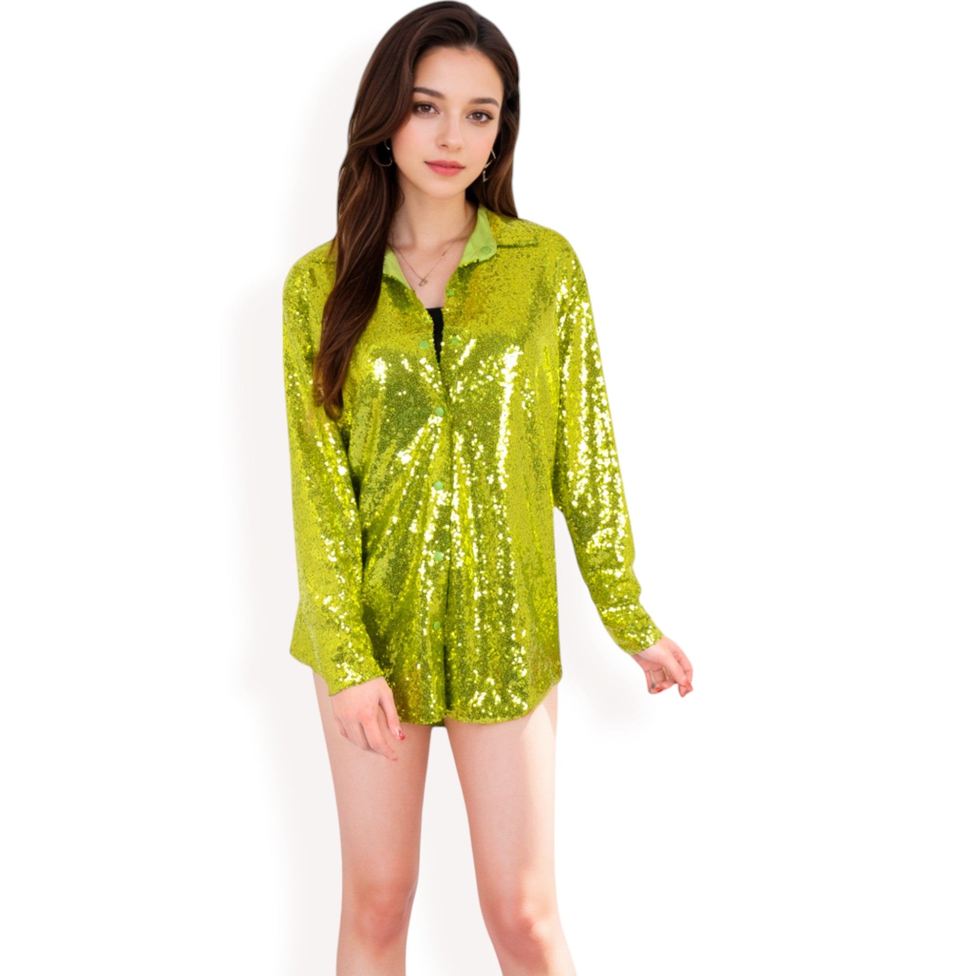 Anna-Kaci Women's Green Sequin Button-Down Shirt Dress with Long Sleeves is the perfect combination of bold style and glamour. Covered in shimmering sequins, this shirt dress adds an eye-catching touch to your wardrobe. The button-down front and long sleeves provide a relaxed yet polished fit, while the vibrant green color ensures you stand out in any crowd. Pair it with heels or sandals for a chic, dazzling look for your next special occasion or night out.