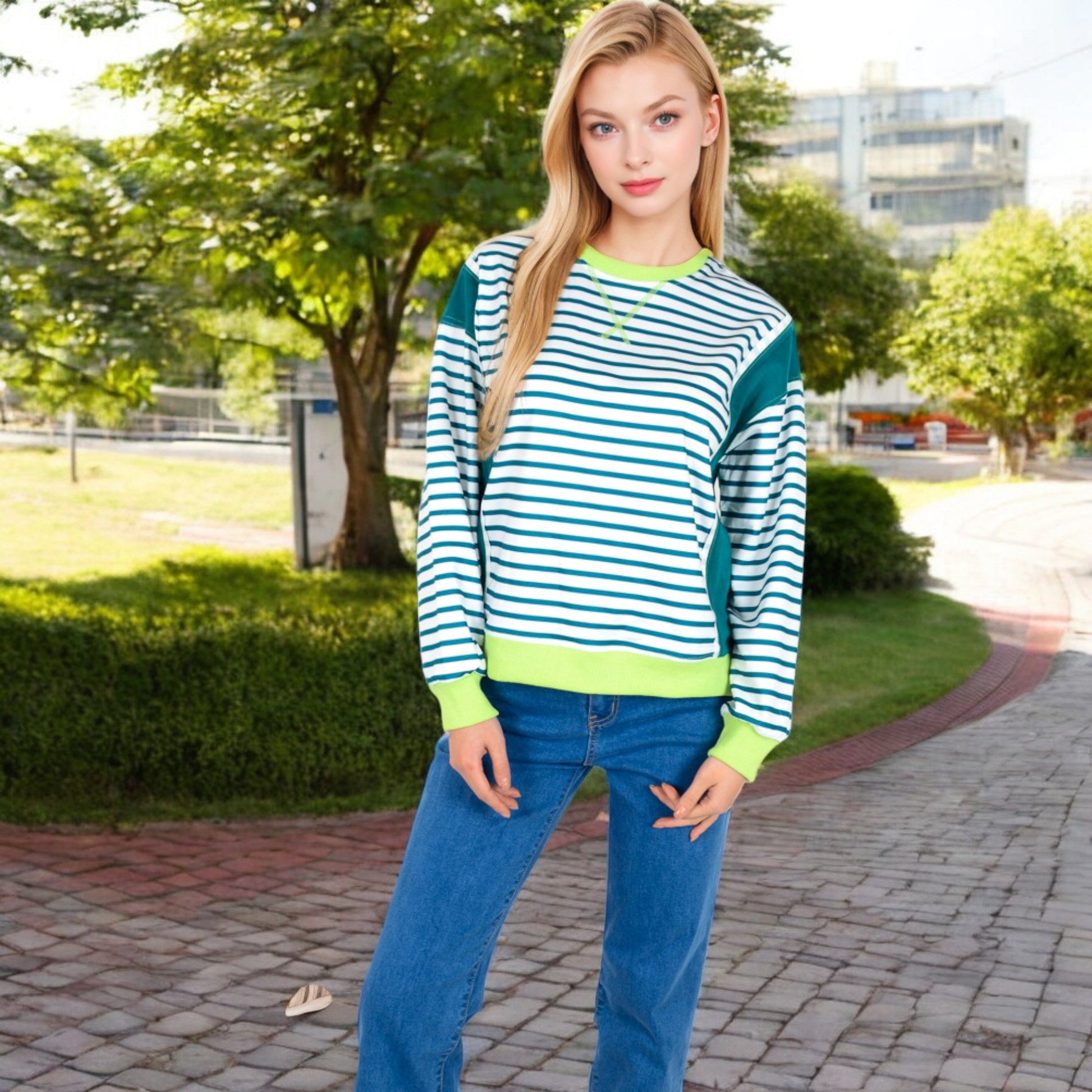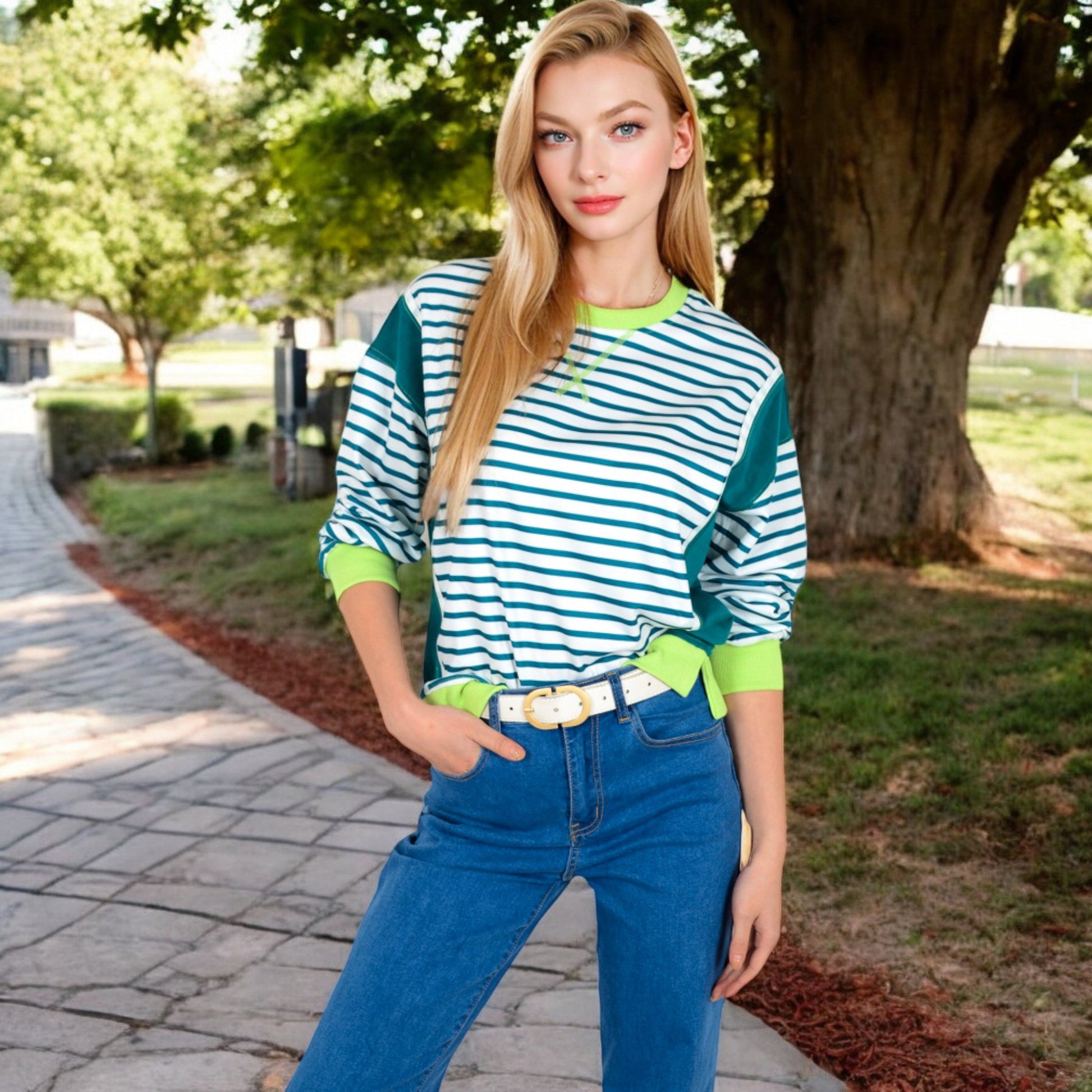 Striped Crew Neck Sweatshirt with Contrast Sleeves