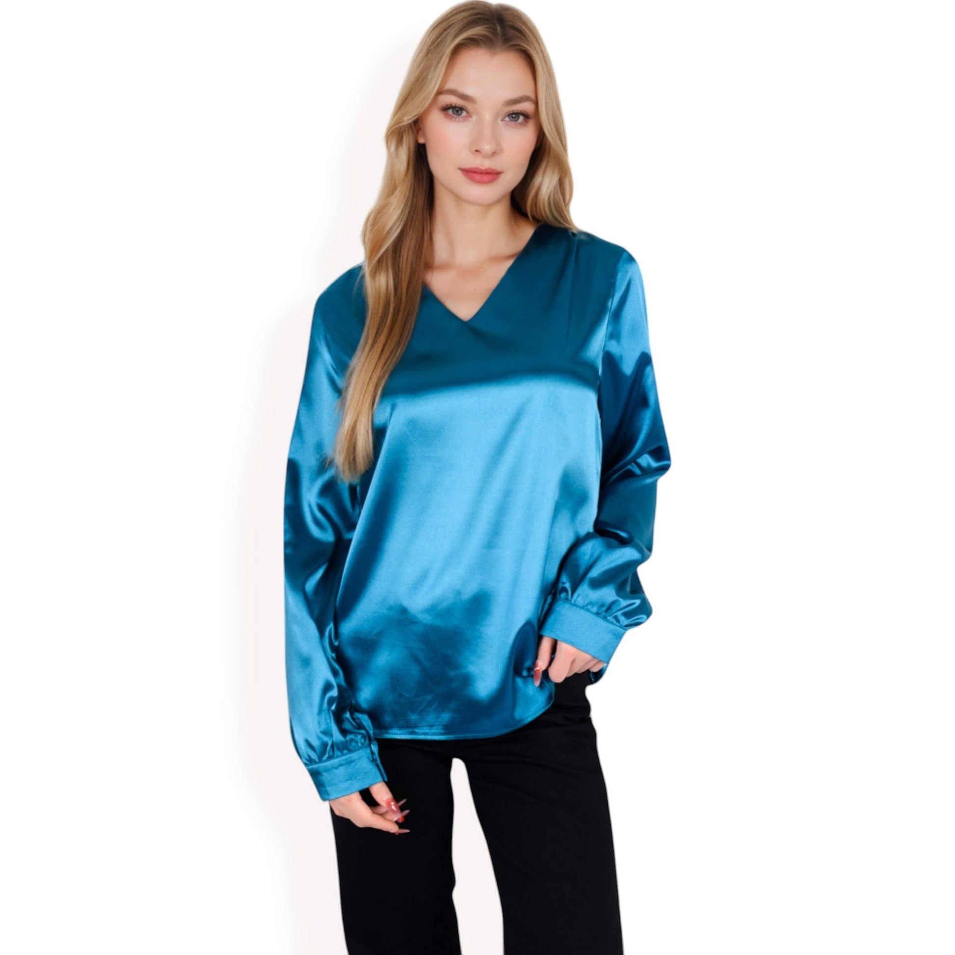 Satin Long Sleeve V-Neck Blouse with Cuffed Sleeves