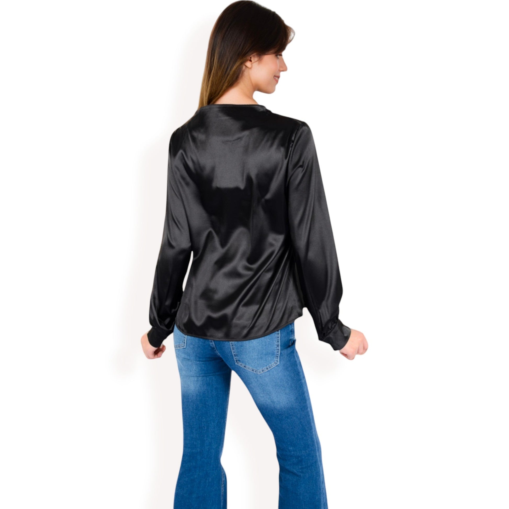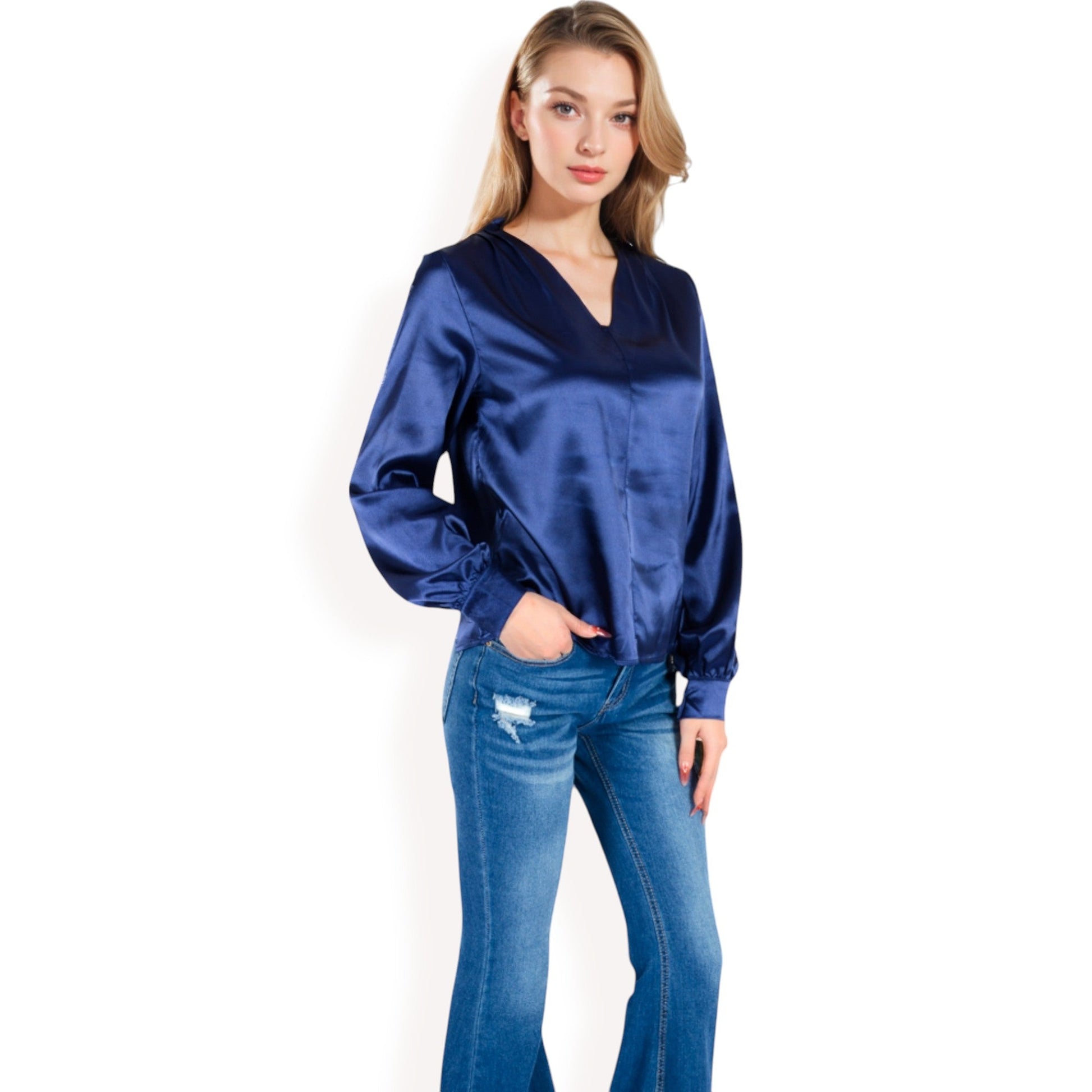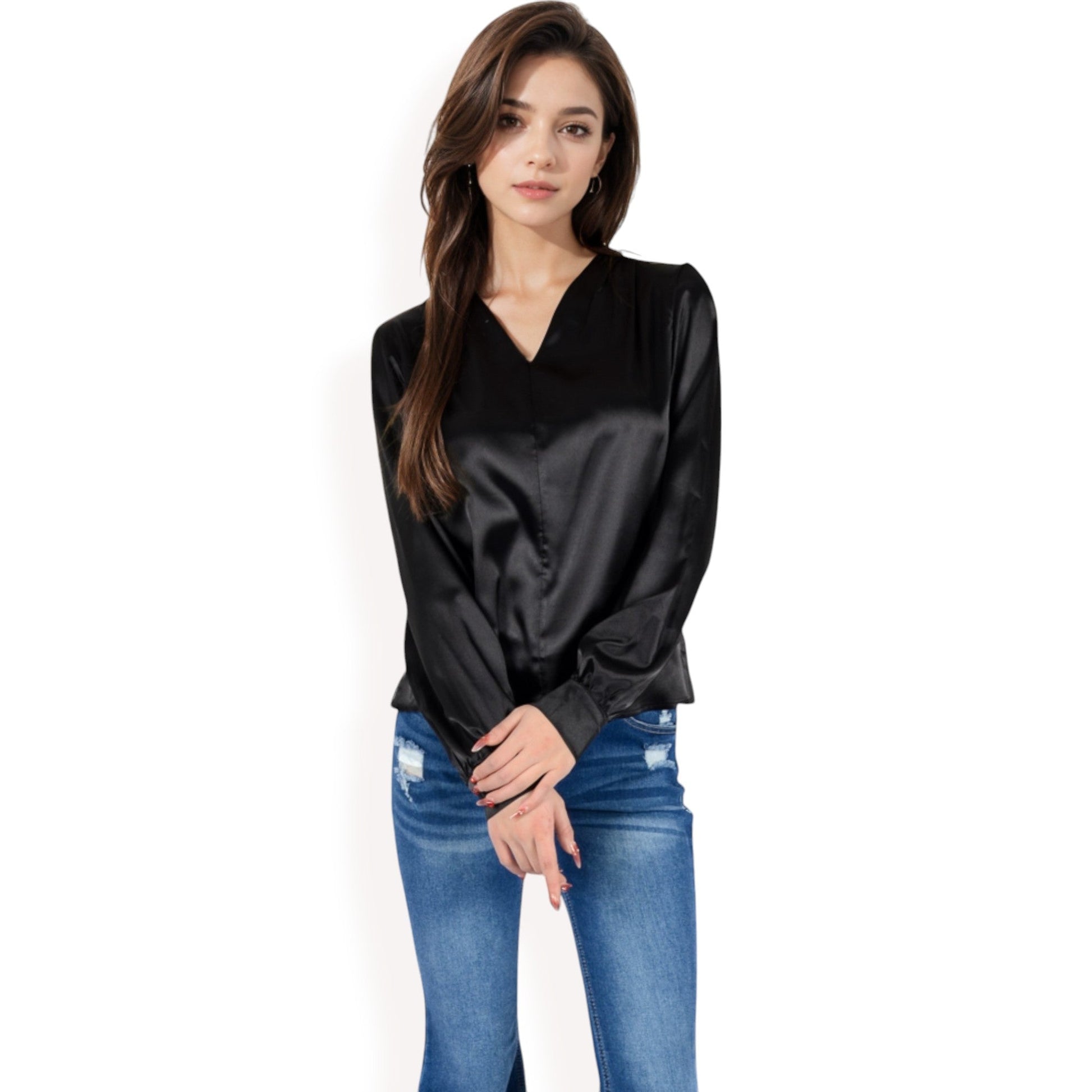 The Anna-Kaci Women's Satin V-Neck Blouse combines sleek style with luxurious comfort. Designed with a soft satin finish, this blouse features a flattering V-neckline and long sleeves for a sophisticated touch. Perfect for pairing with denim or dress pants, it¡¯s a versatile addition to any wardrobe.