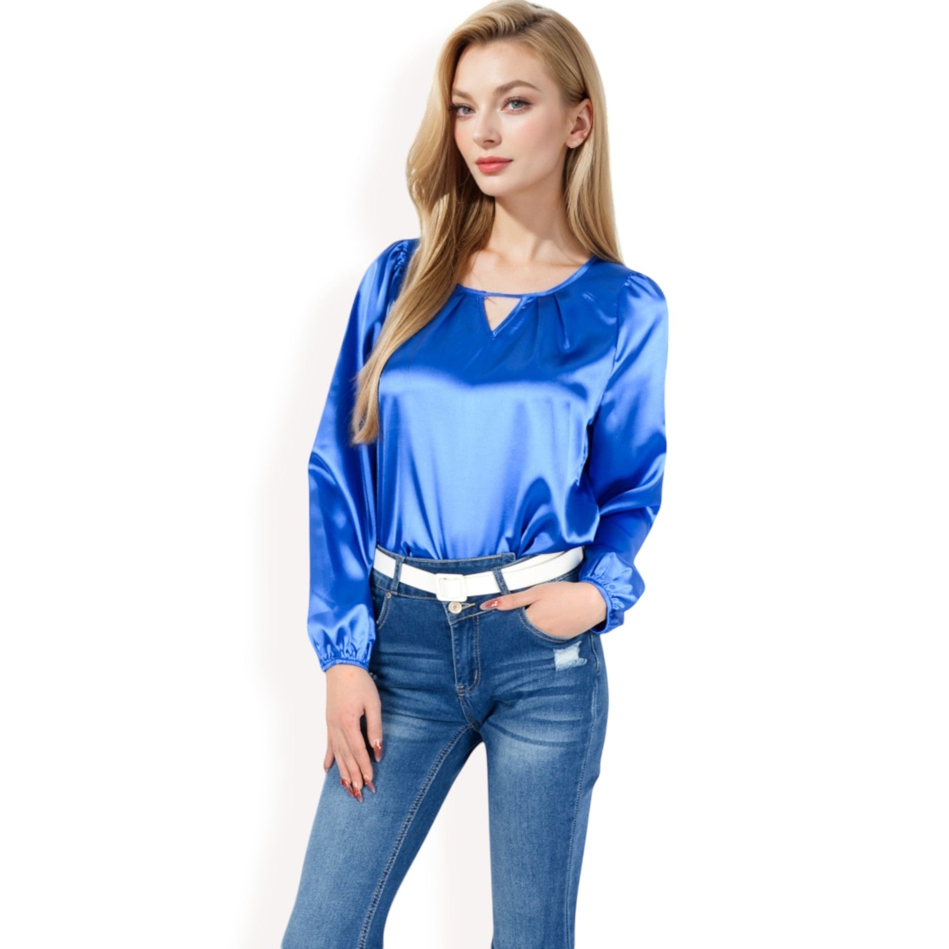 Satin Blouse with Keyhole Neckline and Long Sleeves