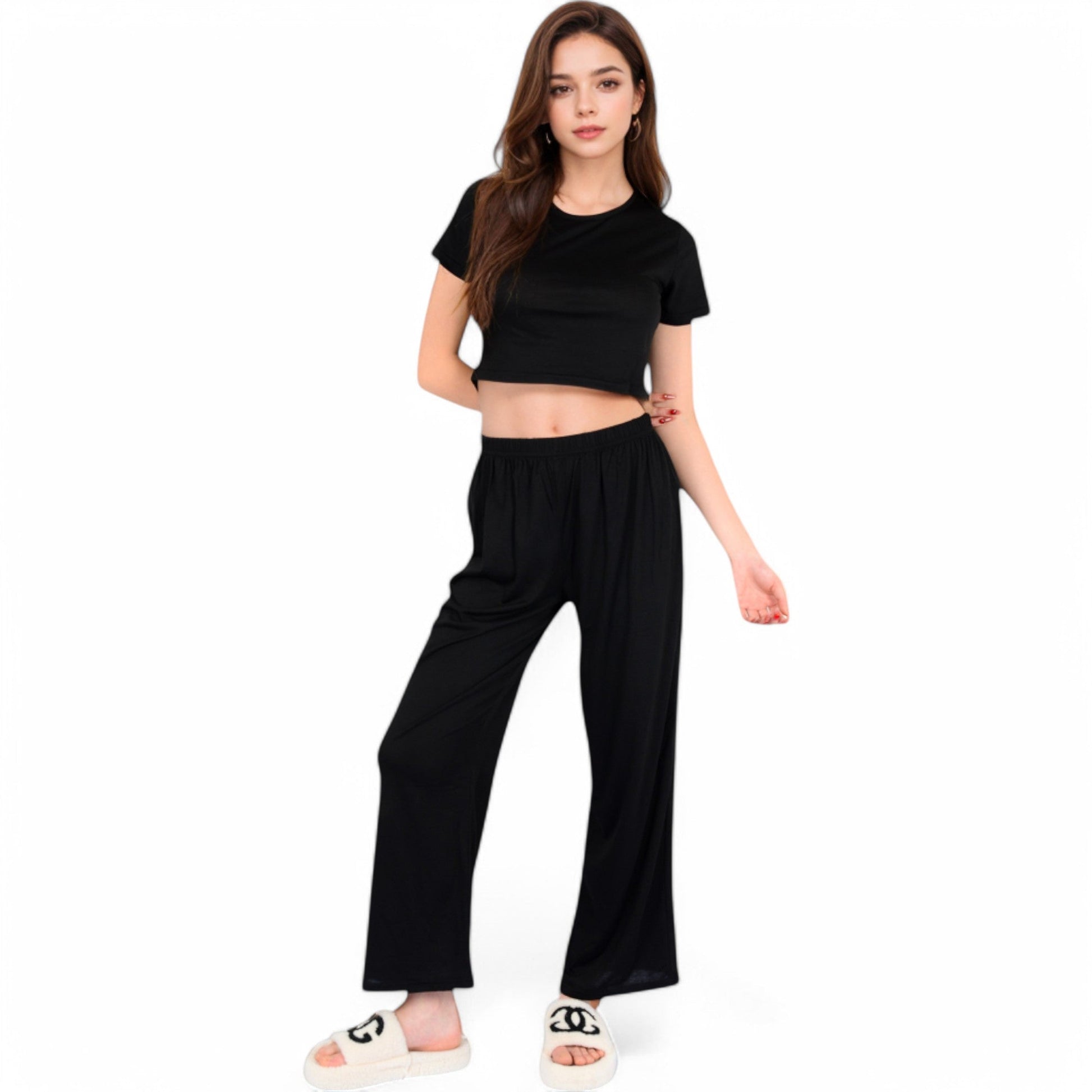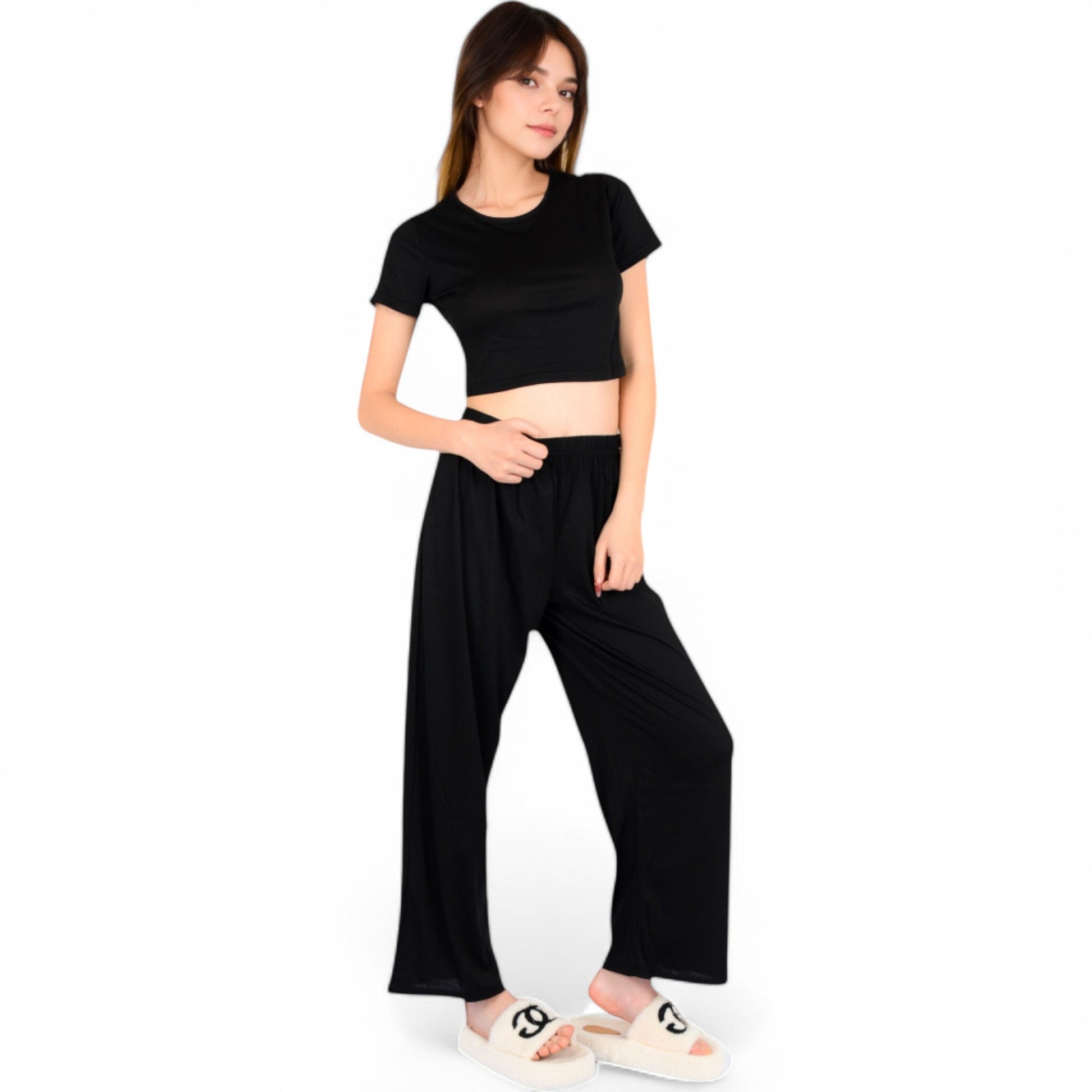 Minimalist Black Pajama Set with Soft Short Sleeve Crop Top and High Waist Wide-Leg Pants