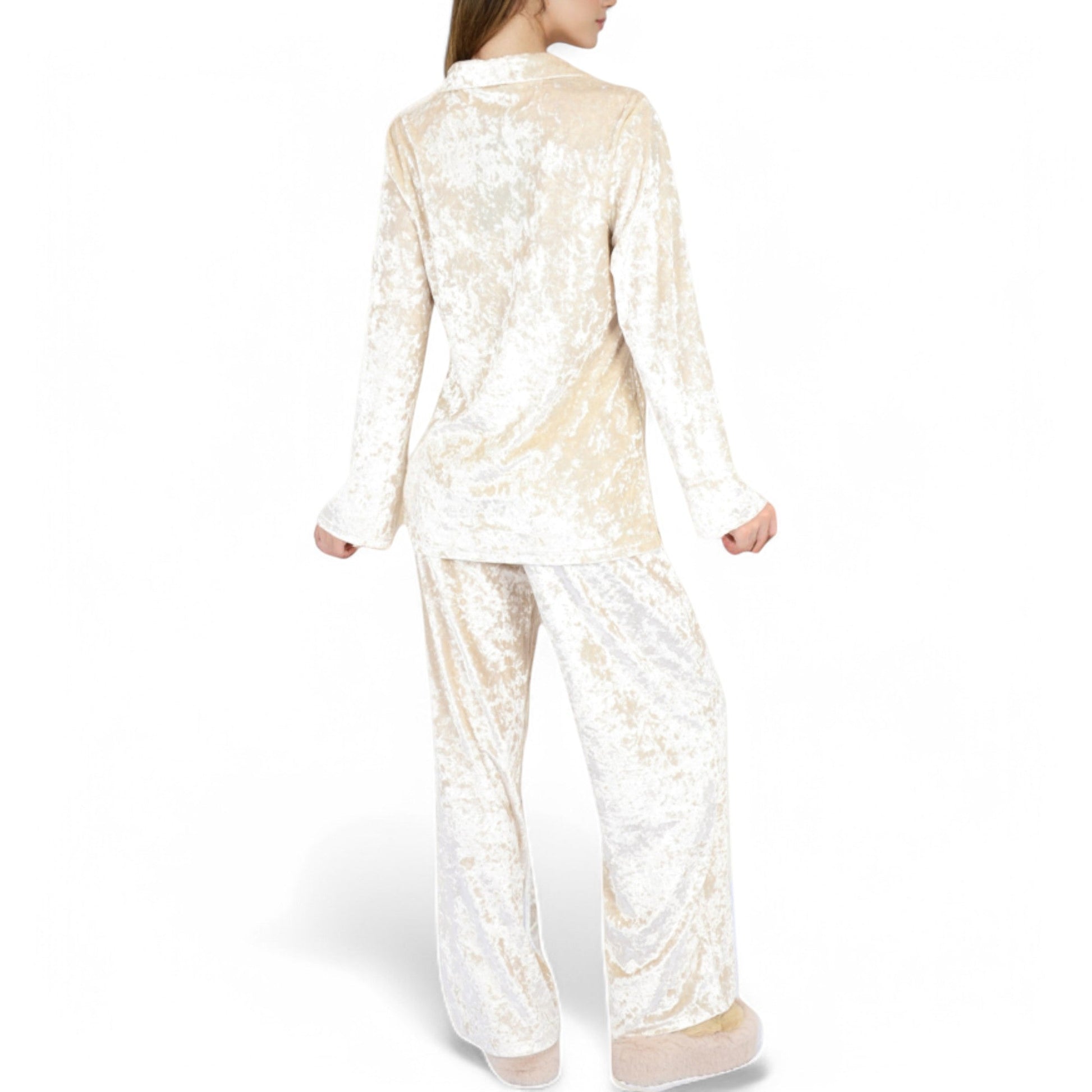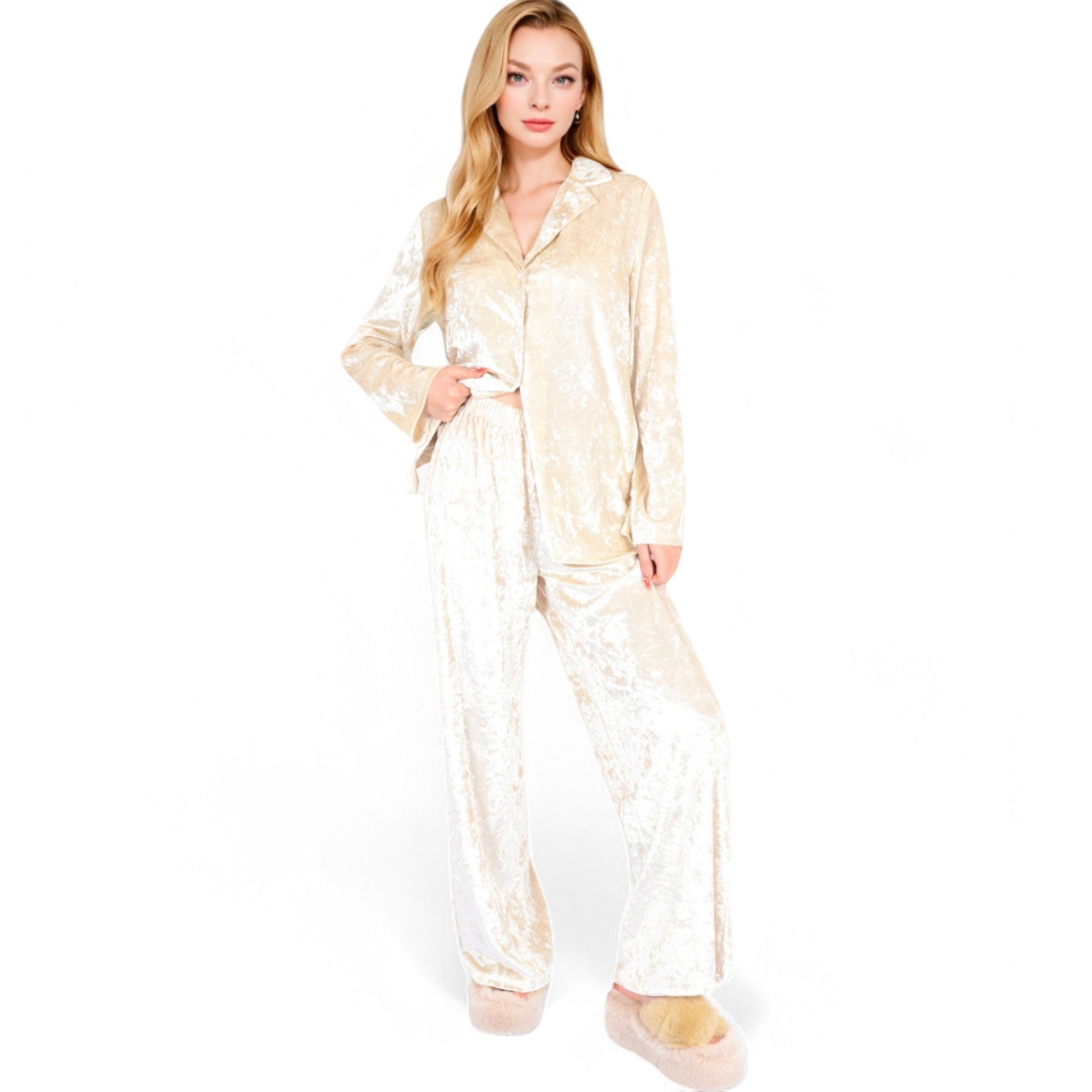 Crushed Velvet Lounge Set with Button-Up Long Sleeve Top and Wide-Leg Pants