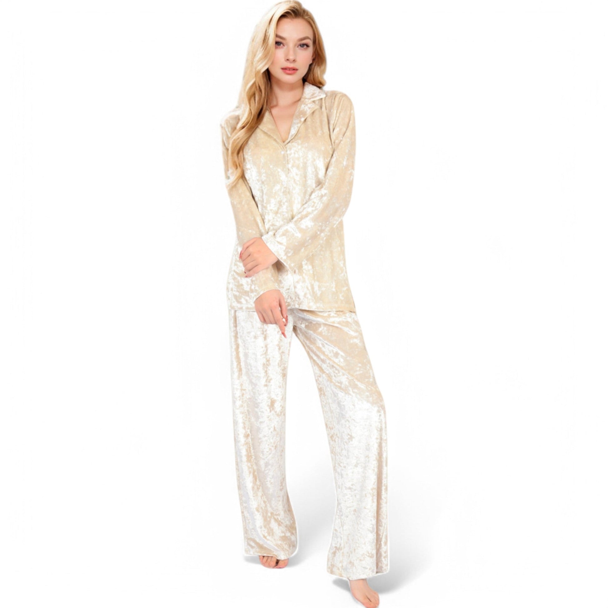 Anna-Kaci Women's crushed velvet lounge set exudes elegance and luxury with its soft, textured fabric and timeless design. The set includes a button-up long sleeve top with a notched collar and relaxed wide-leg pants for ultimate comfort. Crafted from lightweight, smooth velvet, its perfect for lounging in style or making a statement at home. Elevate your loungewear with this sophisticated and versatile set.