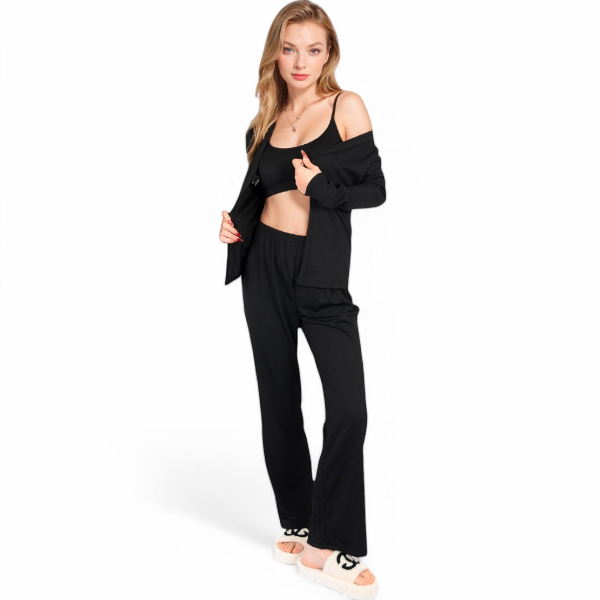 Ribbed Knit Lounge Set with Open Front Cardigan, Bralette, and Wide-Leg Pants