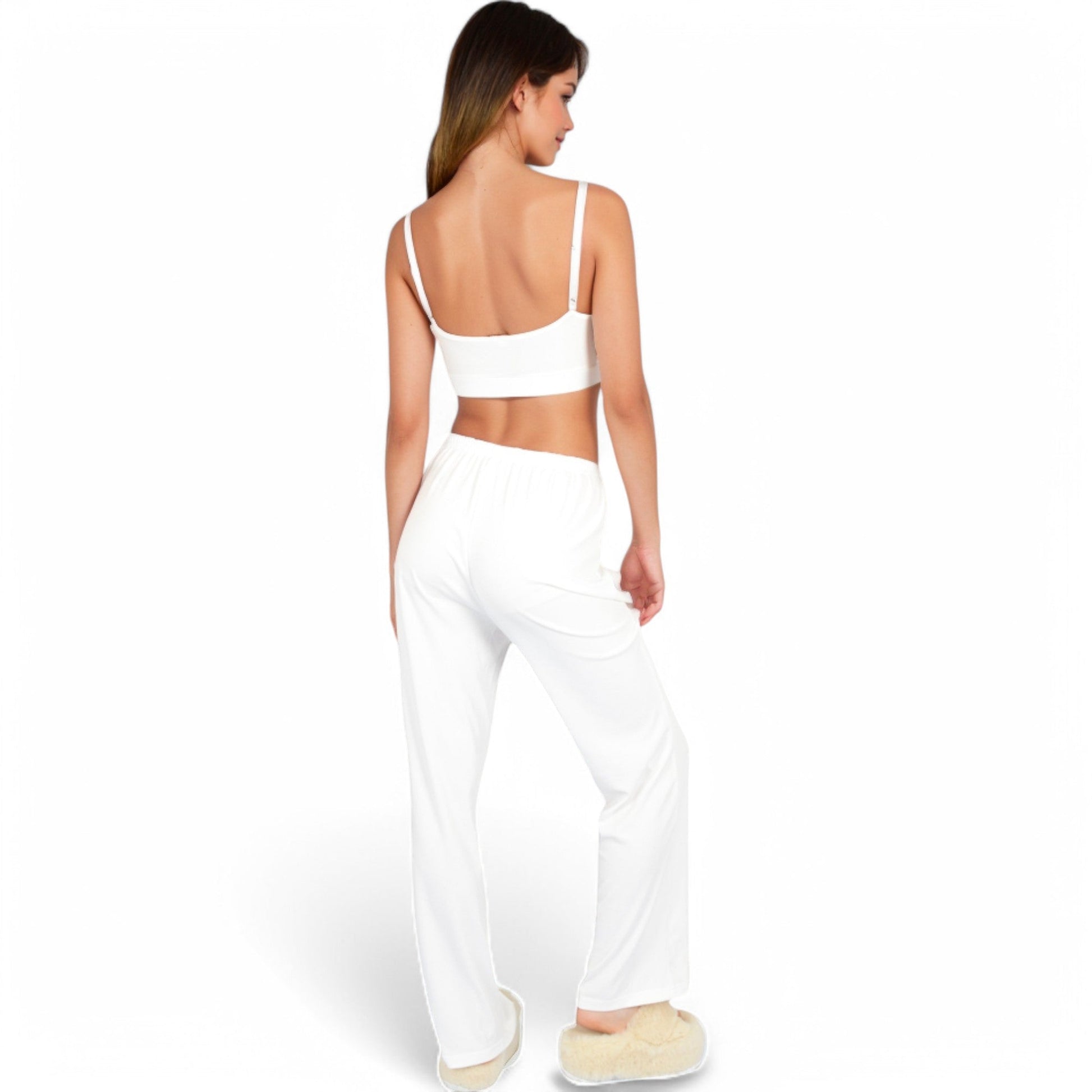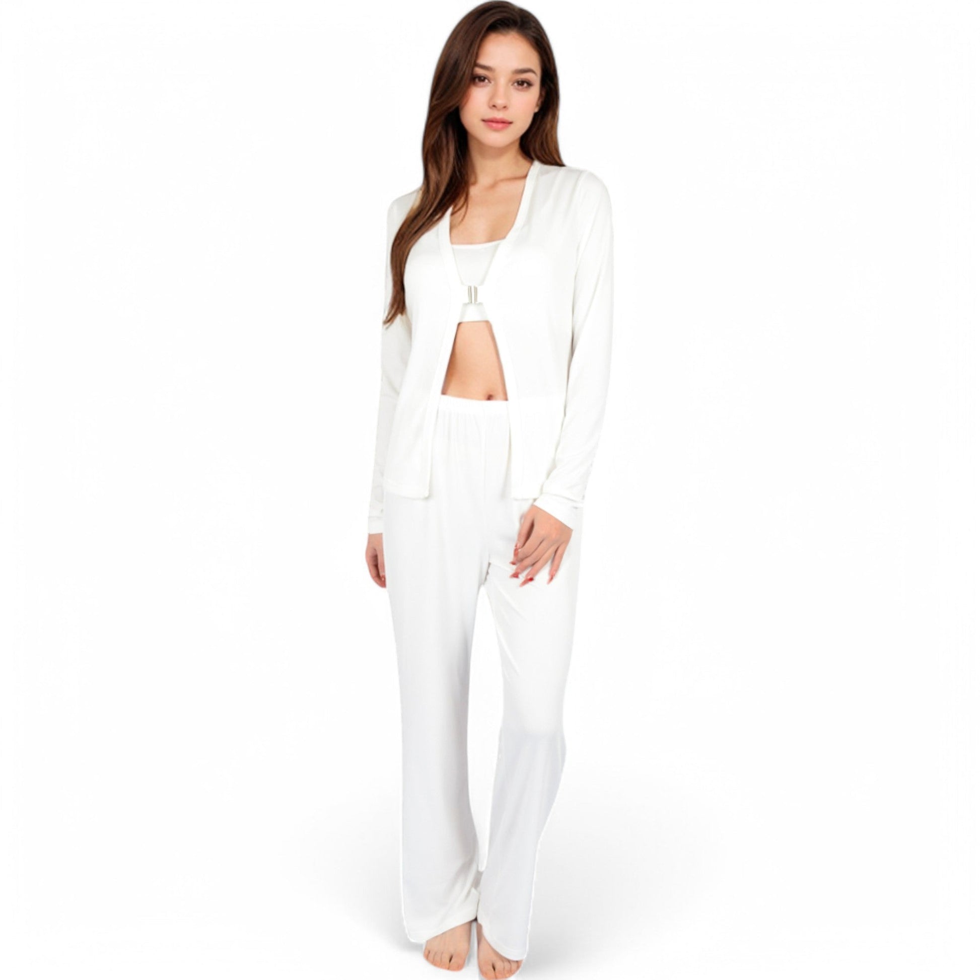 Anna-Kaci Women's lounge set combines ultimate comfort with versatile style. This ribbed knit three-piece set includes a lightweight open-front cardigan, a fitted bralette, and high-waist wide-leg pants for a chic and coordinated look. Crafted from soft, breathable fabric, this set is perfect for lounging at home or layering for casual outings. Elevate your loungewear collection with this cozy and stylish ensemble.