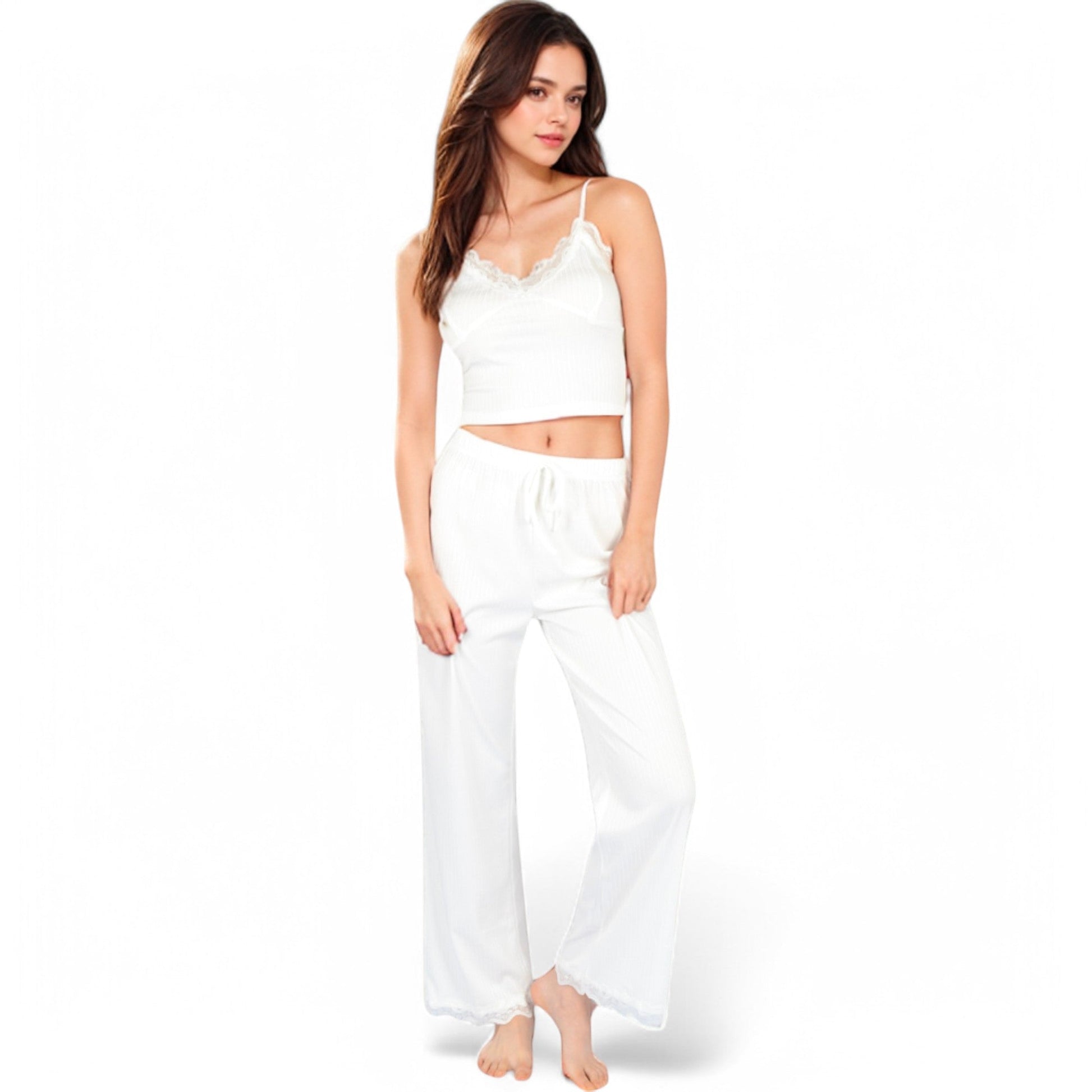 Relax in style with the Anna-Kaci Women's Lace Trim Ribbed Knit Pajama Set. Featuring a delicate lace-trimmed neckline and soft ribbed knit fabric, this set is designed for ultimate comfort and elegance. The camisole top pairs beautifully with the adjustable drawstring pants for a secure and relaxed fit. Perfect for lounging at home or enjoying a cozy night in, this versatile pajama set adds a touch of sophistication to your loungewear collection.