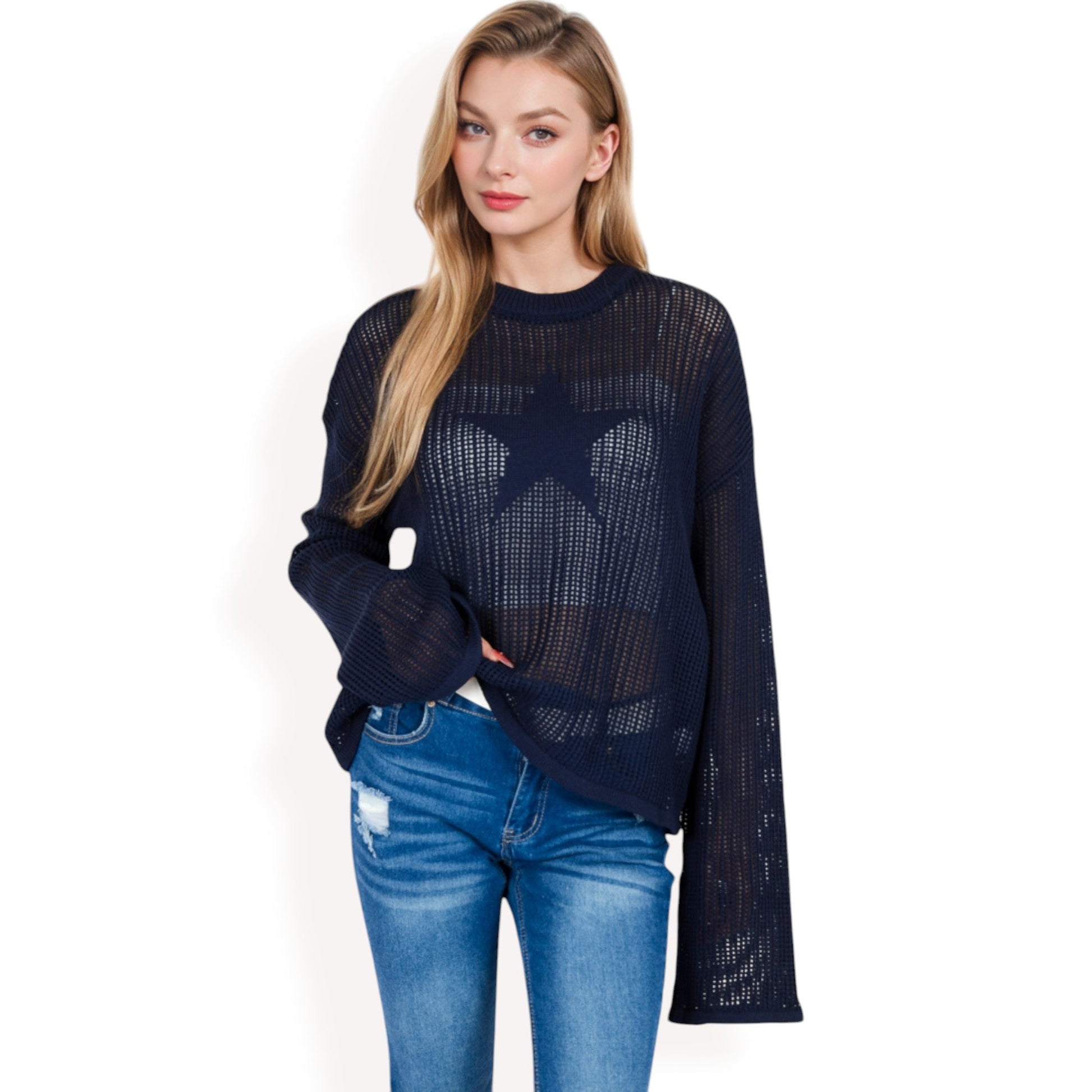 Oversized Star Cutout Knit Pullover Sweater with Drop Shoulder Design