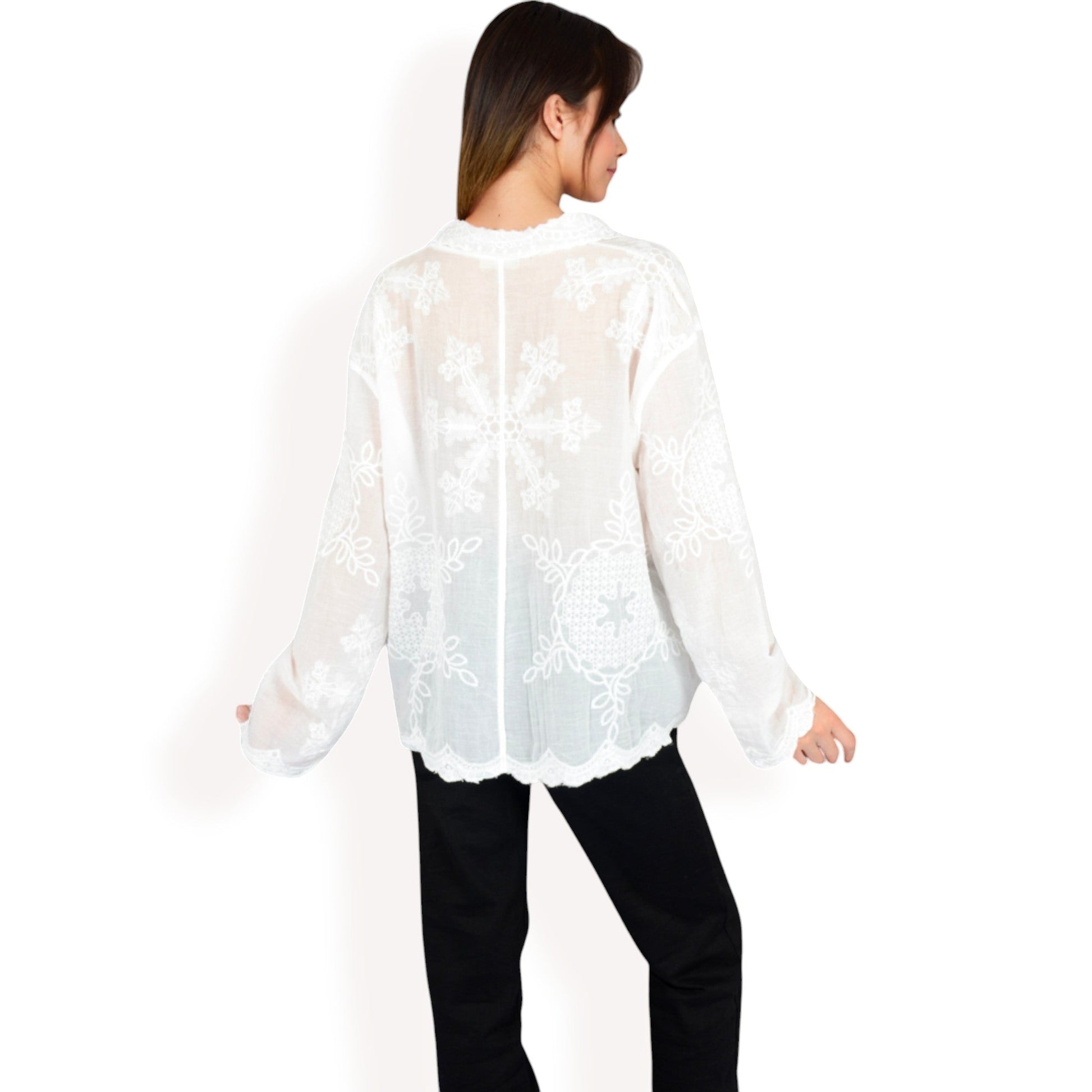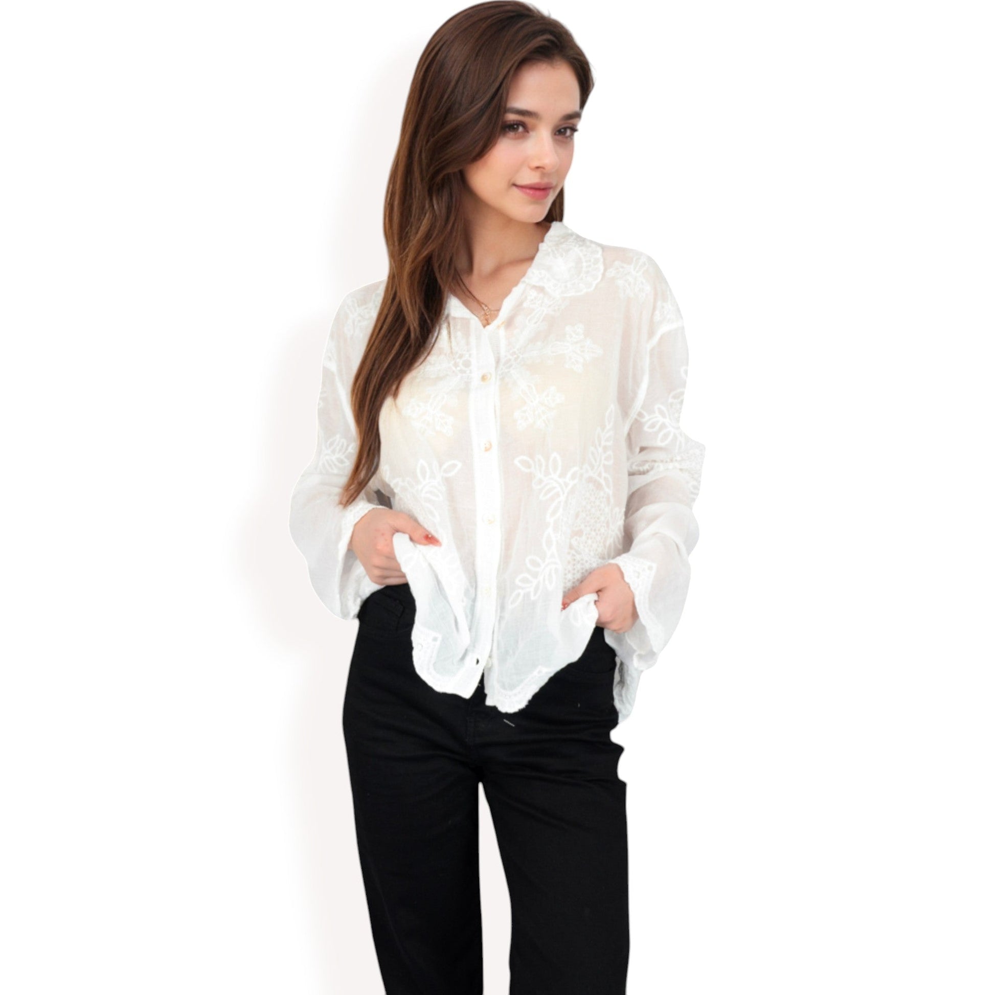 Anna-Kaci Women's embroidered sheer blouse combines sophistication with delicate details for a timeless appeal. Featuring intricate floral embroidery, a scalloped hem, and a classic button-up design, this blouse is a versatile wardrobe essential. Crafted from lightweight and breathable fabric, it offers a relaxed yet polished fit. Elevate your look by pairing it with jeans, skirts, or tailored pants for effortless elegance.