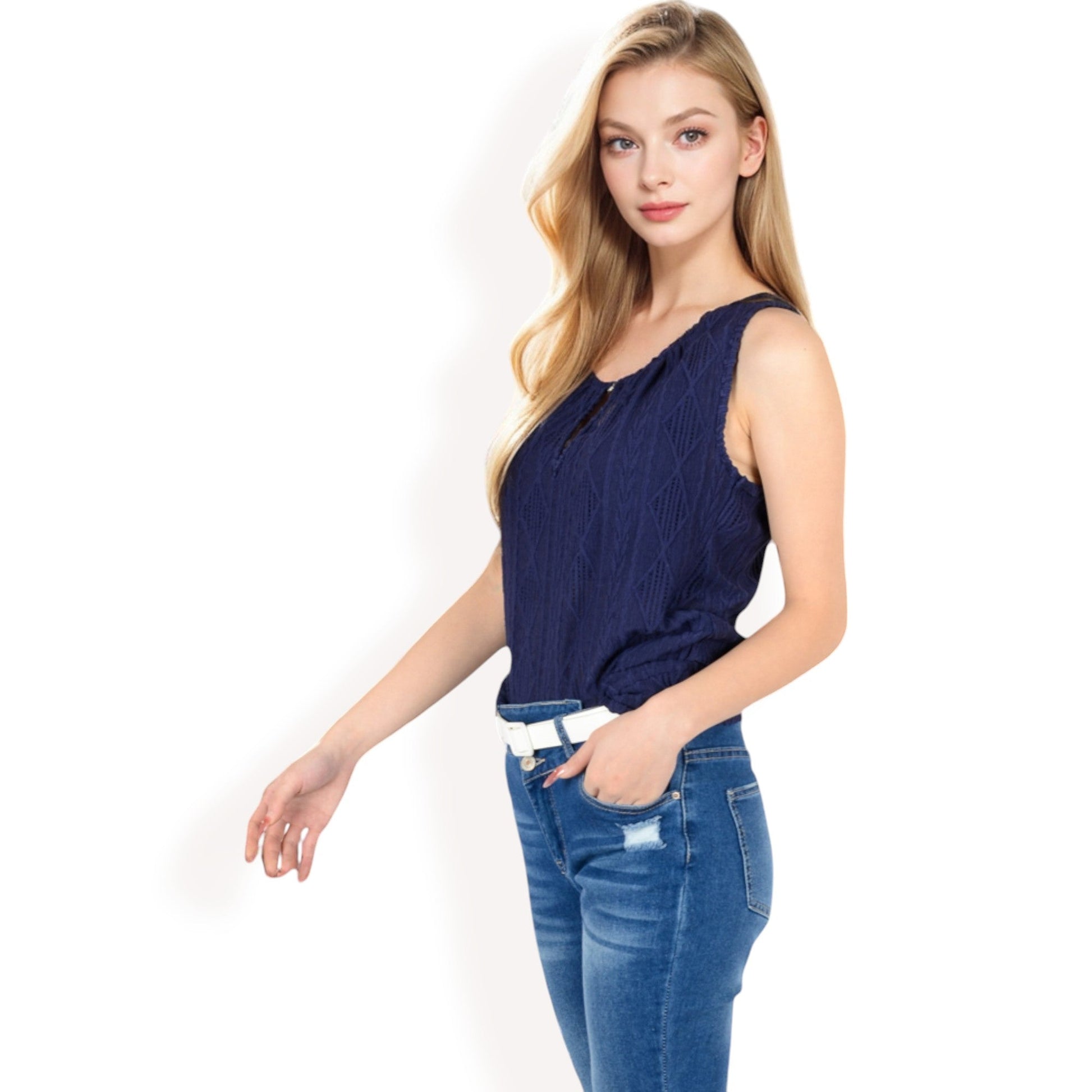 Sleeveless Blouse with Keyhole Neckline and Geometric Eyelet Design