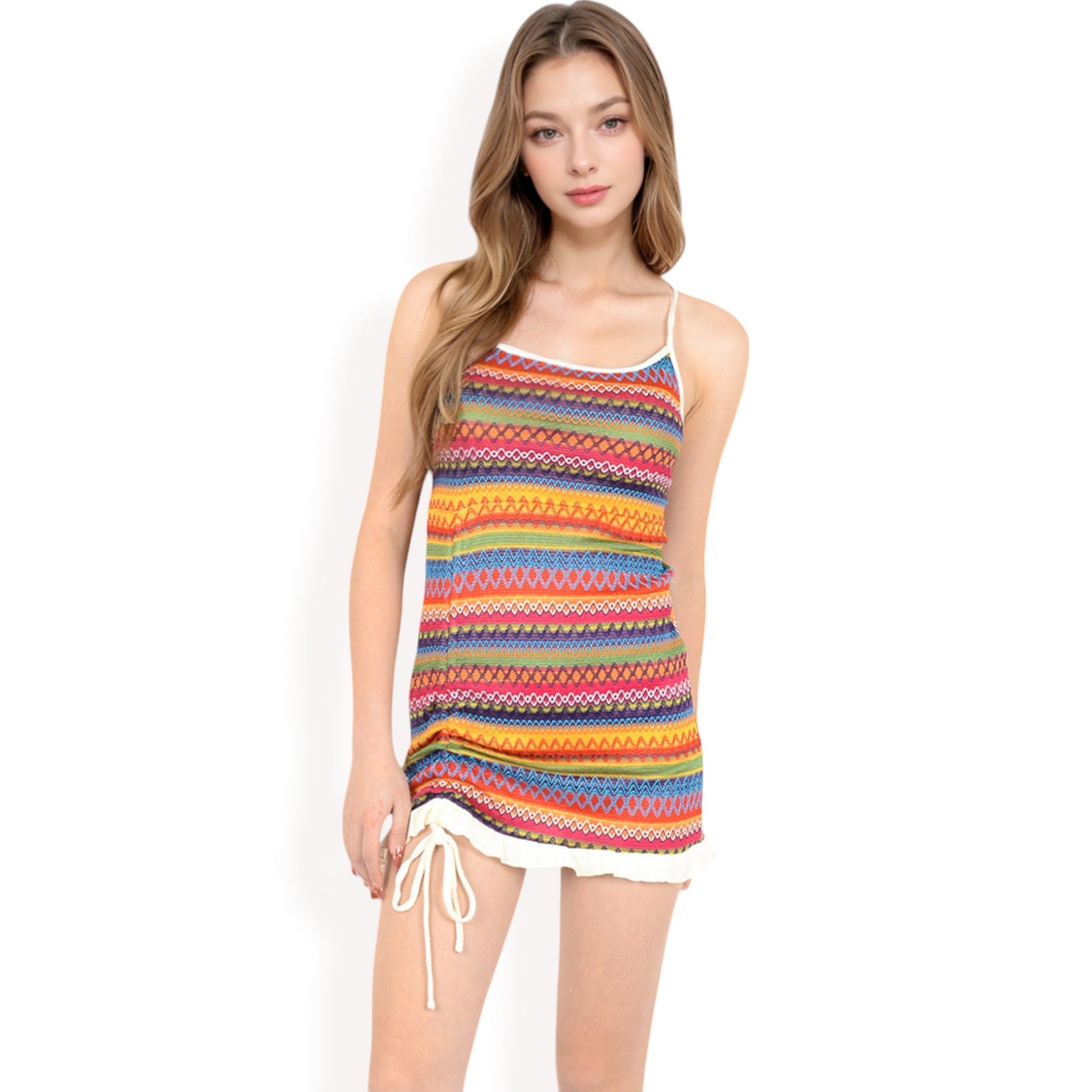 The Anna-Kaci Women's Knit Mini Dress showcases a playful and colorful striped pattern, perfect for adding a cheerful touch to your wardrobe. Designed with slim spaghetti straps and a square neckline, this dress combines comfort with modern style. The adjustable drawstring ruching along the side allows for customizable length and fit, adding a flirty detail. Crafted from soft knit fabric, this mini dress is lightweight and breathable, ideal for warmer days or layered for cooler evenings.