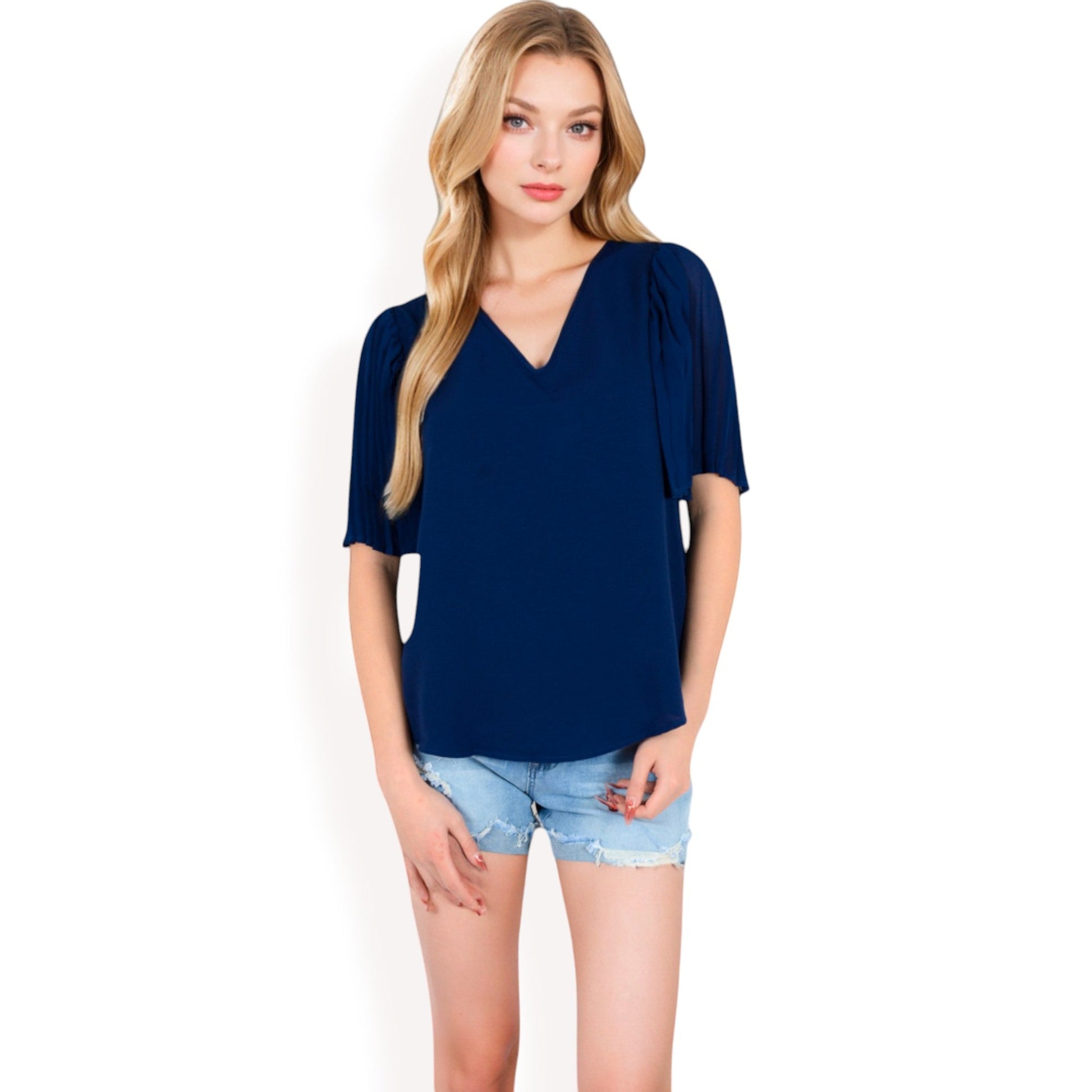 The Anna-Kaci Women's V-Neck Blouse offers a chic and airy design for effortless style. Featuring delicate pleated chiffon flutter sleeves, this blouse adds a graceful touch to your wardrobe. The flattering V-neckline enhances its timeless appeal, while the lightweight fabric ensures all-day comfort. Perfect for pairing with jeans or skirts, this versatile blouse transitions seamlessly from casual outings to special occasions.