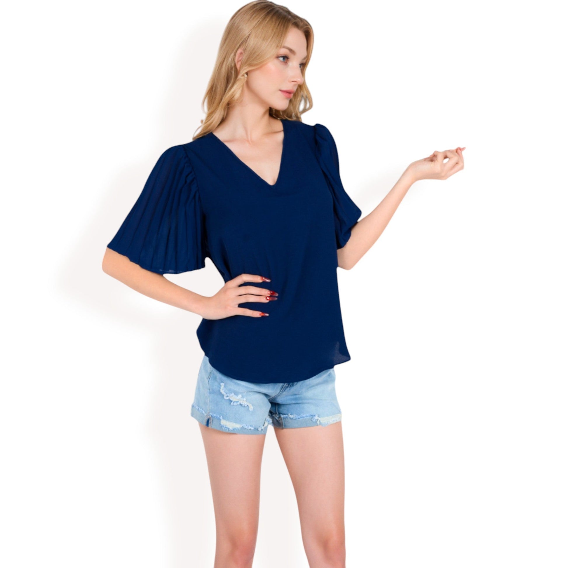 V-Neck Blouse with Pleated Chiffon Flutter Sleeves