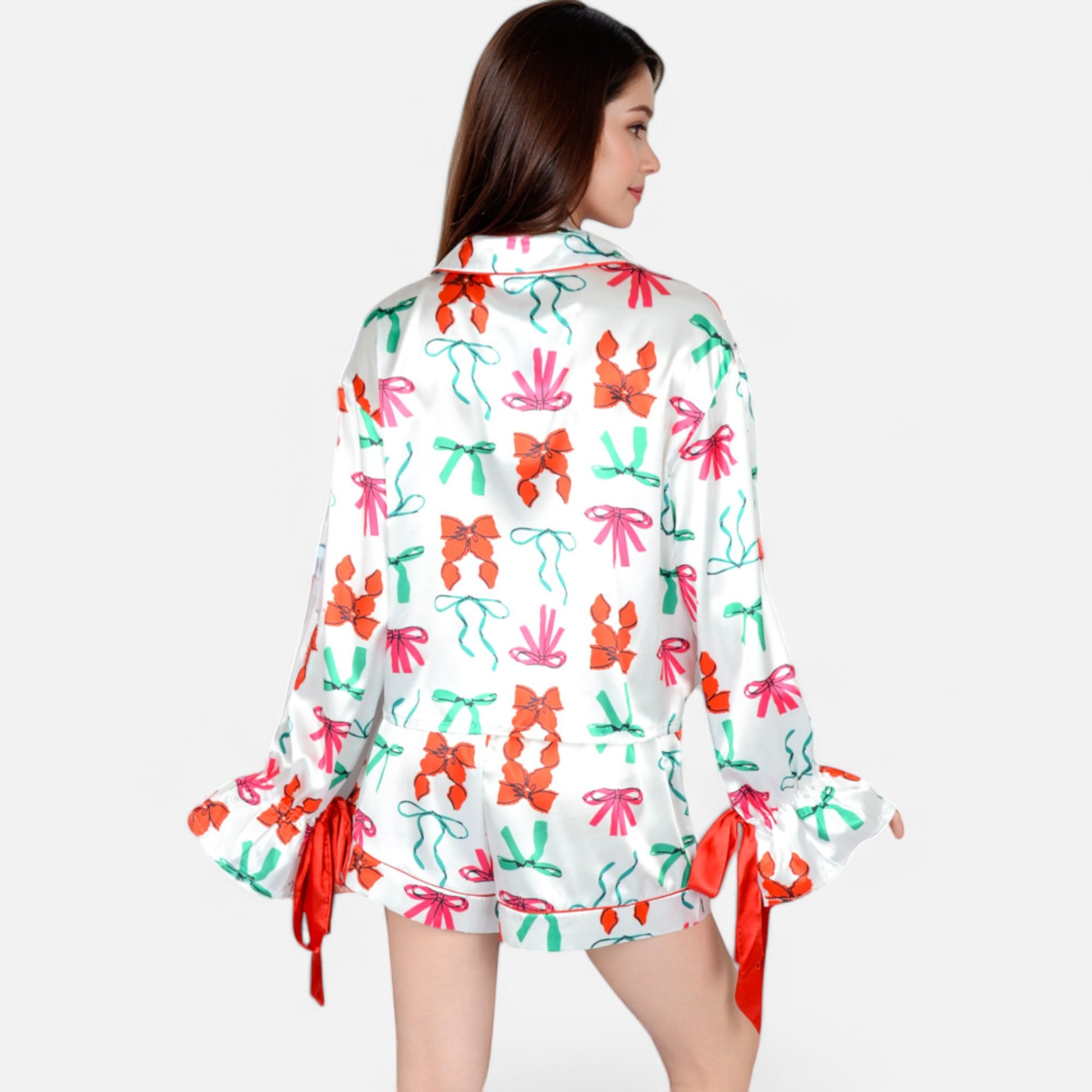 Lounge Women's Holiday Bow Print Pajama Set with Ribbon Tie Details and Button-Up Top