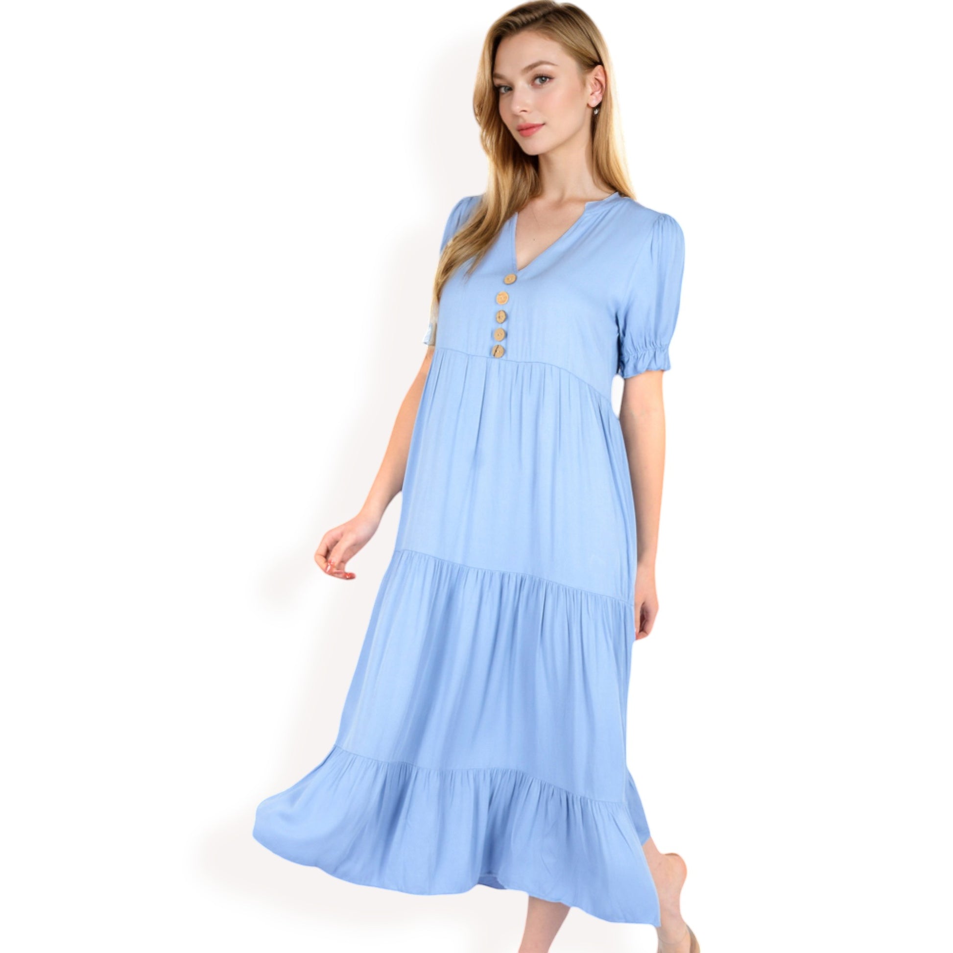 Puff Sleeve Tiered Midi Dress with Button Front Detail and Smocked Cuffs